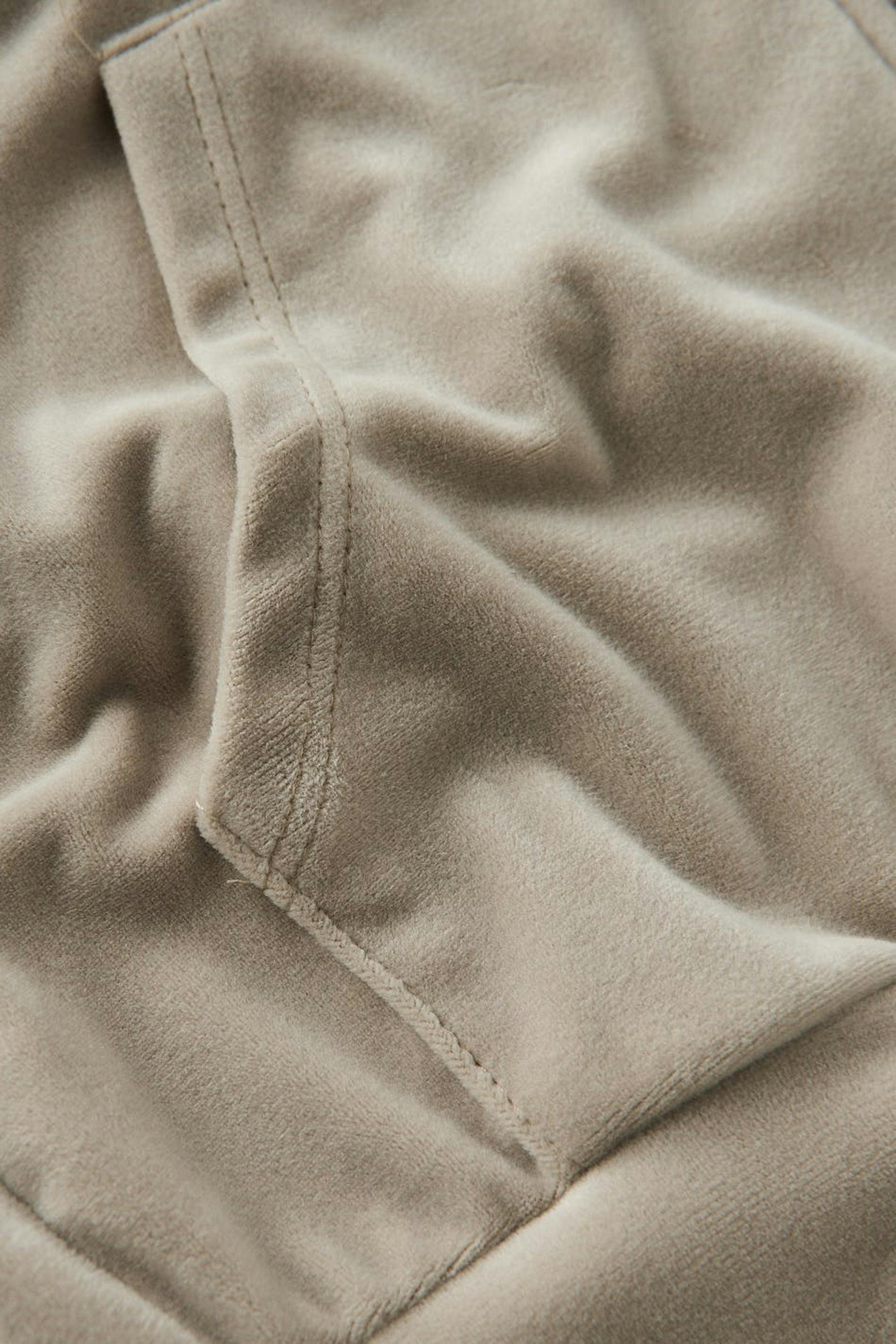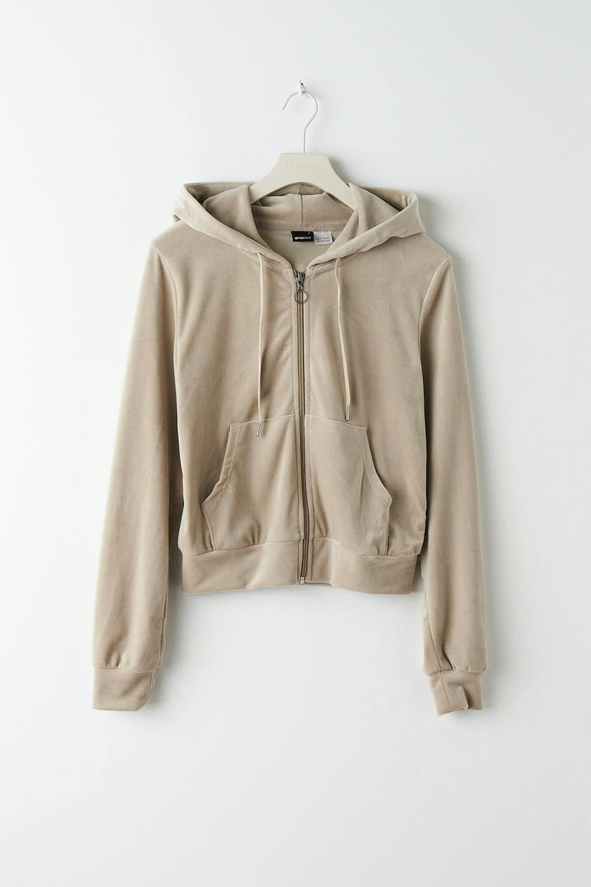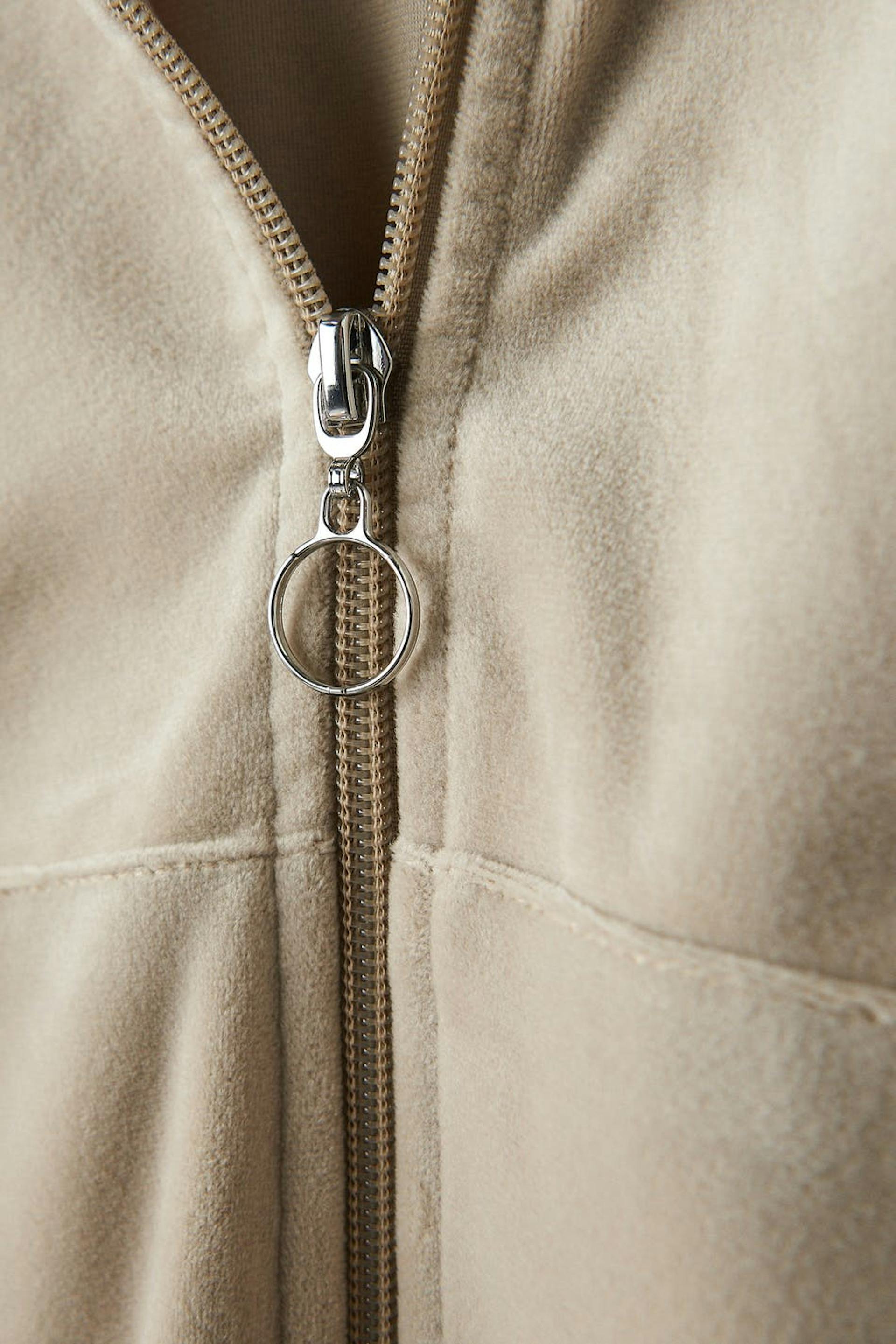 Soft hoodie in velour with a regular fit. The hoodie is beige and has a lined hood. It has pockets on the sides and a zip closure with a metal ring and a drawstring at the hood.