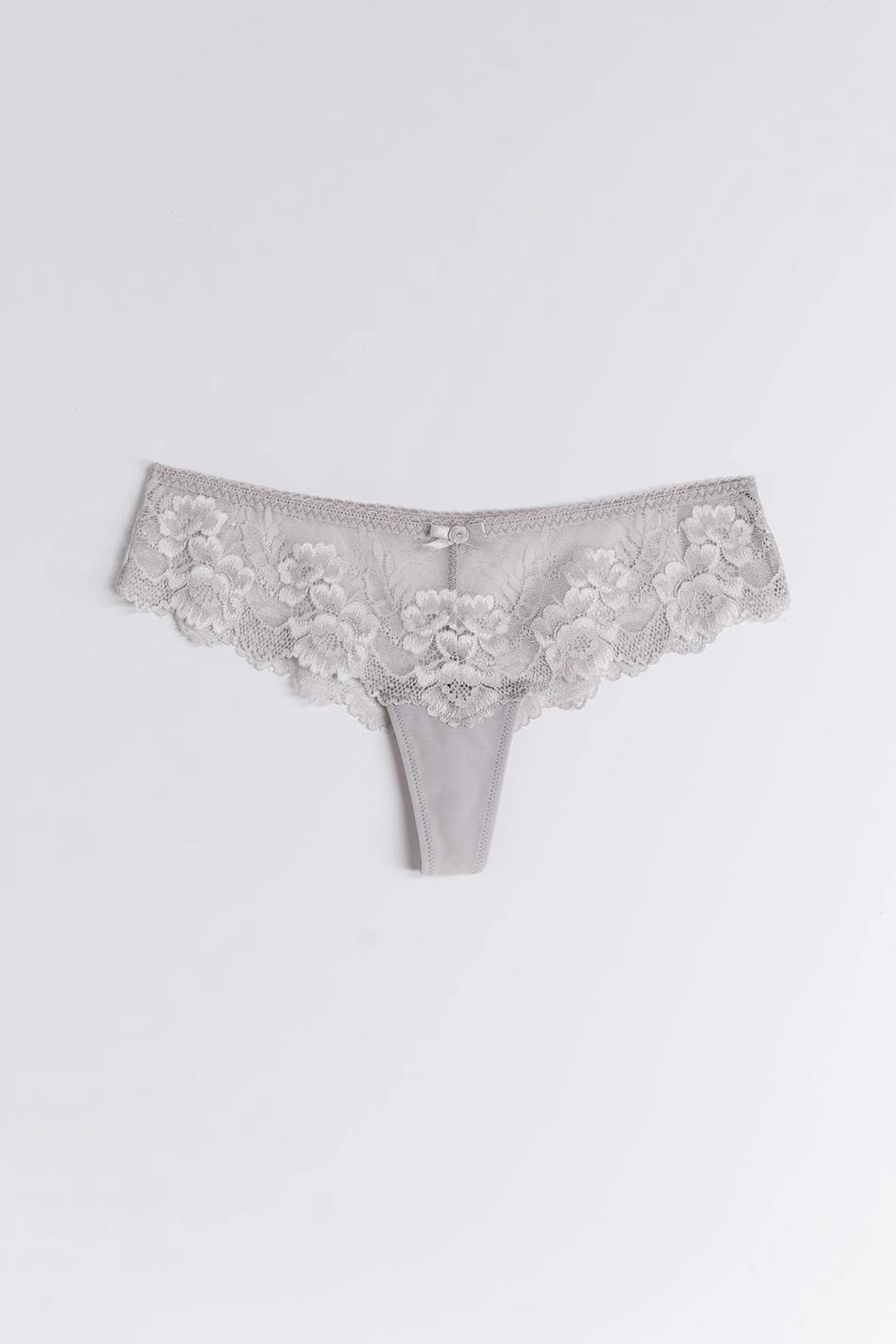 Soft thongs in lace with a bow detail at the front. The thongs are blue and have a crotch lining in cotton.