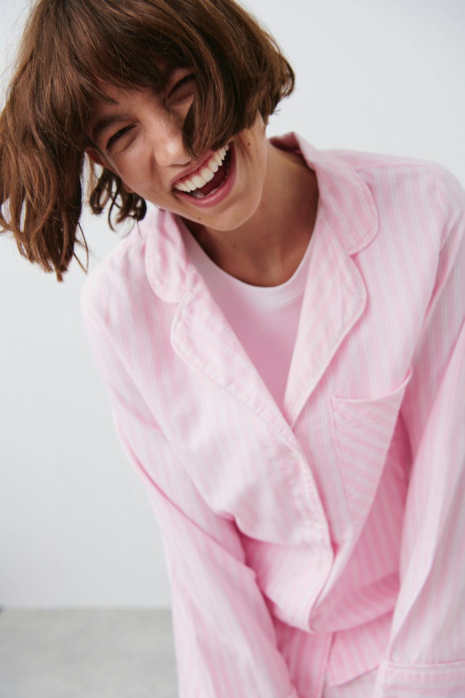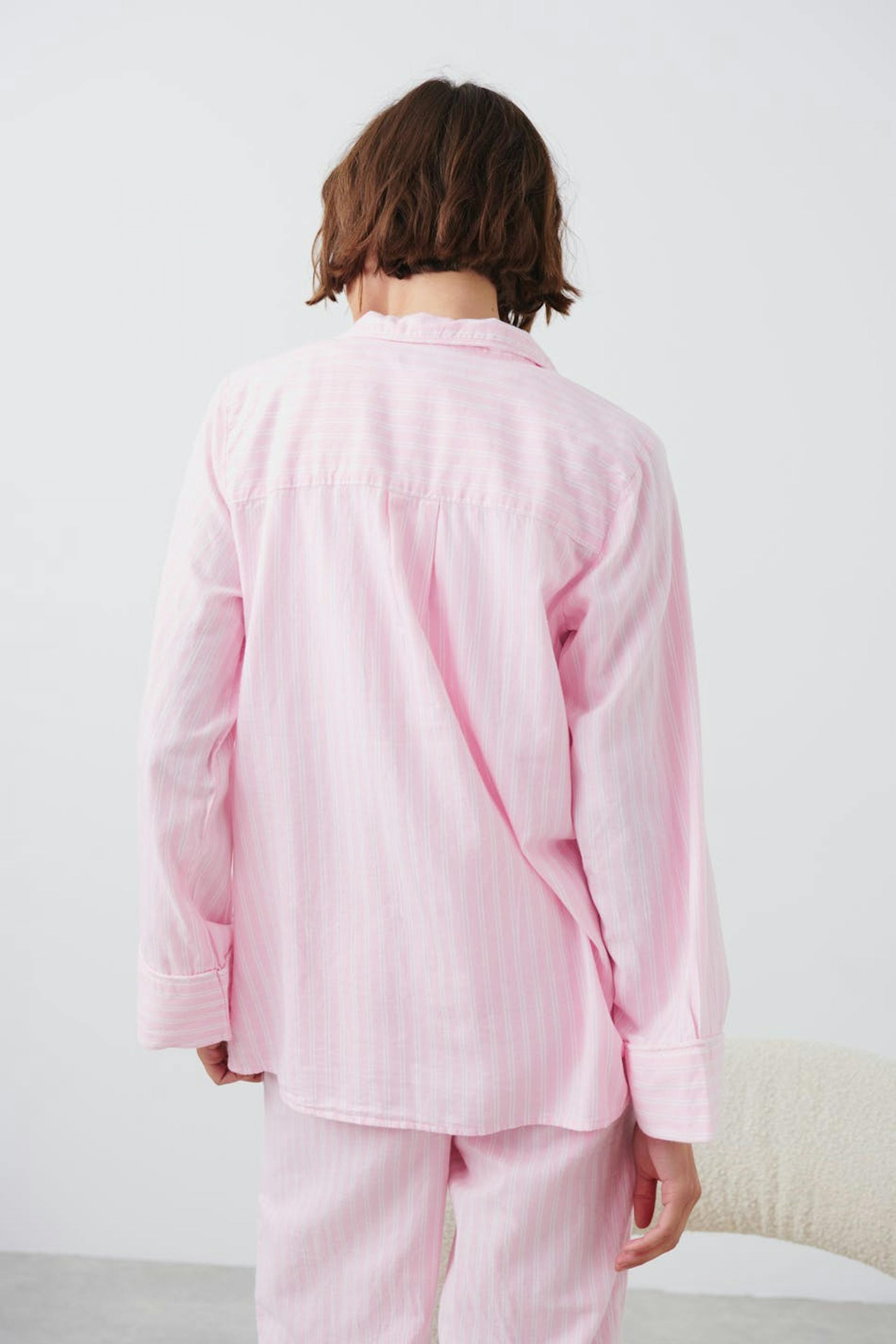 Striped pyjama shirt in flannel with oversize fit. The shirt is pink and has chest pocket on the left side. It has collar and long sleeve with button and cuff.