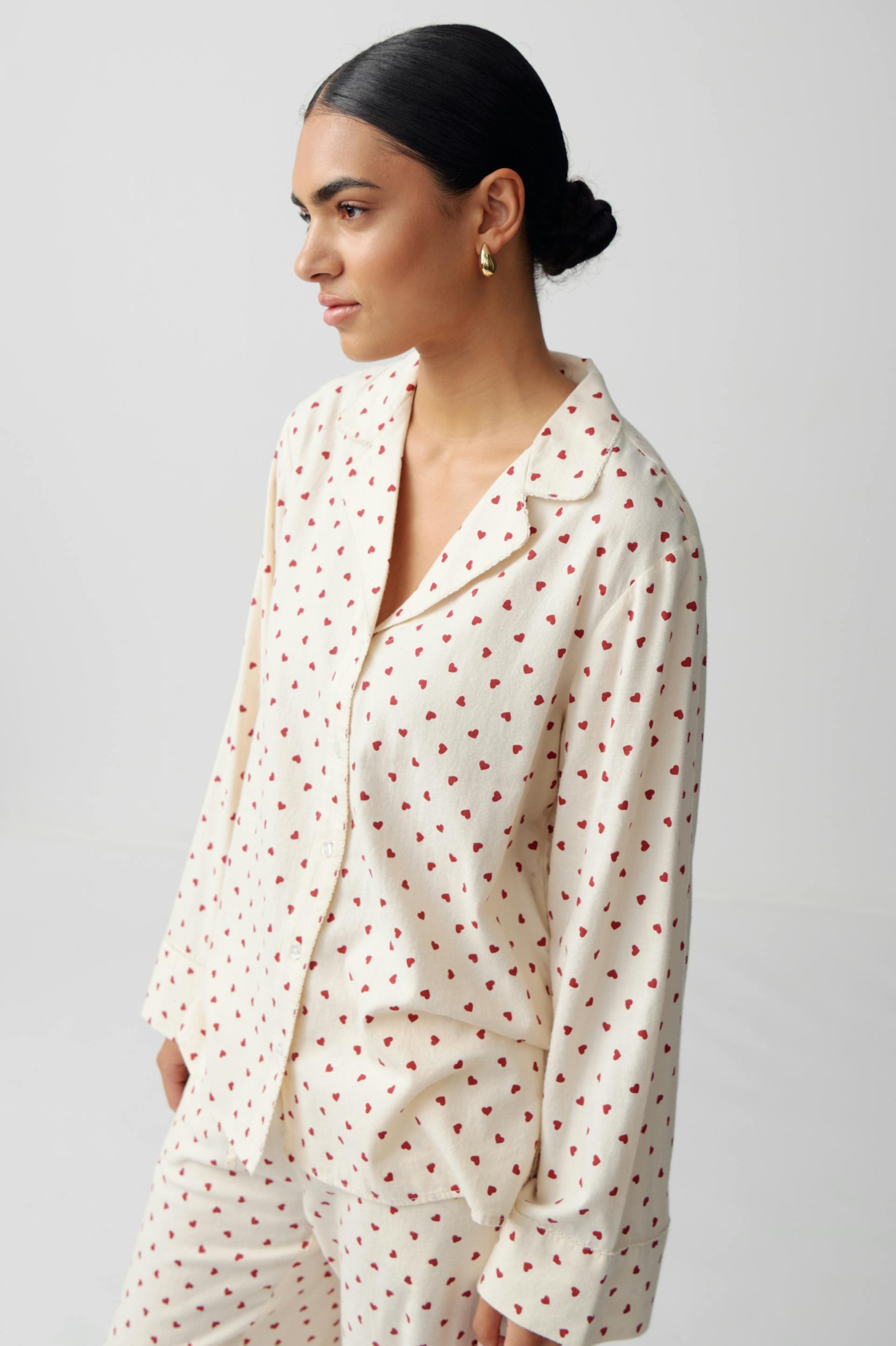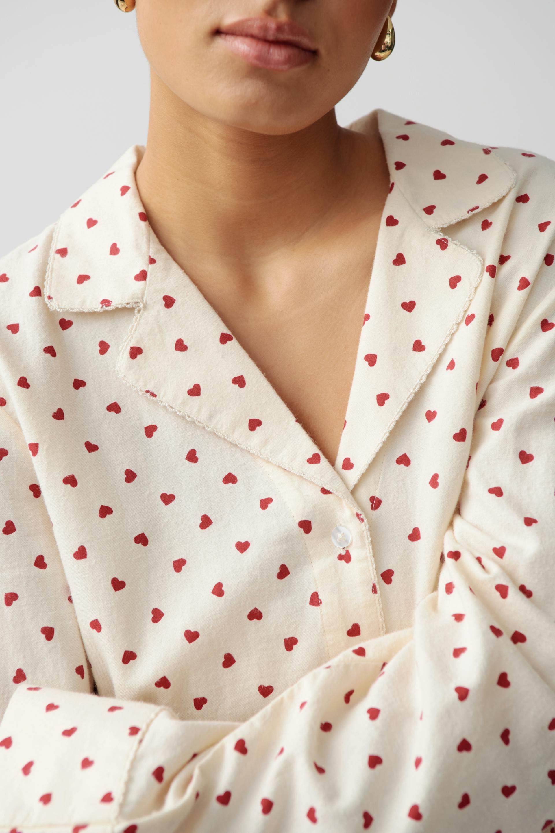 Pyjama shirt with small hearts. The shirt is white and has oversize fit. It has buttons at the front, collar and long sleeve with button and cuff.