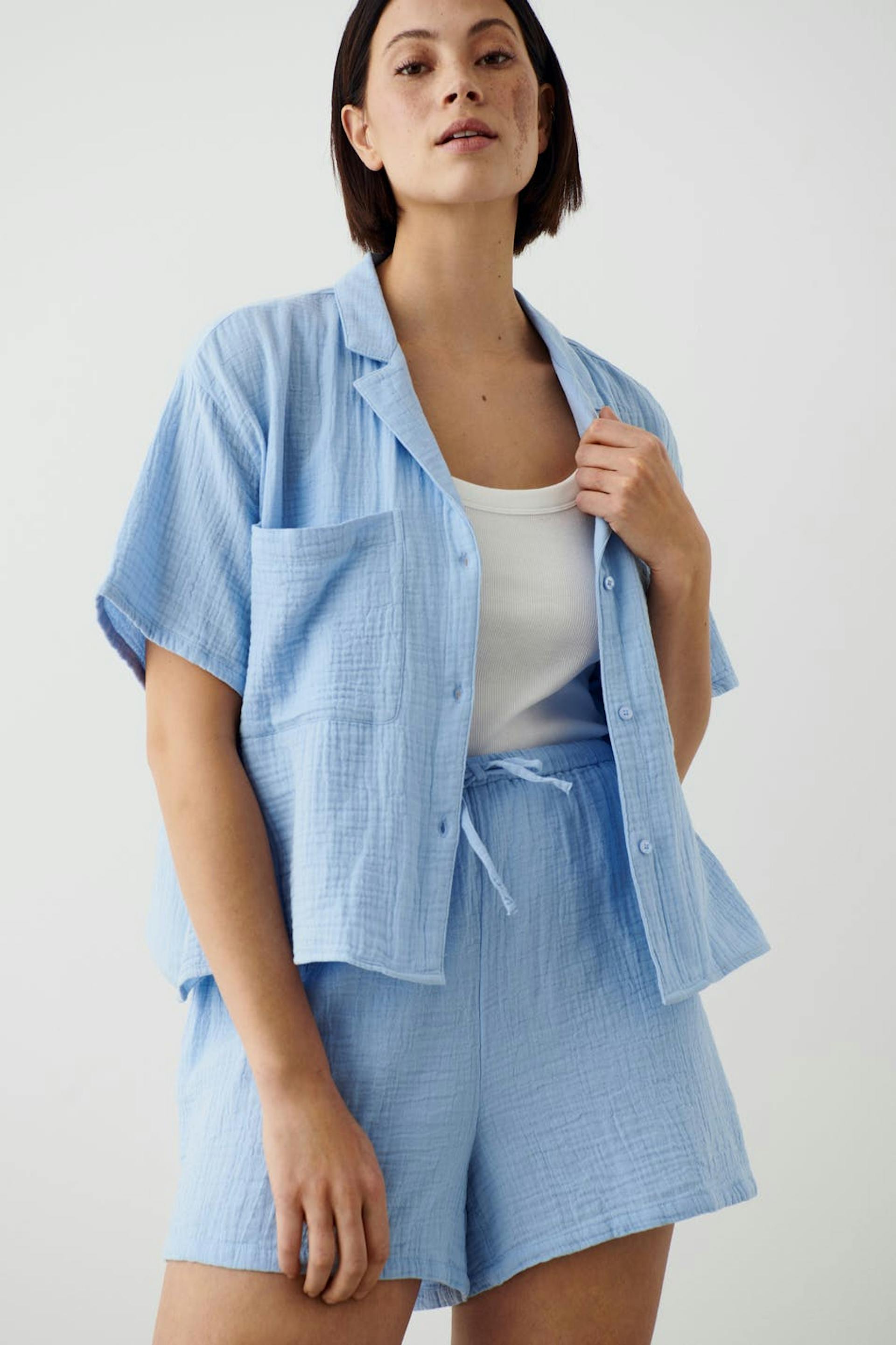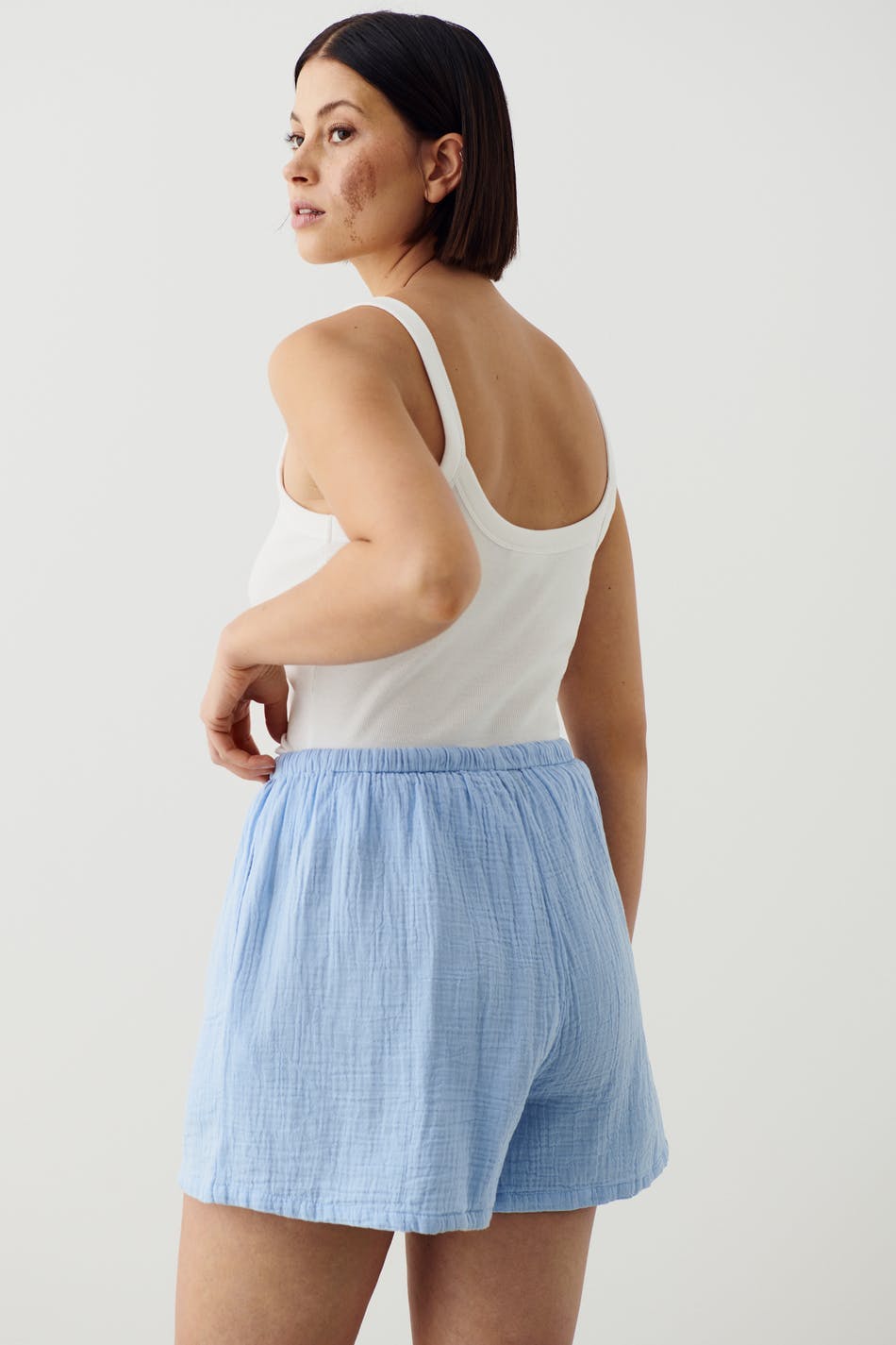 Pyjama shorts in soft cotton with structure. The shorts are blue and have elastic at the waist with self-tie in front.