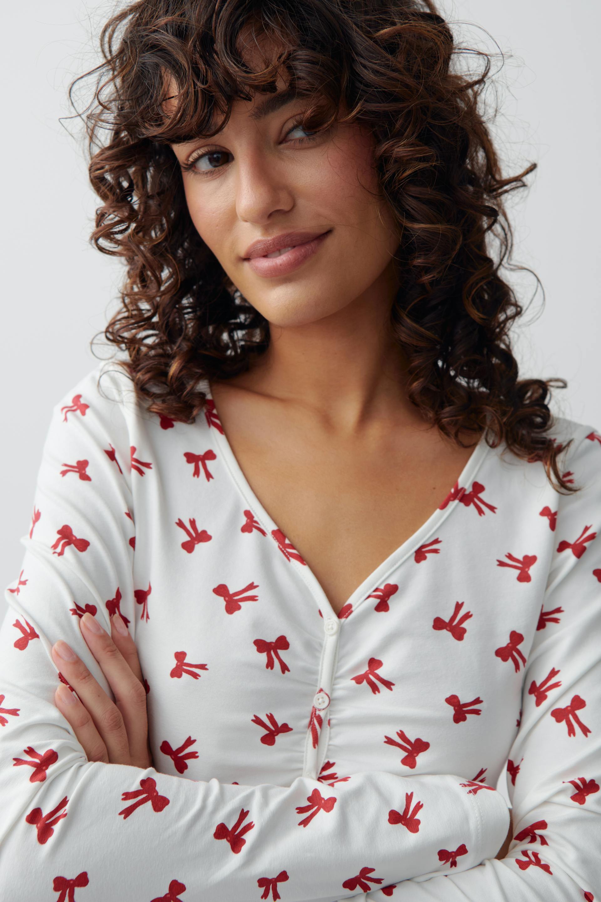 Patterned top with small bows. The top is white and has buttons at the front. It has long sleeve, v-neck, ruching at the front and regular fit.