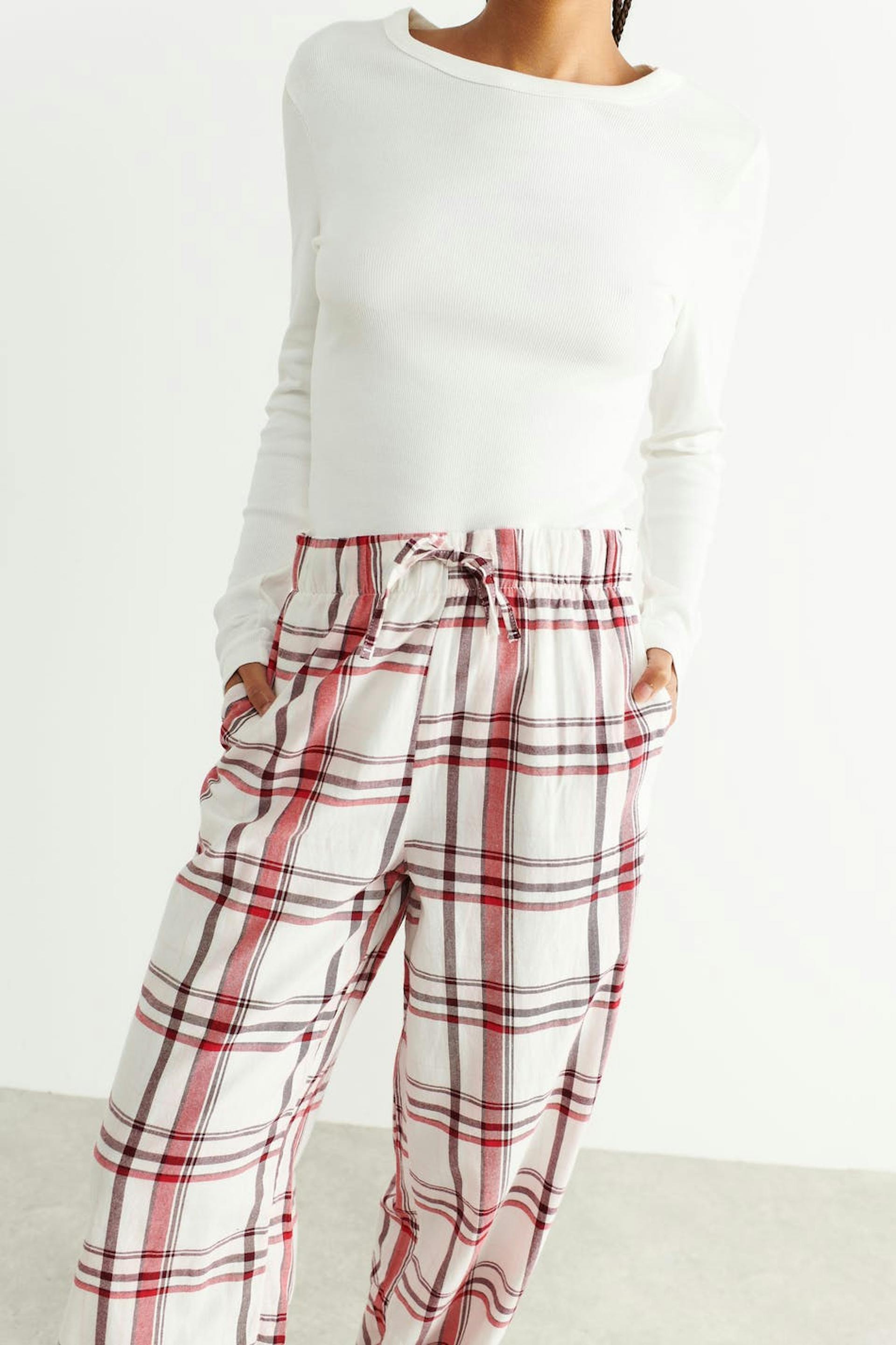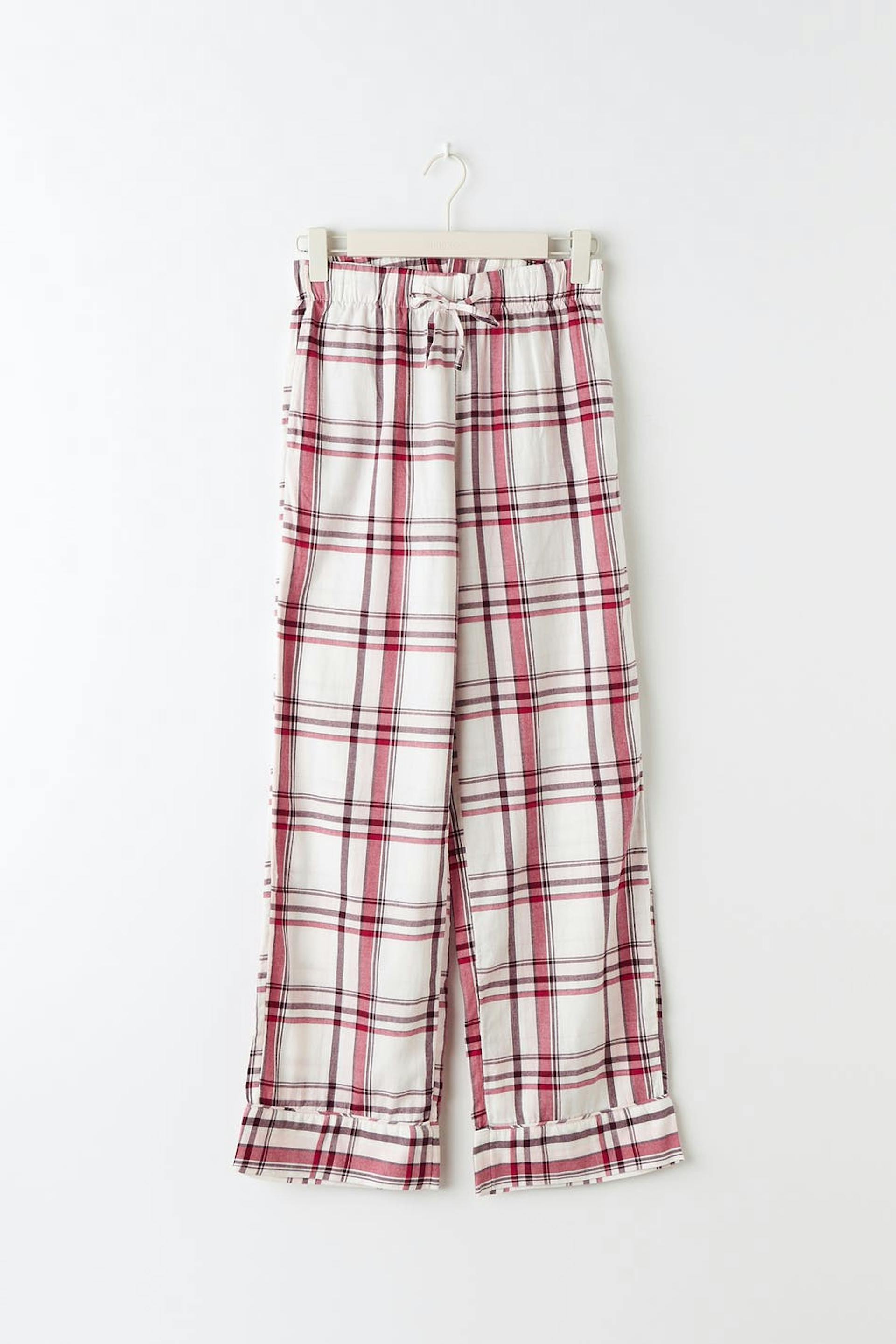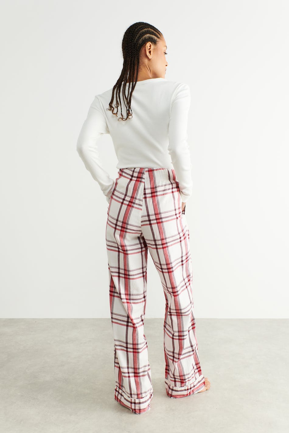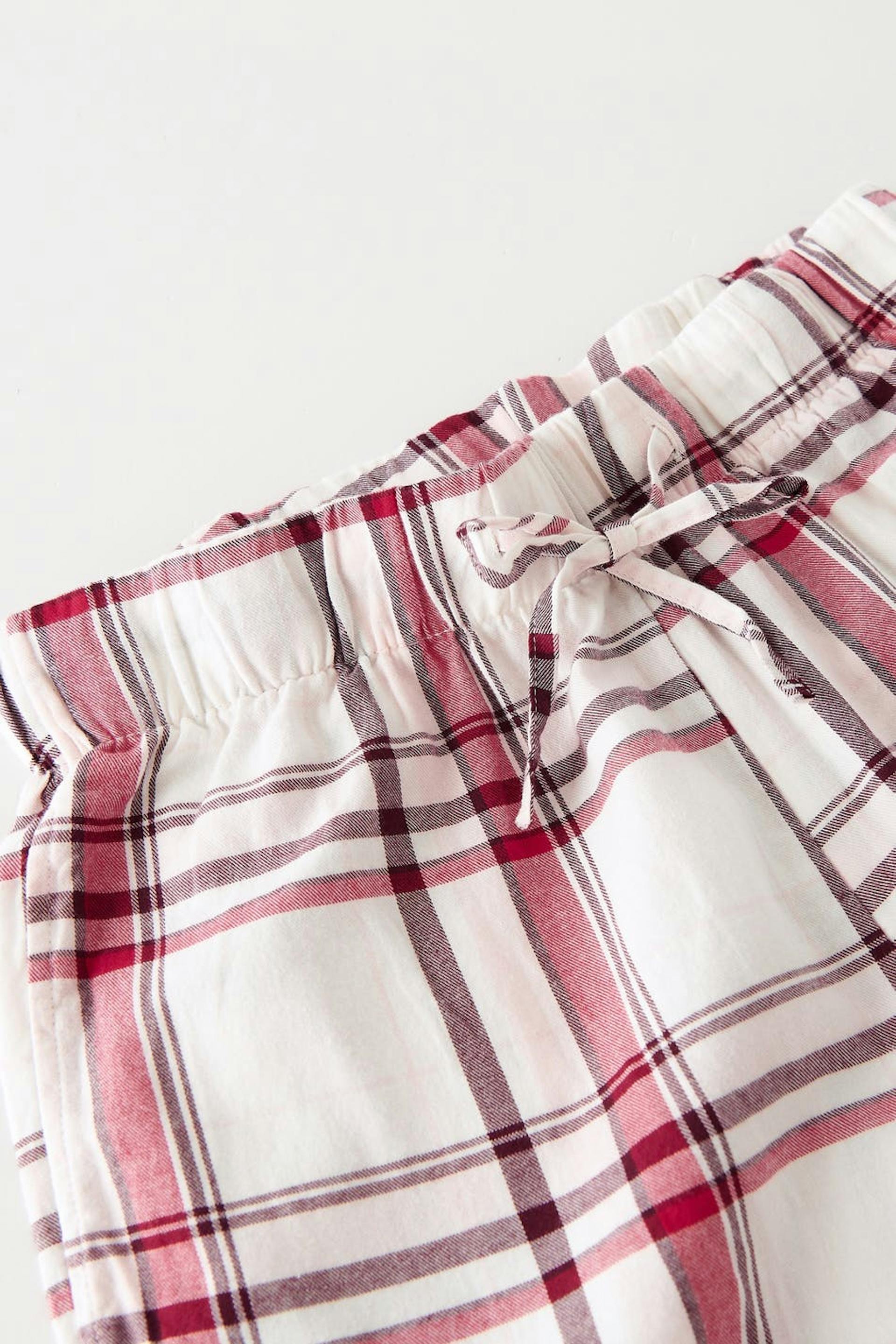 Checked pyjama tracksuit trousers in soft cotton with elastic at the waist. The pyjama tracksuit trousers are red and have self-tie drawstring at the front.