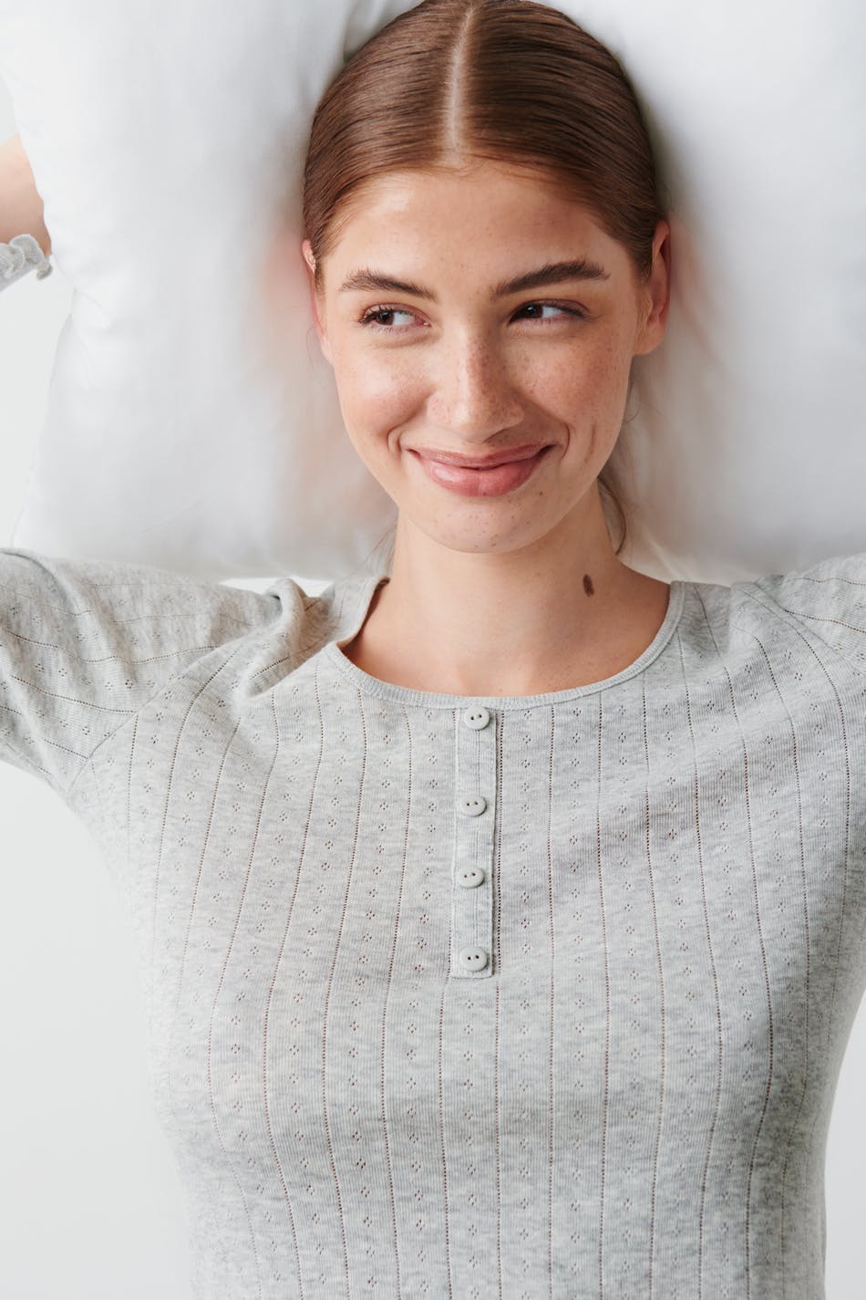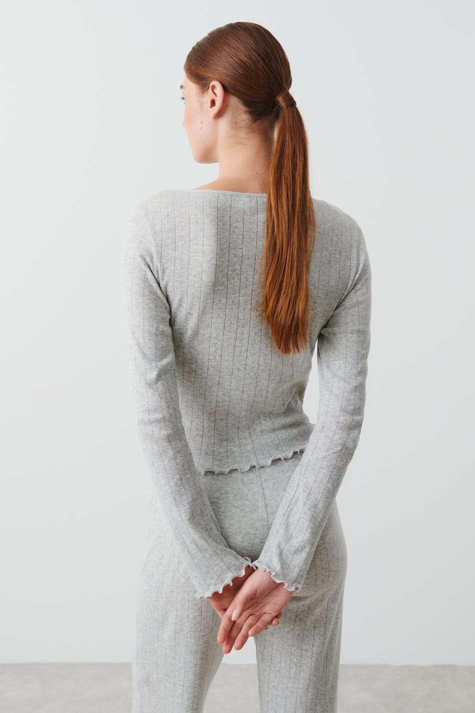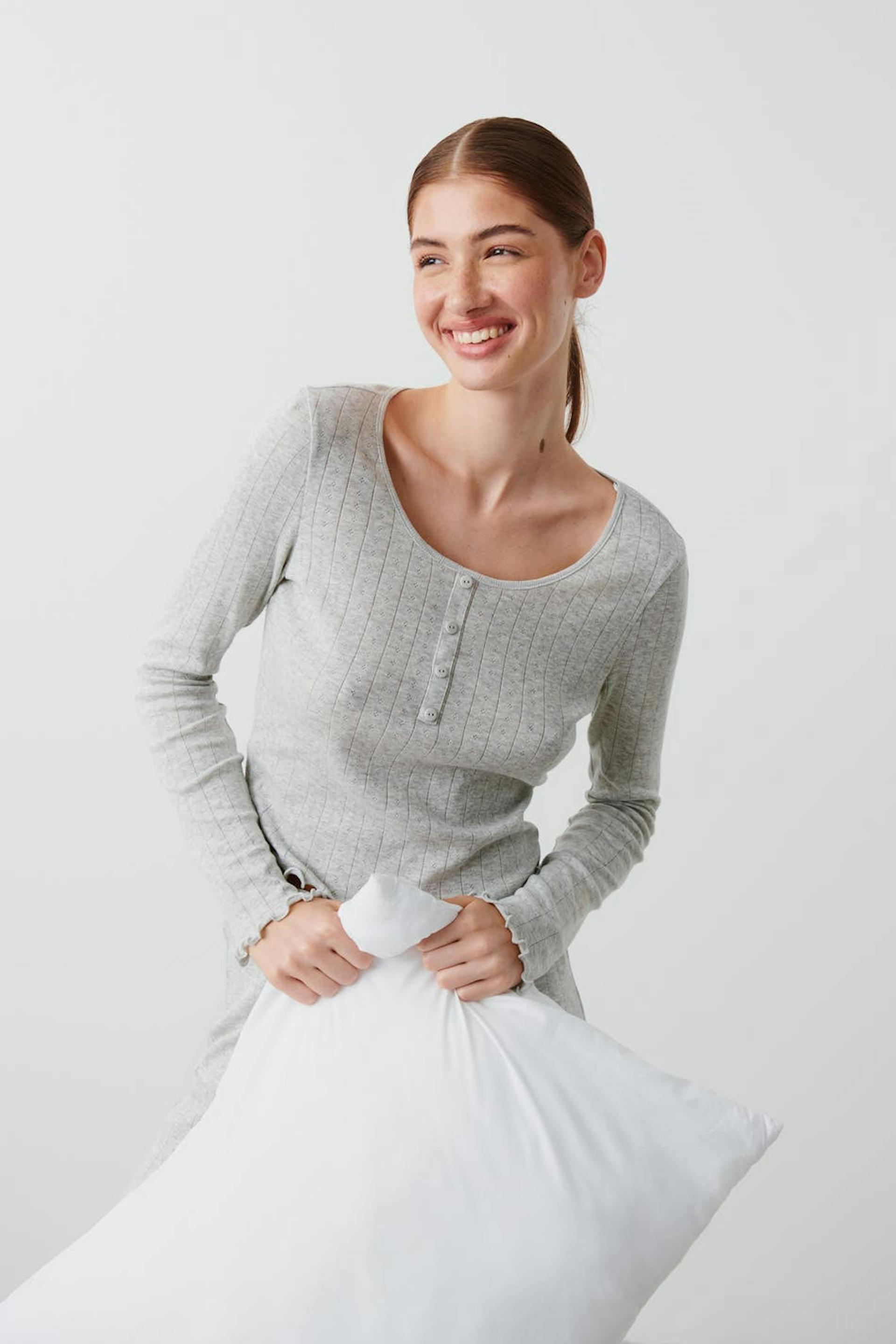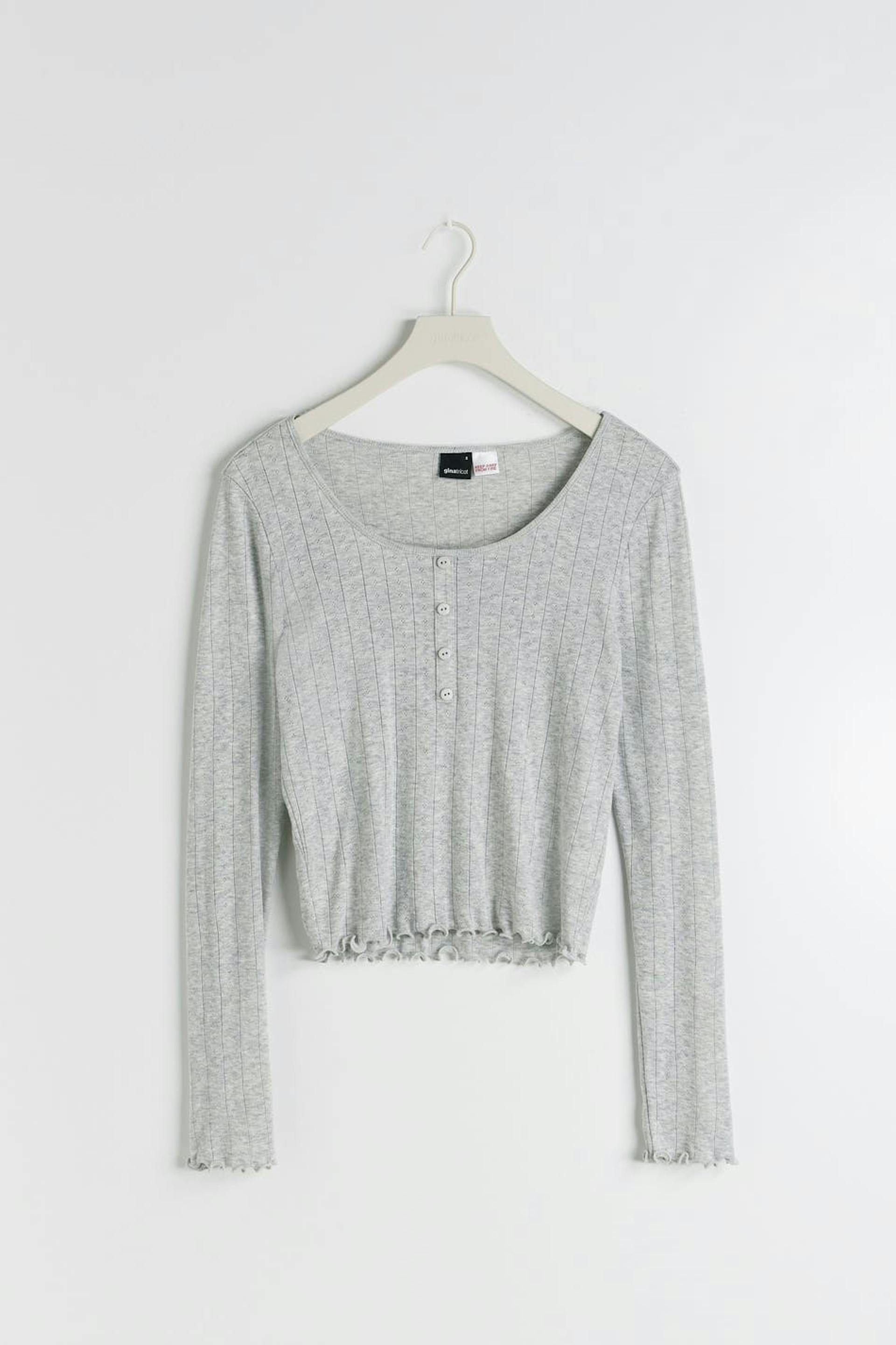 Long-sleeved top in soft cotton with buttons at the front. The top is grey and has overlocked hem.