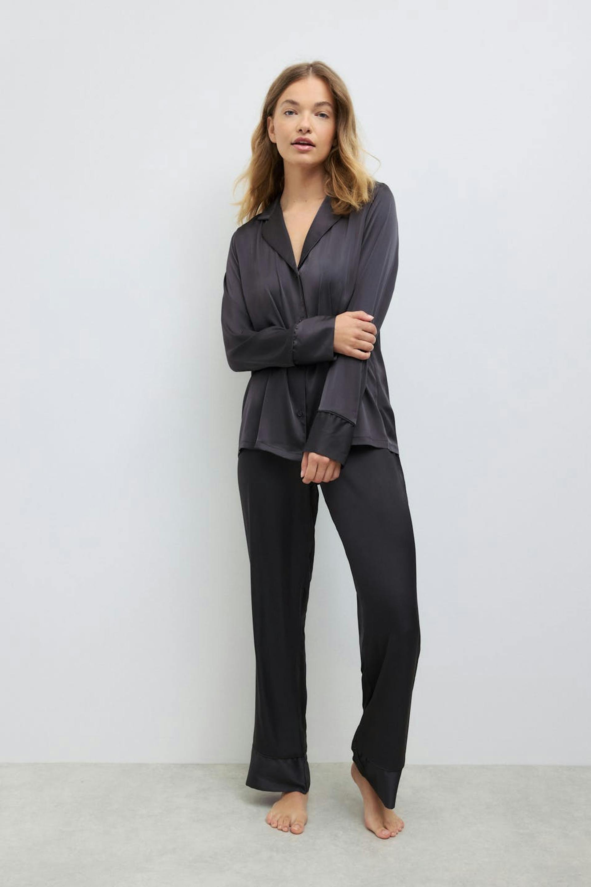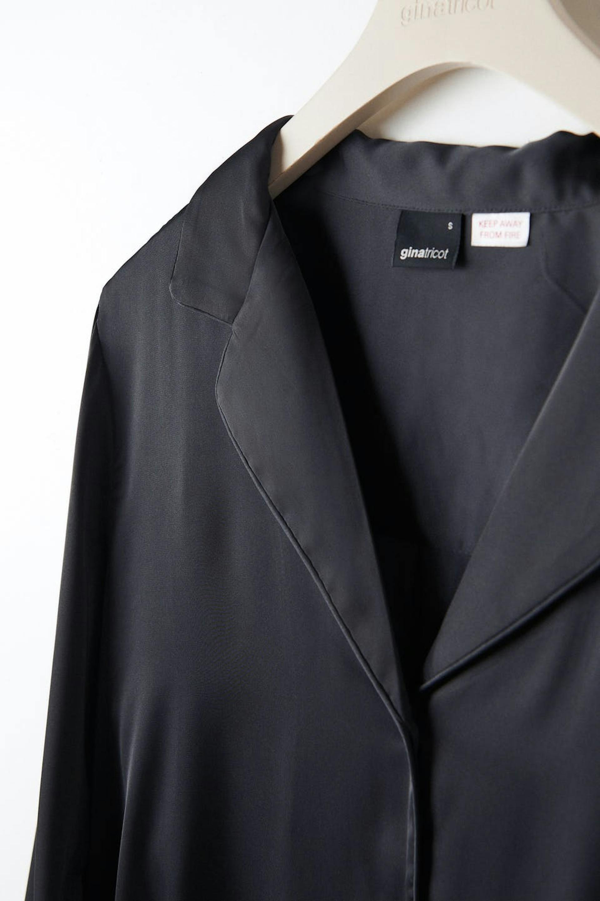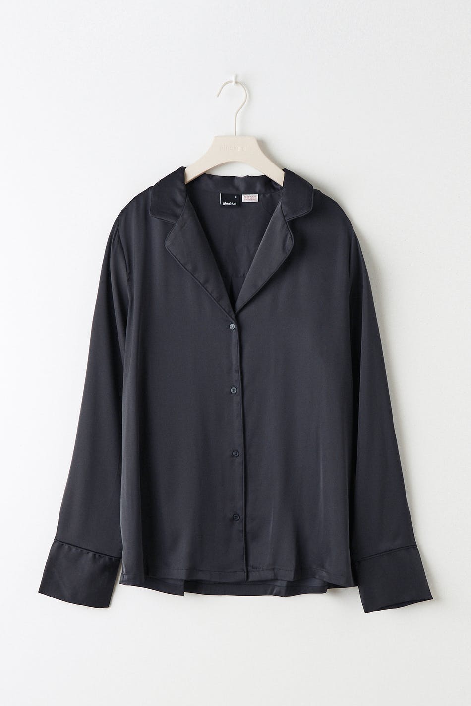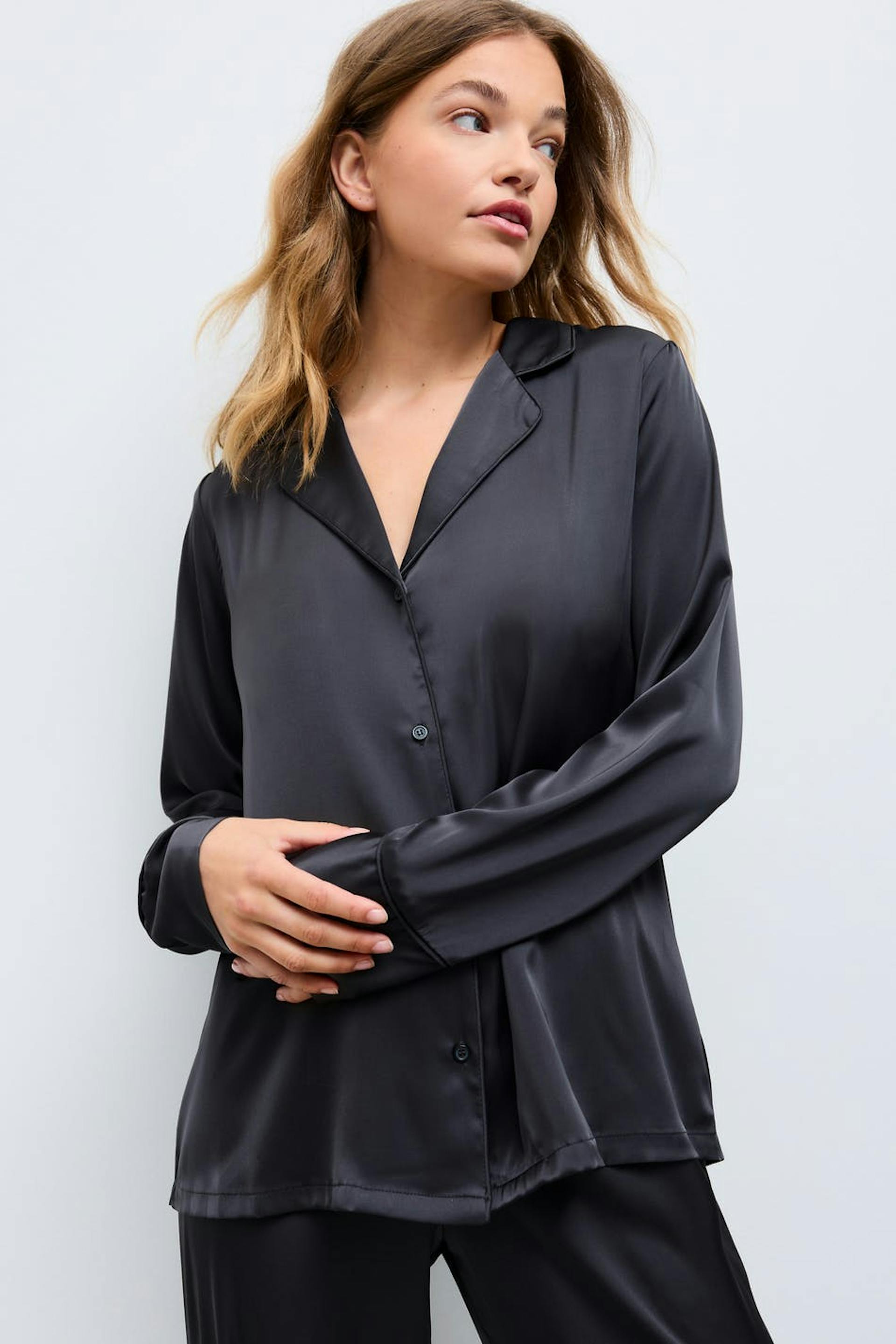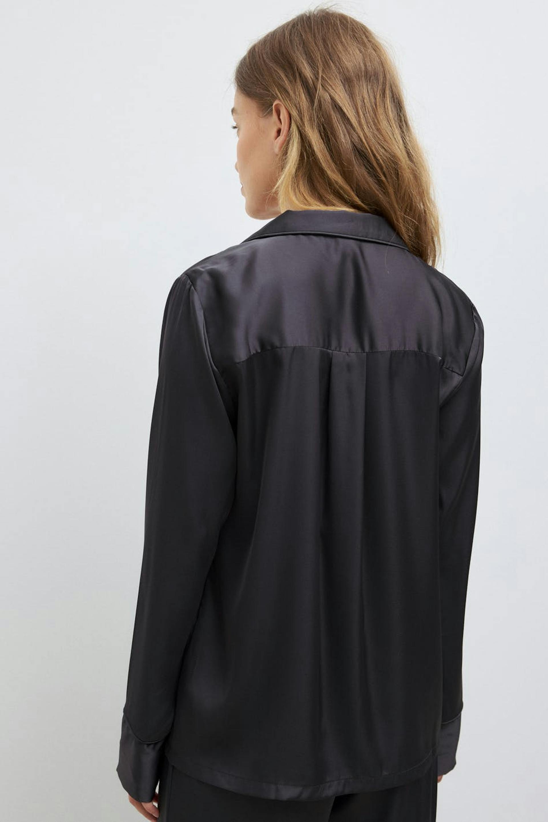 Pyjama shirt in satin with button placket in front. The shirt is black and has collar with lapels.
