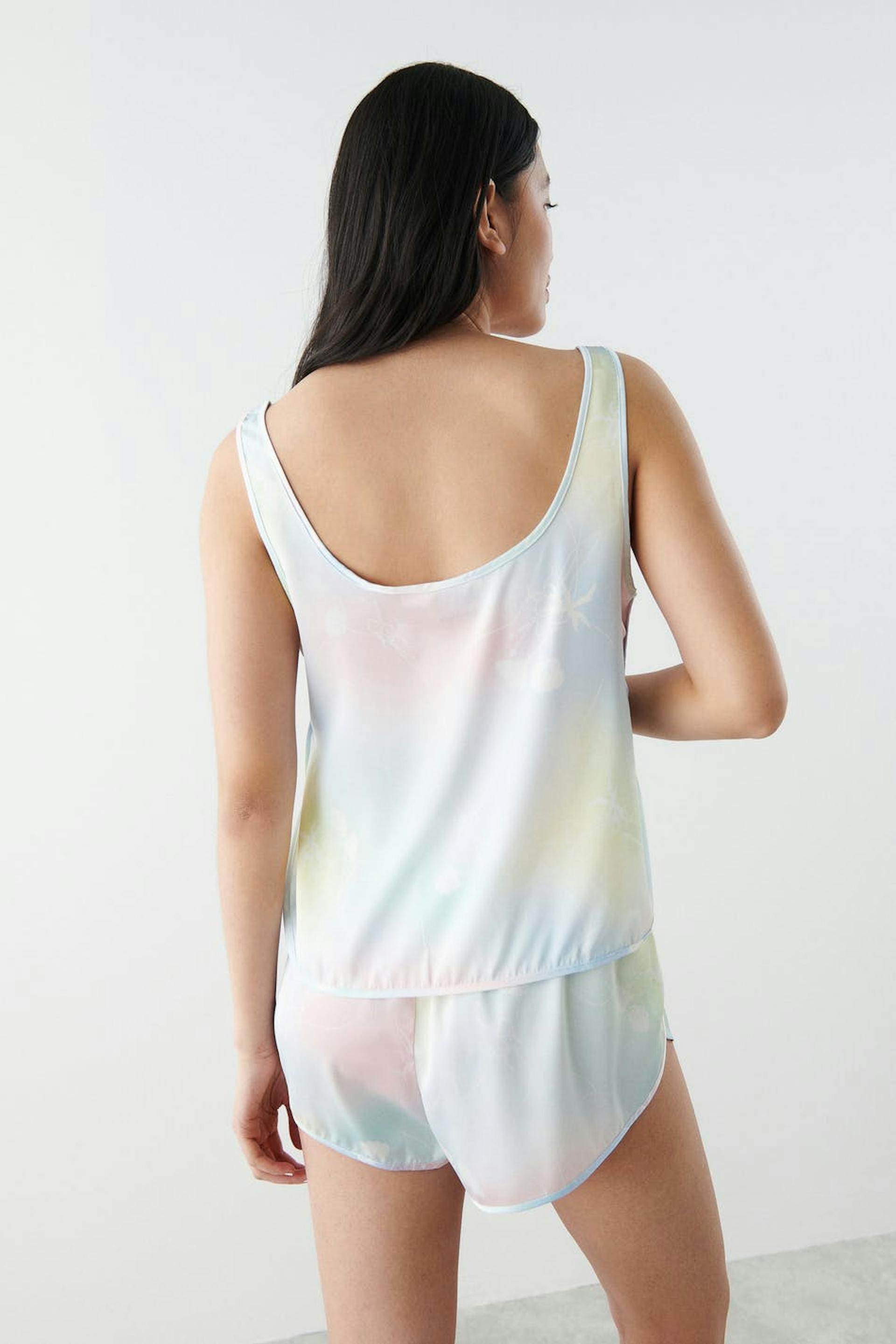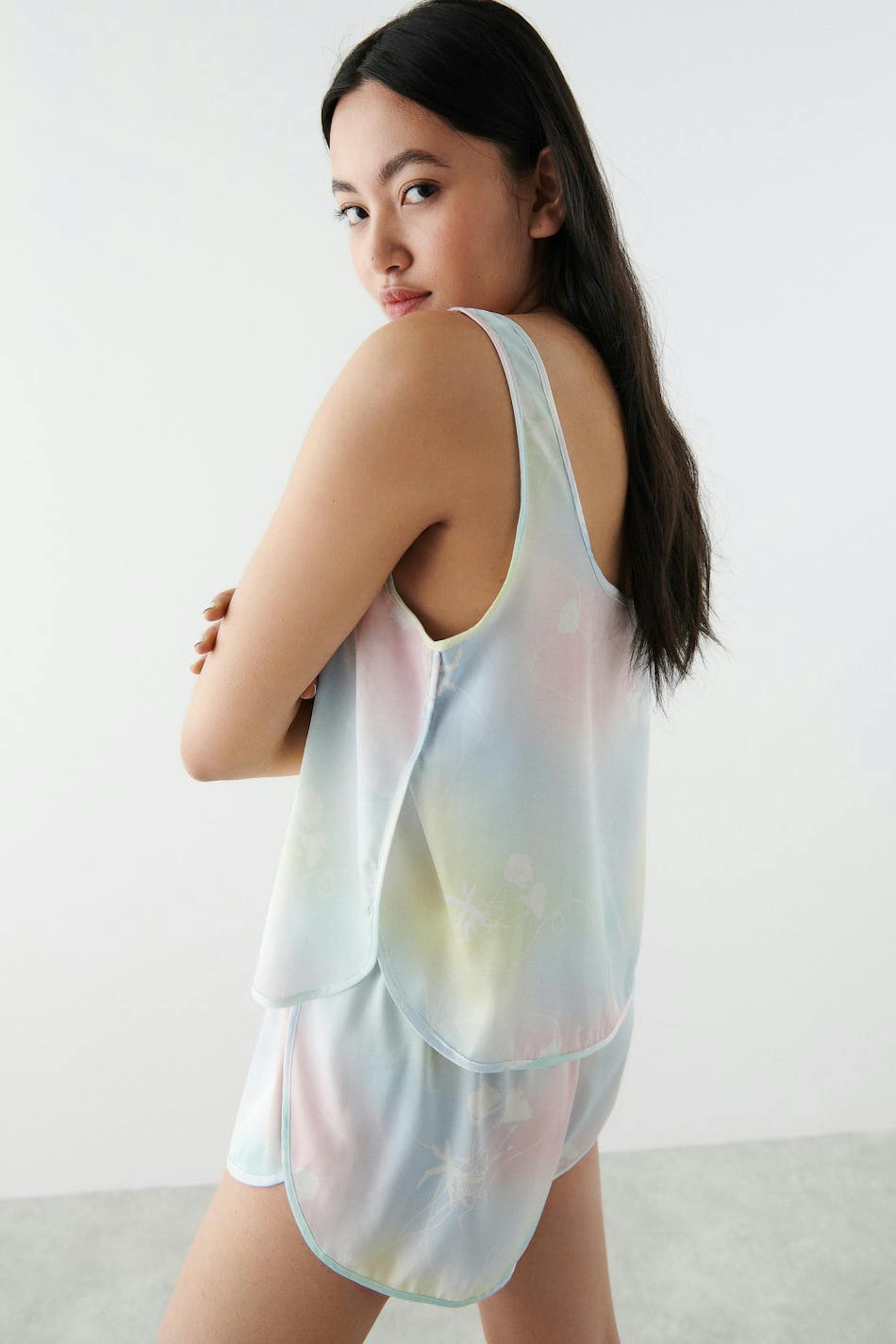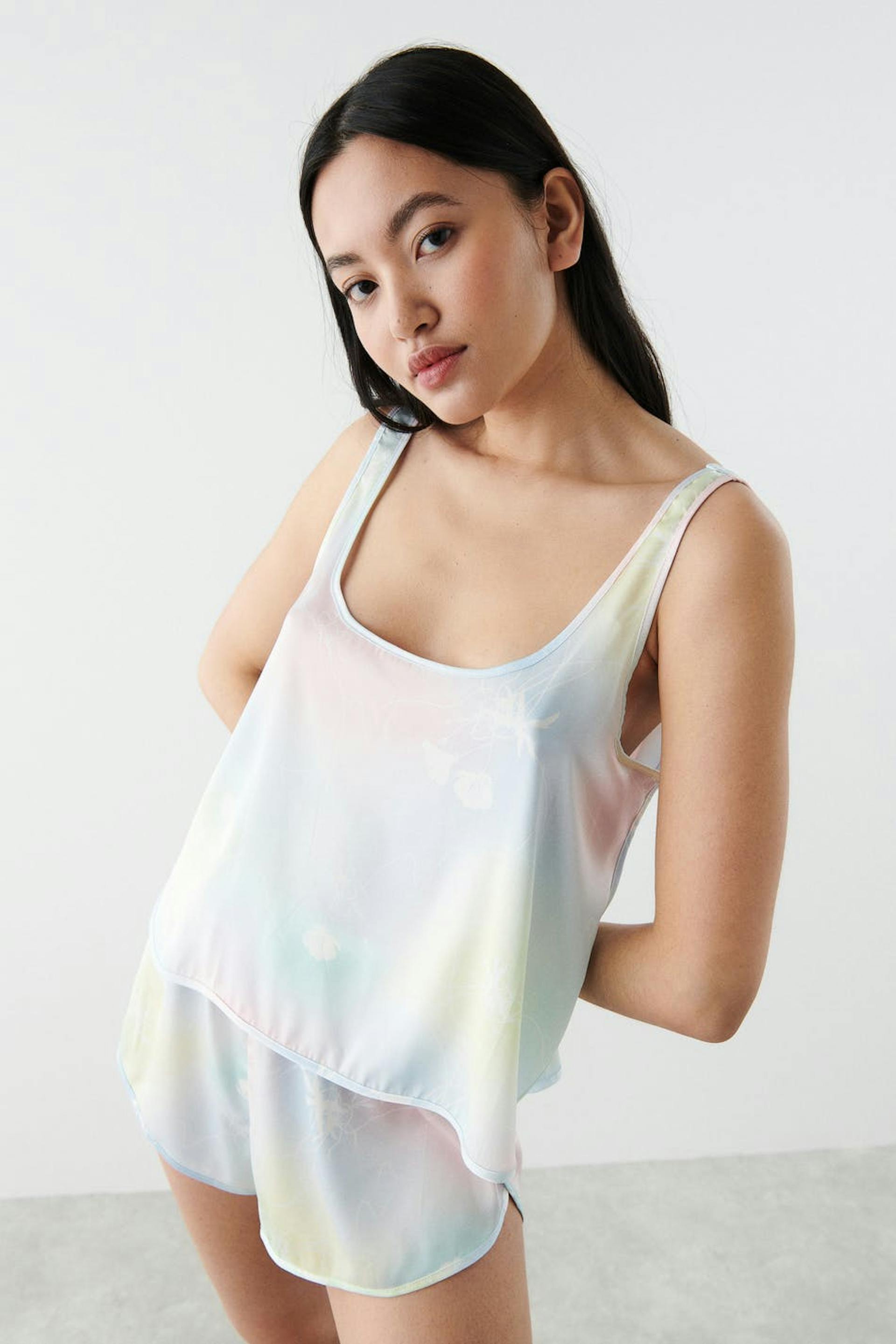 Pastel pyjama top with u-neck. The top is pink, blue and yellow. It has a soft quality in satin.