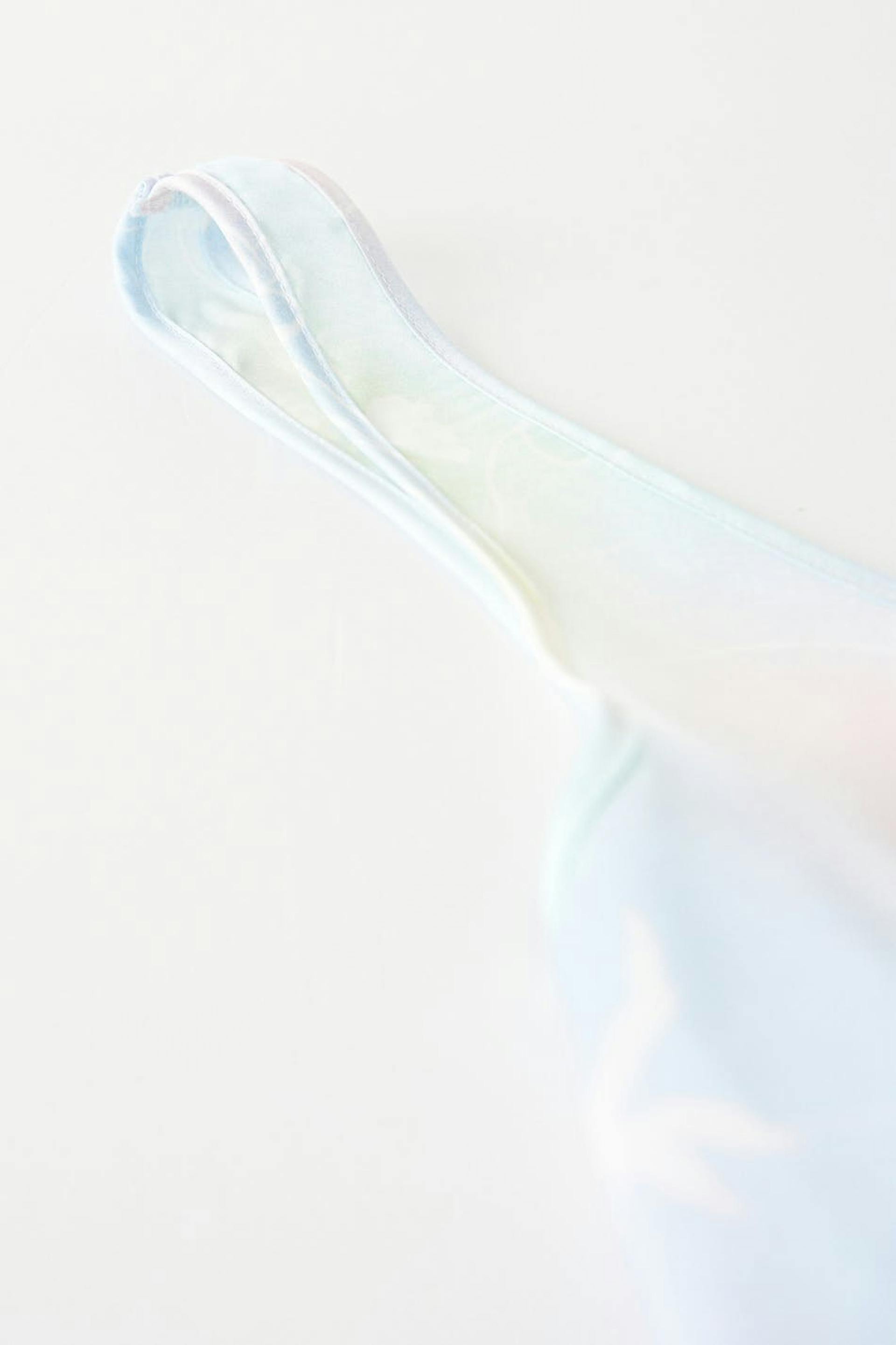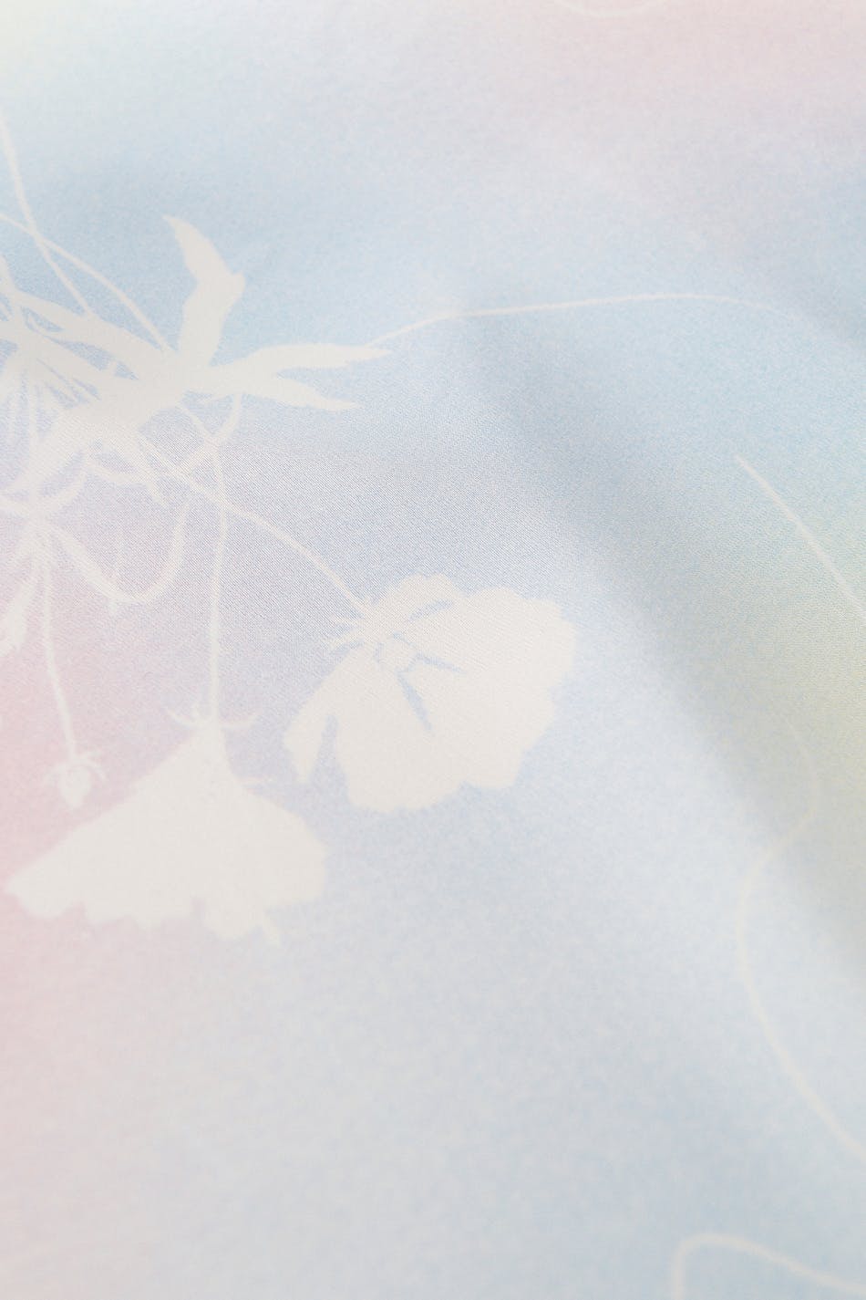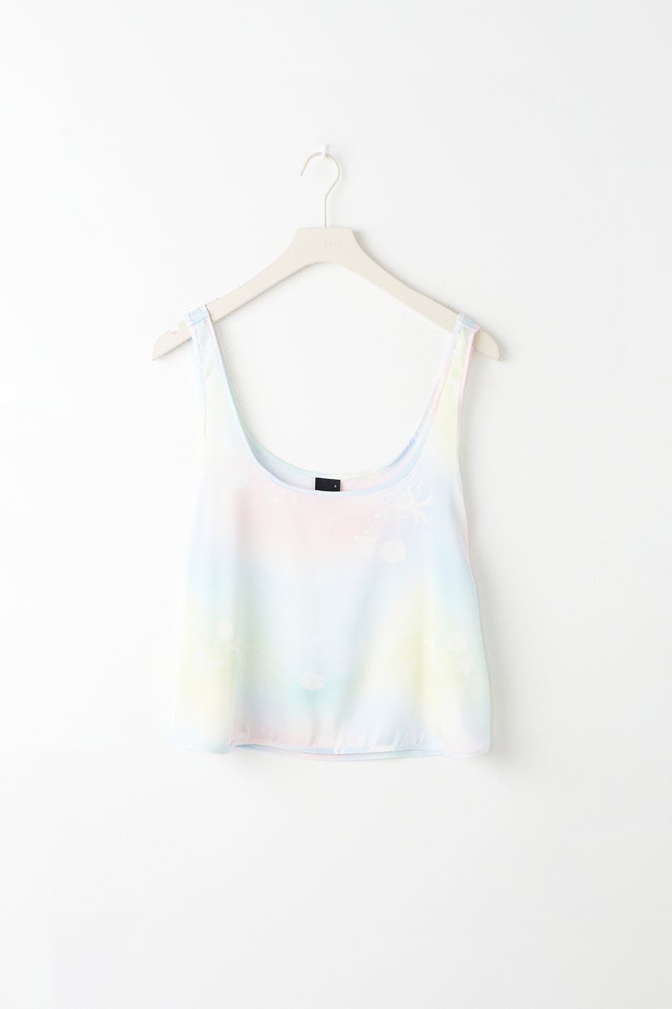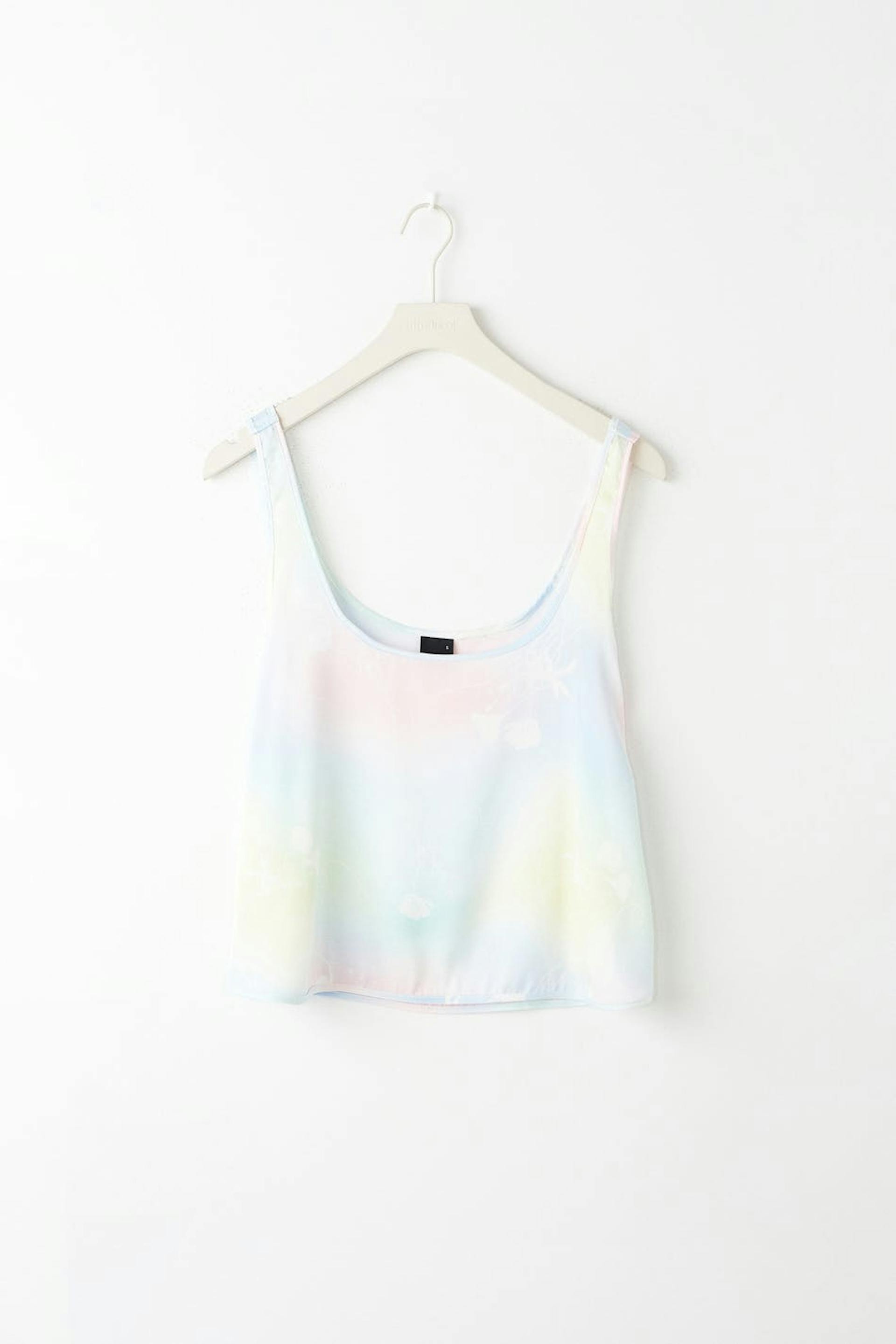 Pastel pyjama top with u-neck. The top is pink, blue and yellow. It has a soft quality in satin.