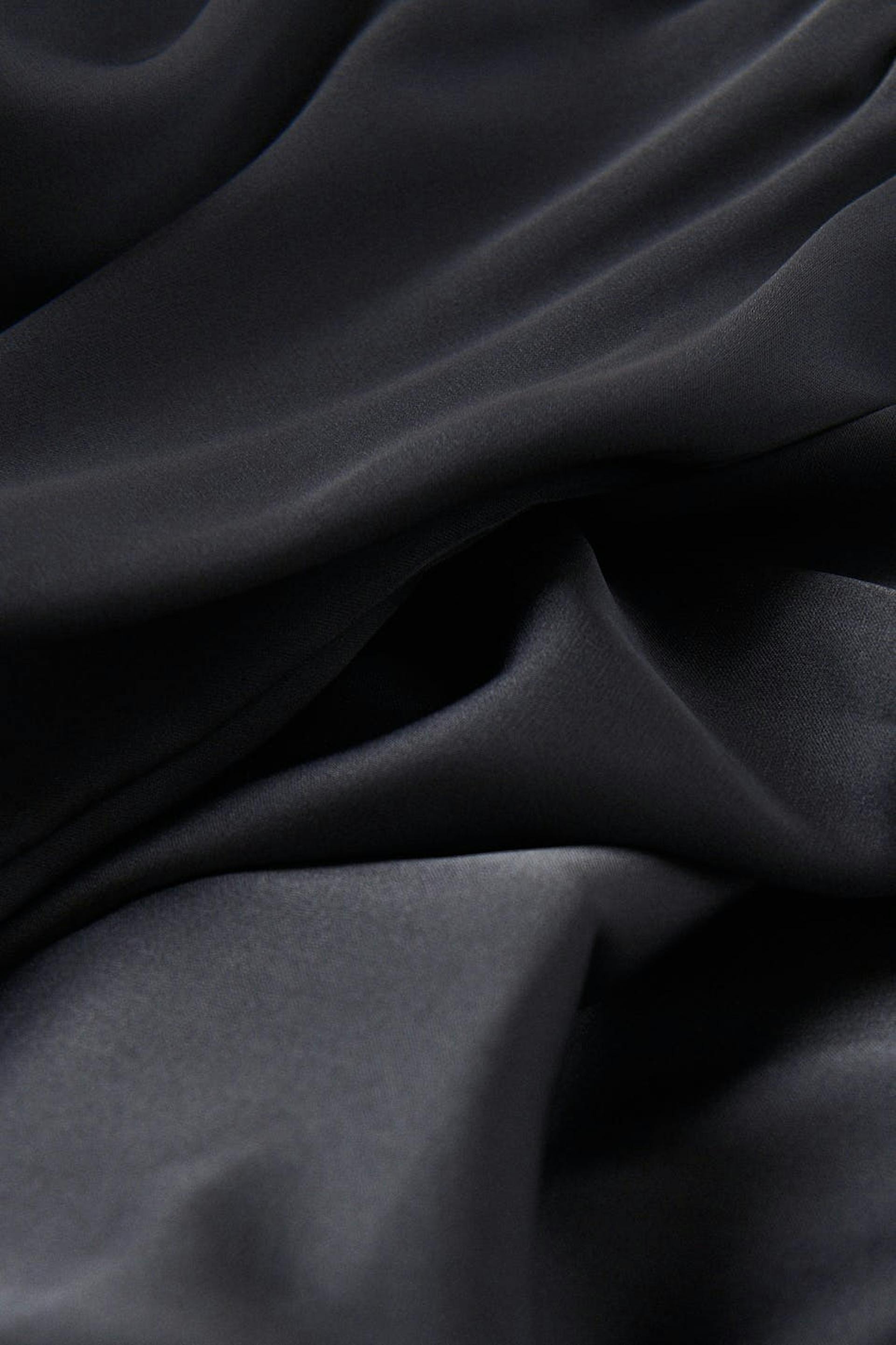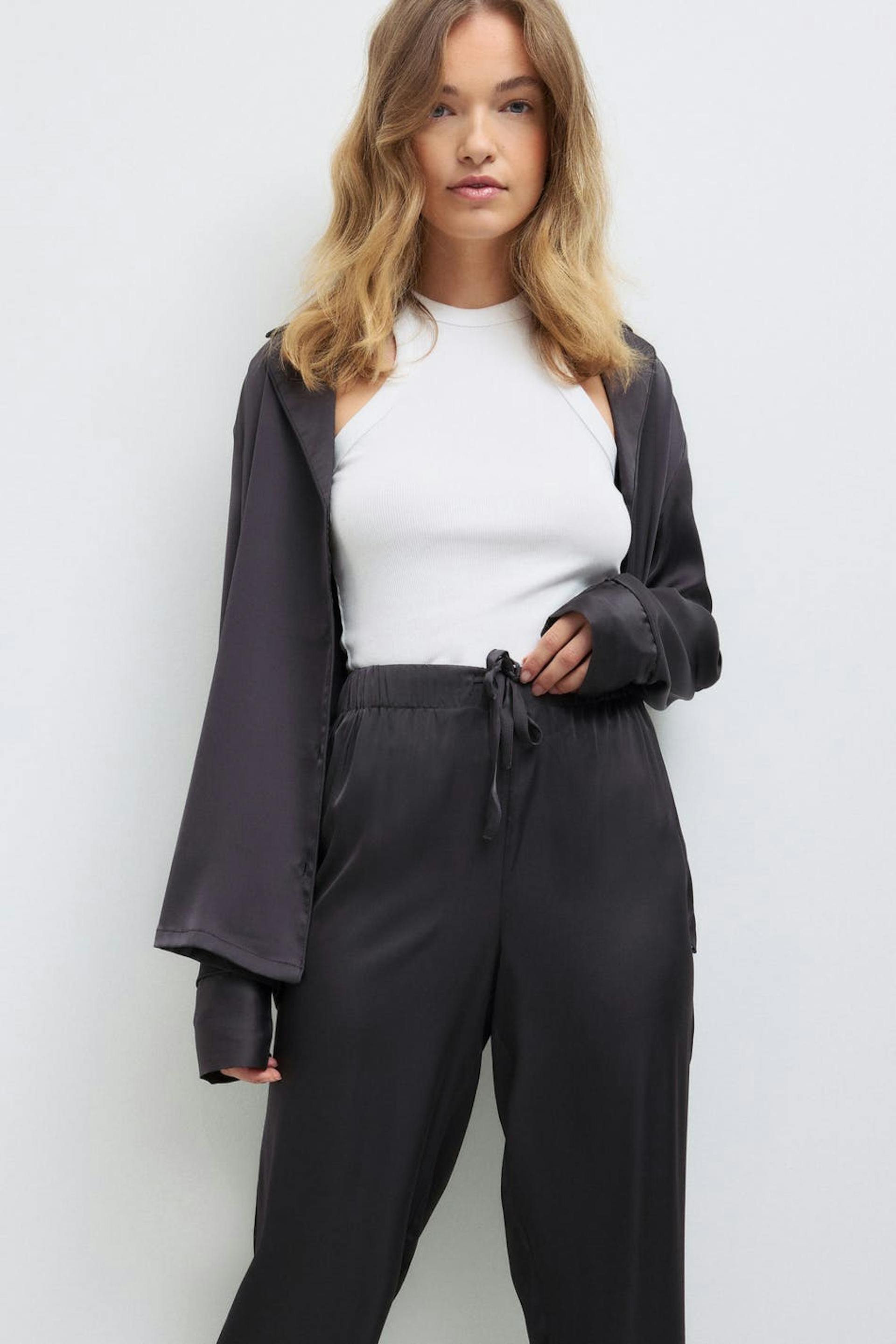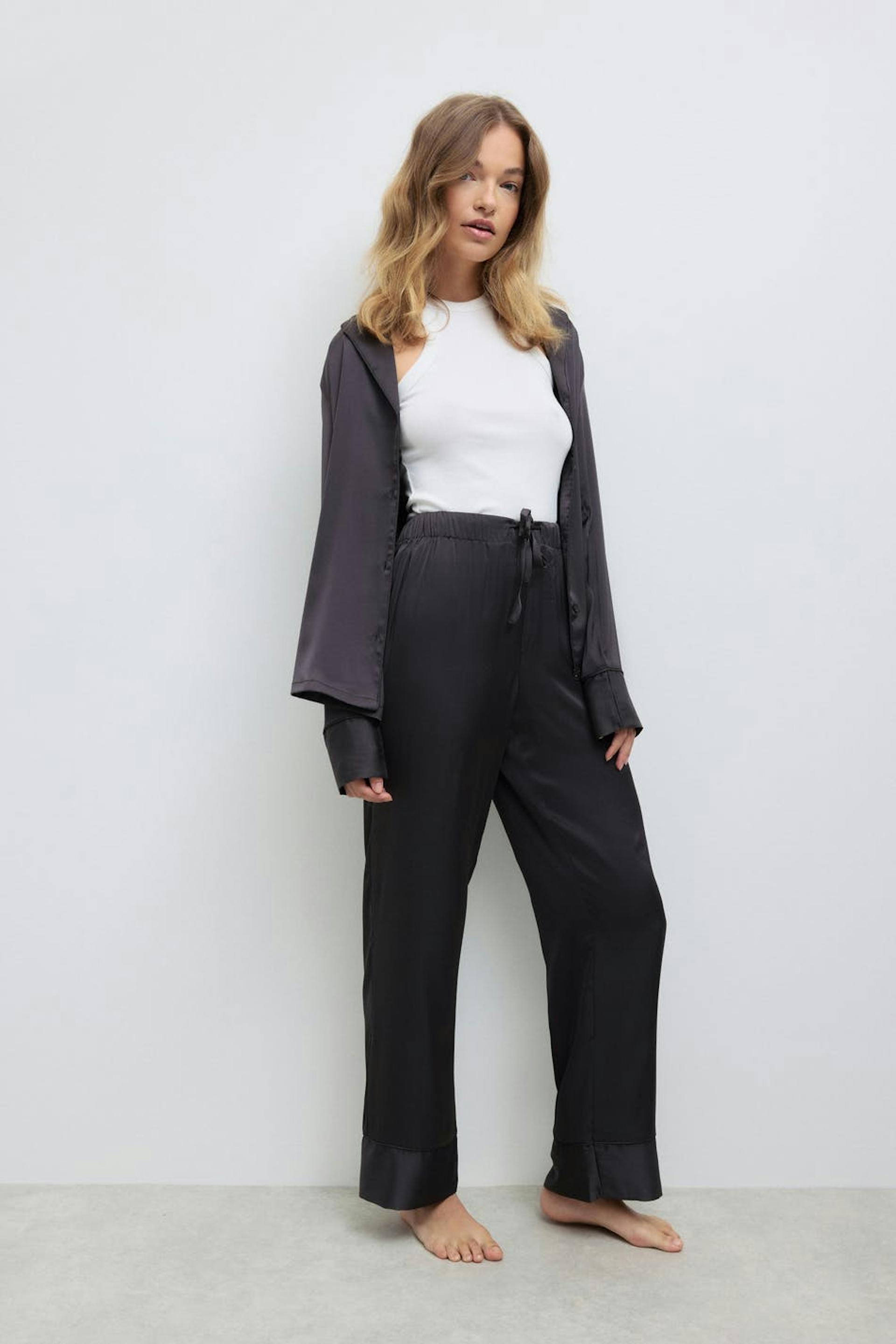 Pyjama tracksuit trousers in satin with self-tie drawstring at the front. The pyjama tracksuit trousers are black and have soft elastic at the waist.
