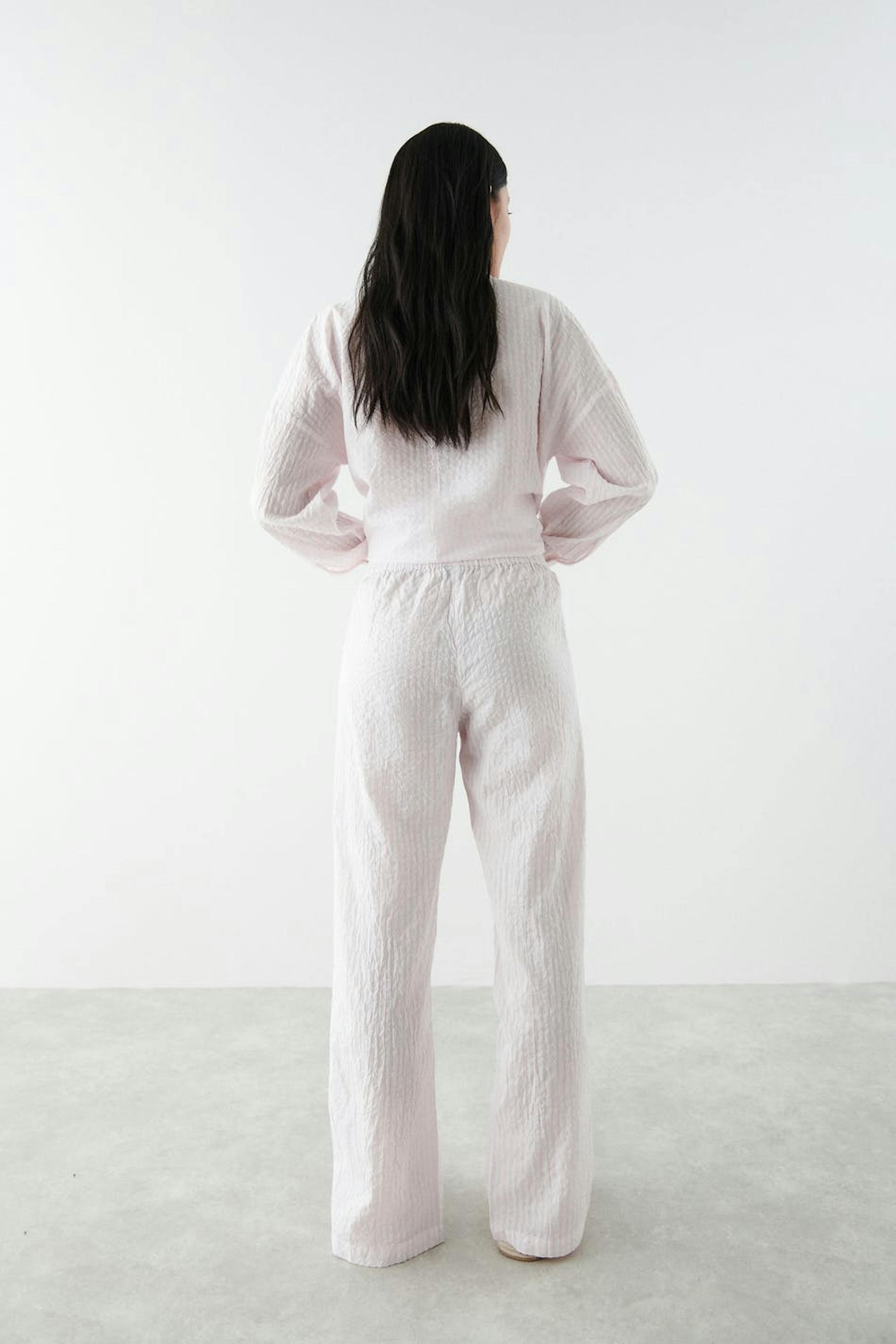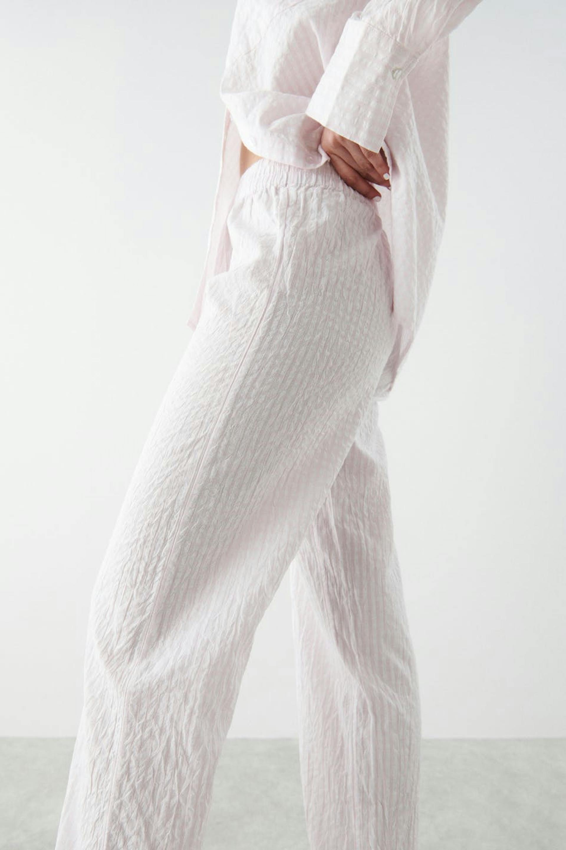 Pyjama tracksuit trousers in seersucker quality with elastic at the waist. The pyjama tracksuit trousers are pink and have straight legs.