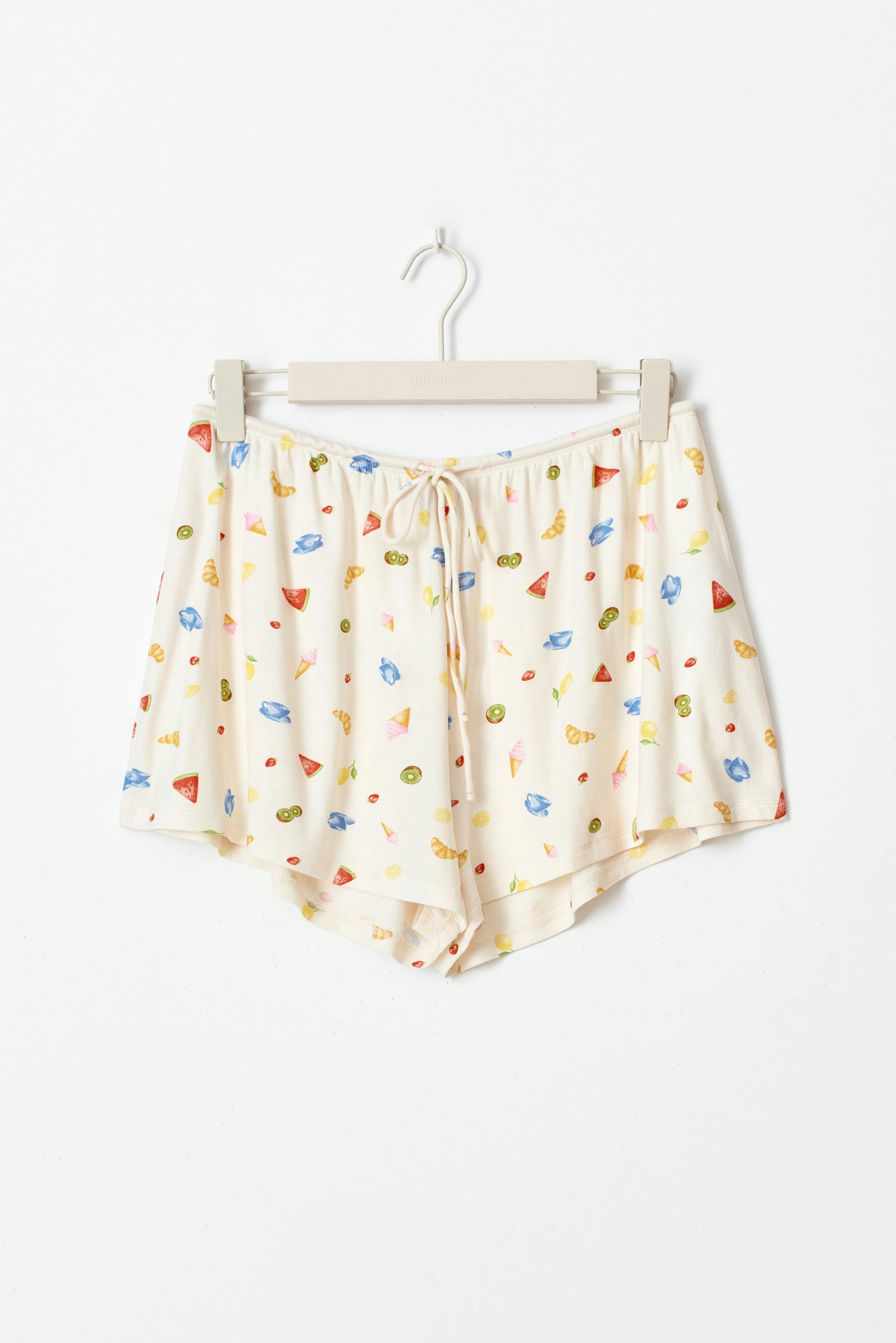 Patterned shorts with soft quality. The shorts are short and have elastic at the waist with self-tie at the front.