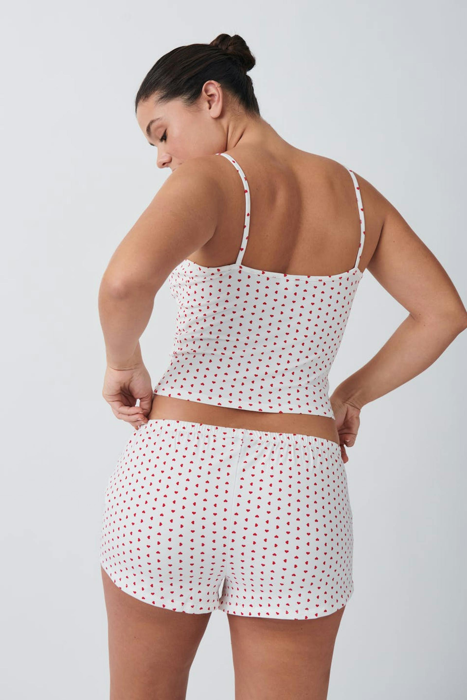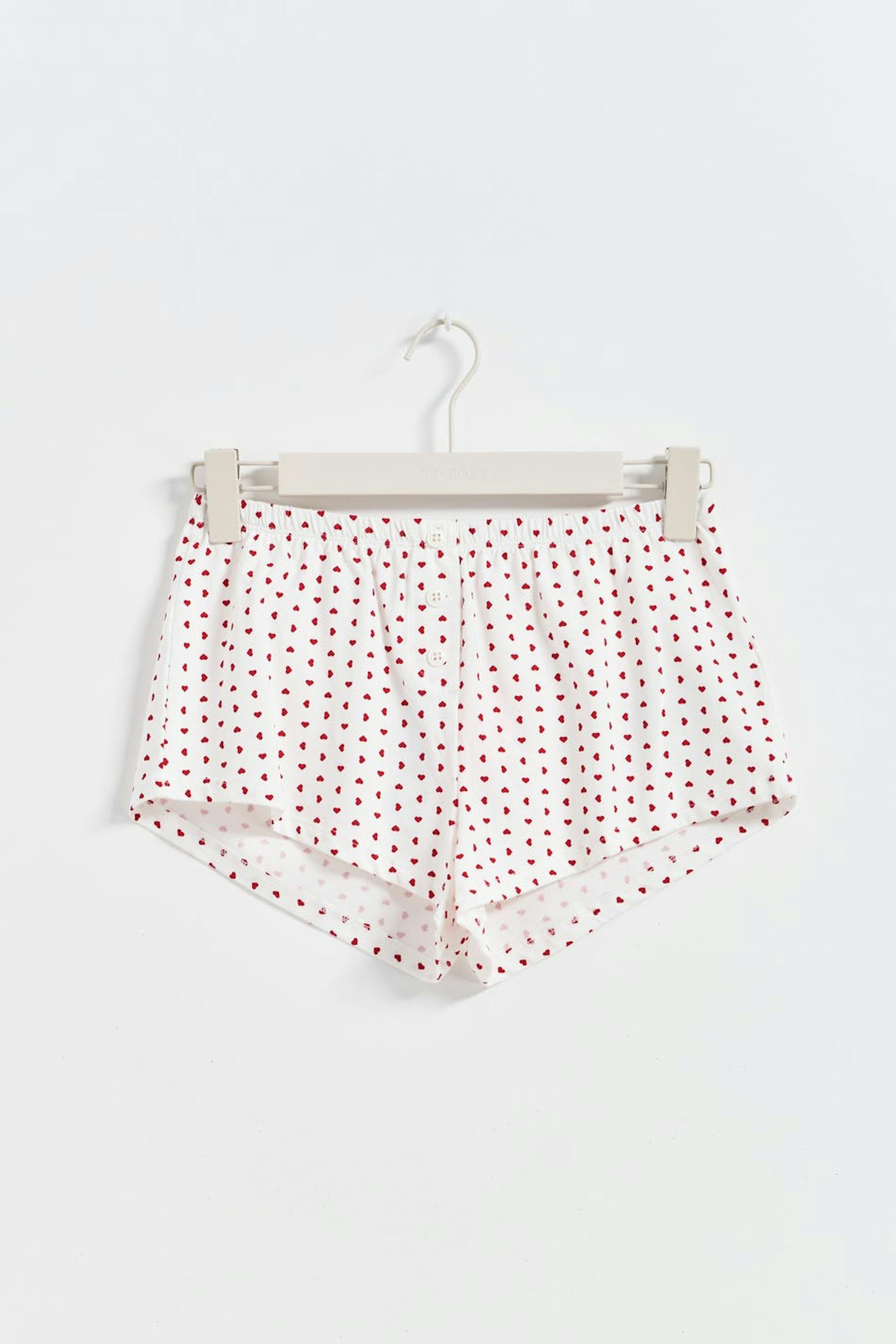 Short pyjama shorts with small hearts. The shorts are white and have figure-hugging fit. They have low waist, buttons at the front and elastic at the waist.