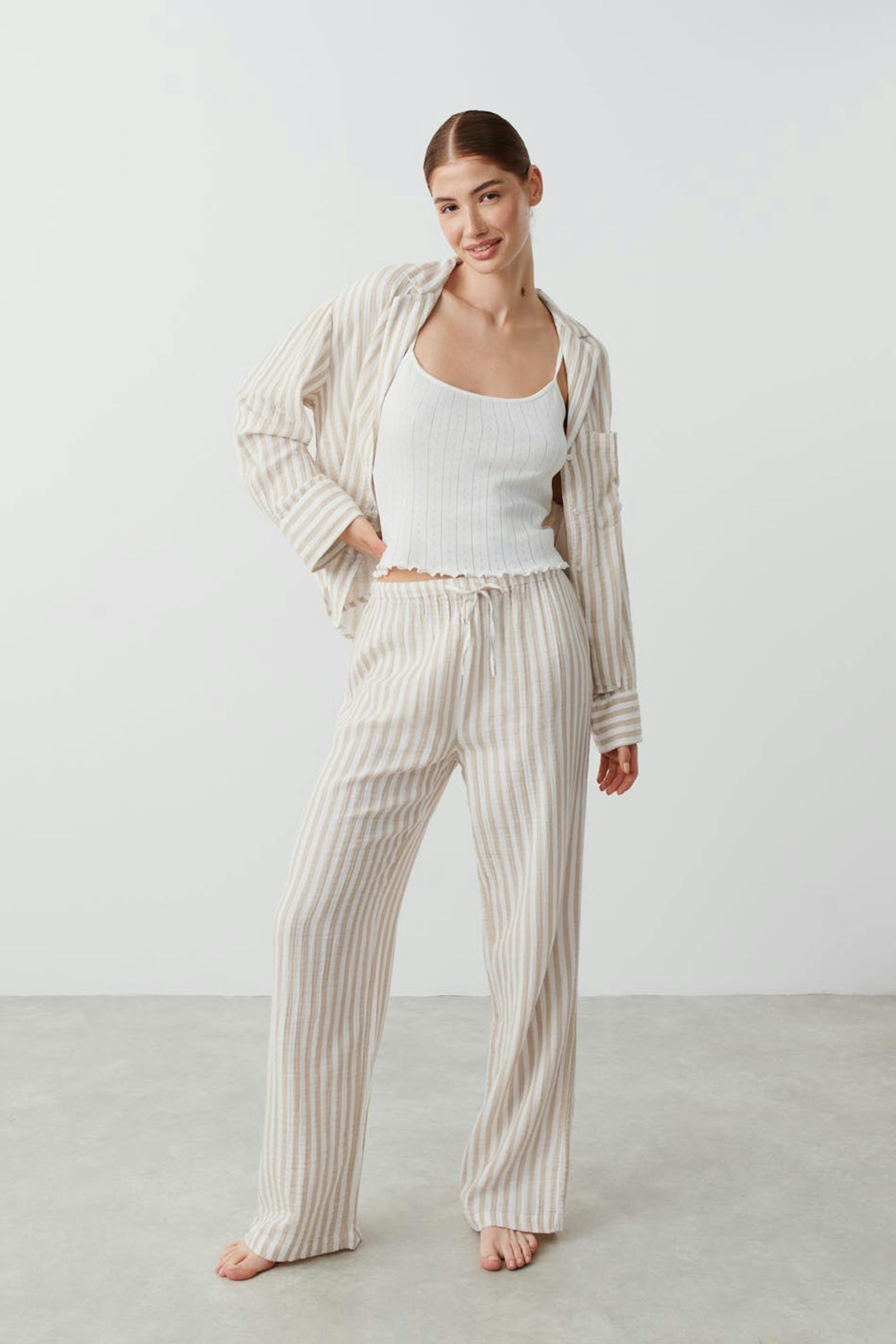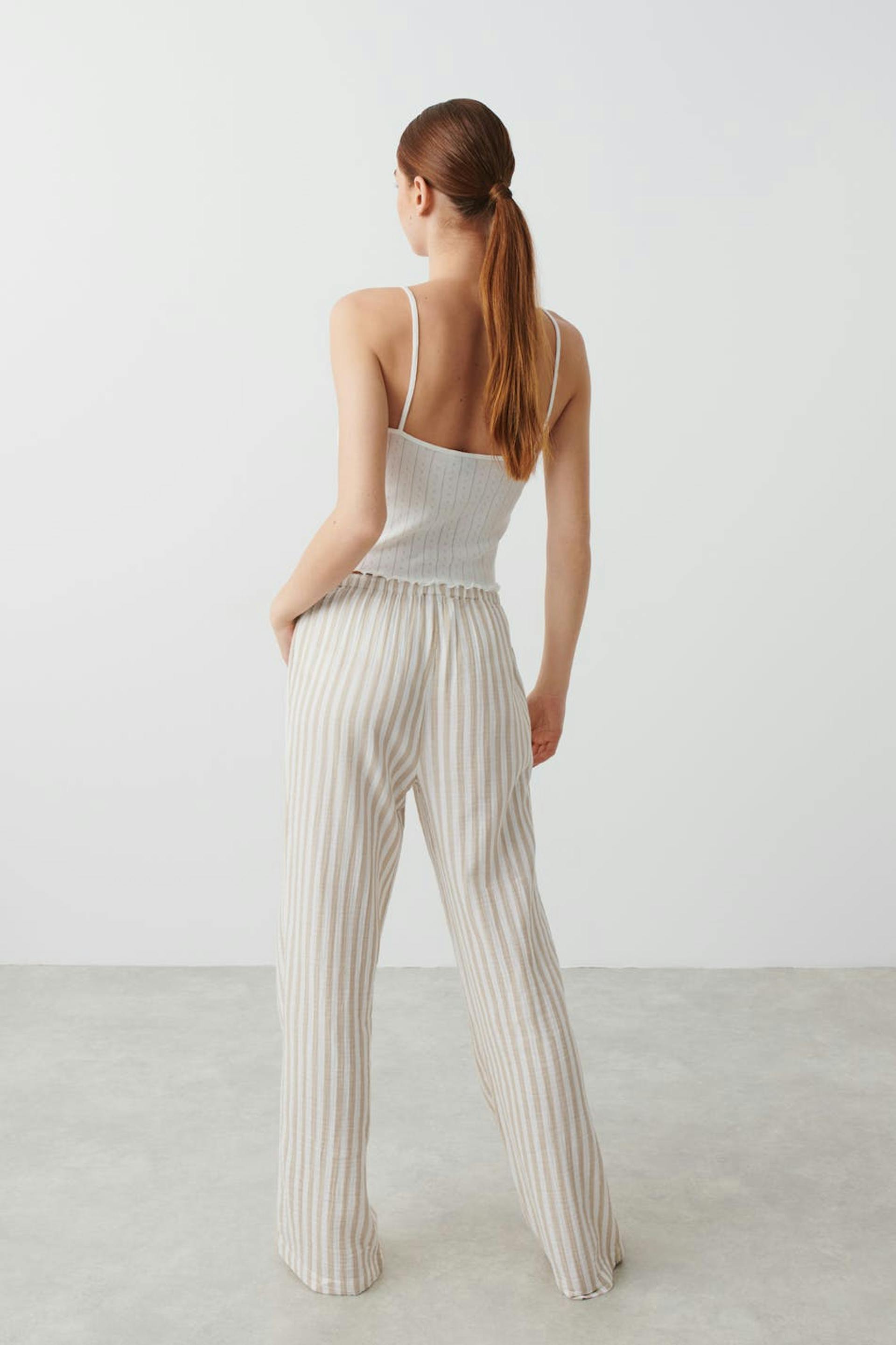 Striped pyjama tracksuit trousers in cotton with elastic at the waist. The pyjama tracksuit trousers are beige and have self-tie at the front.