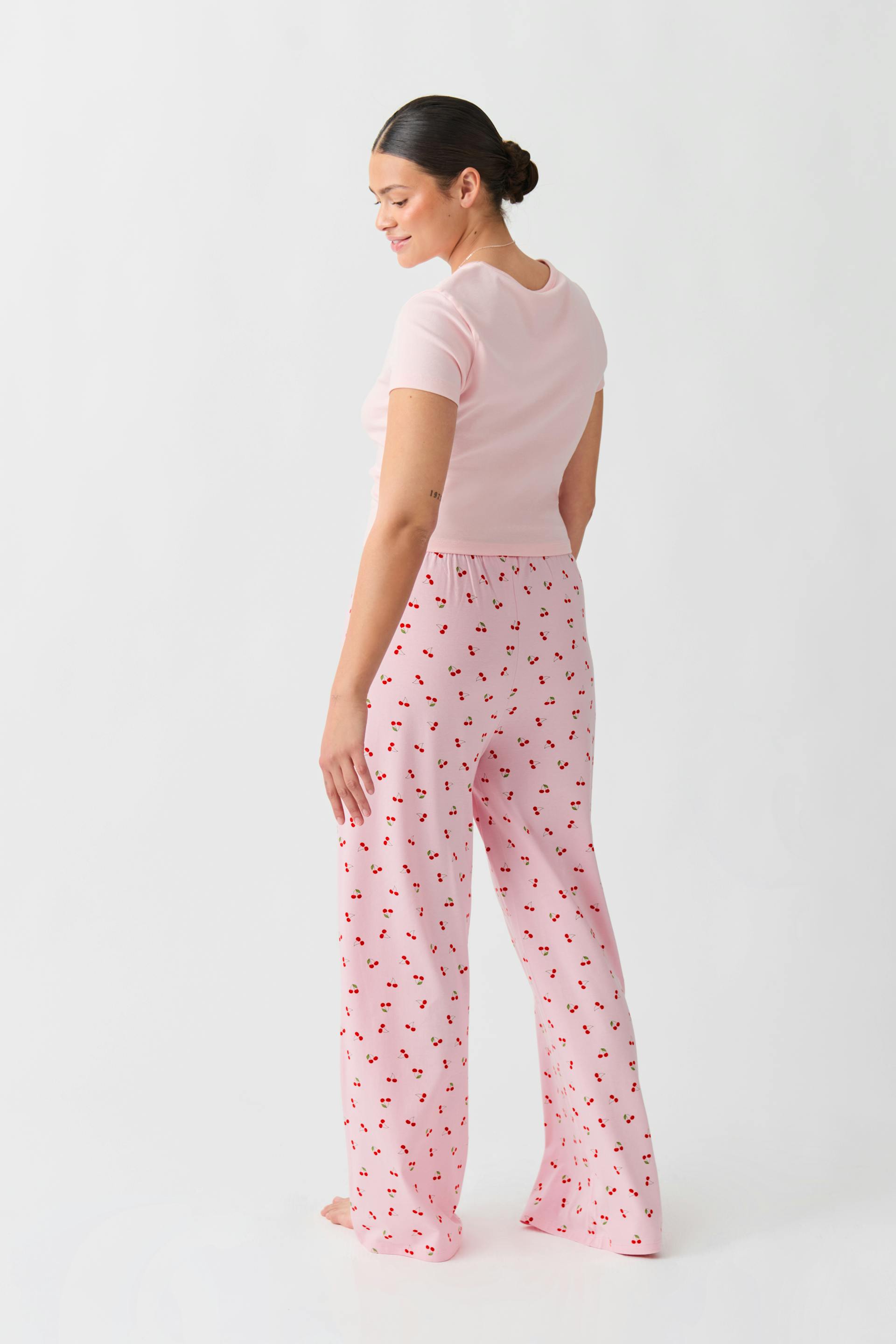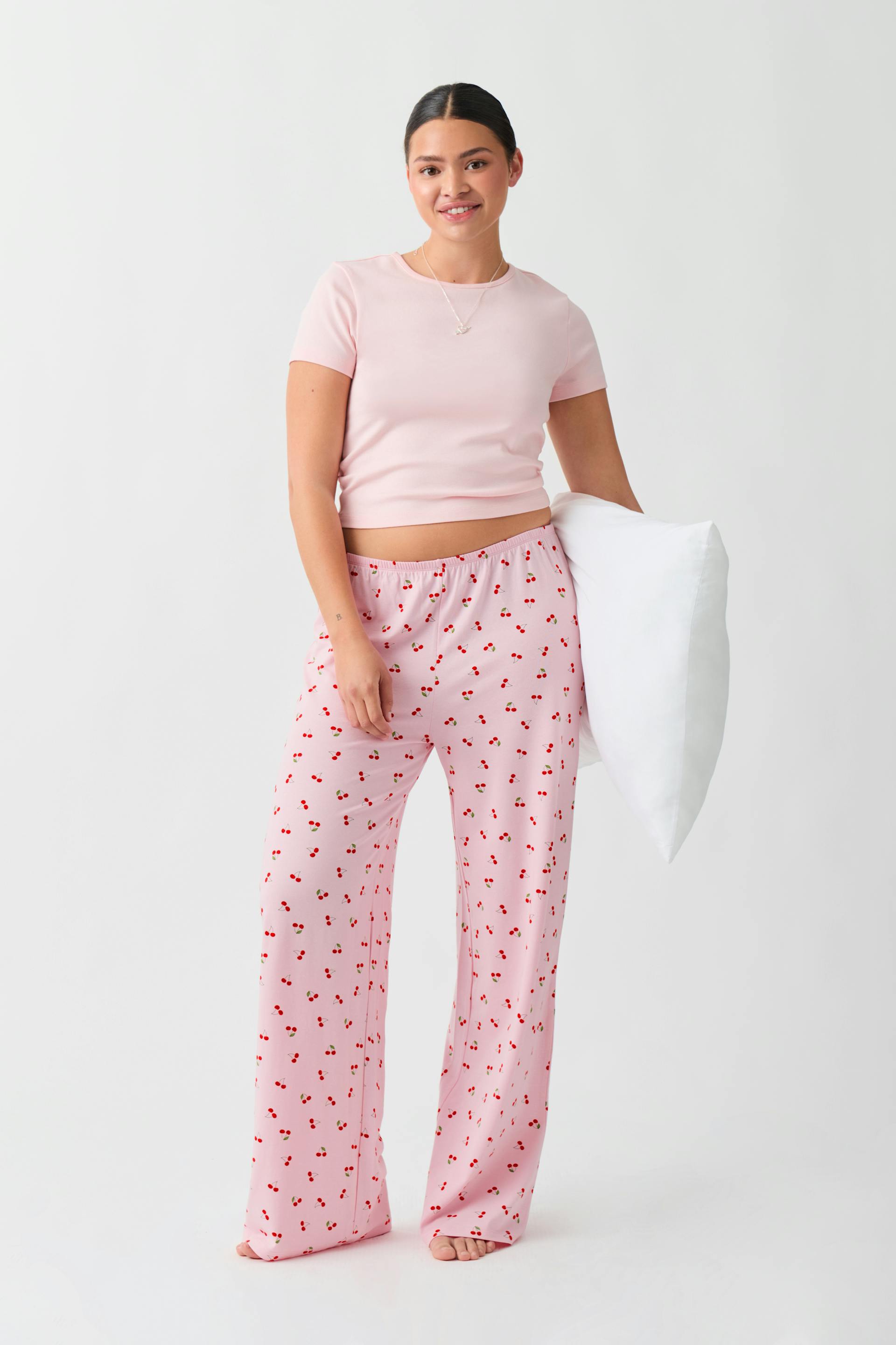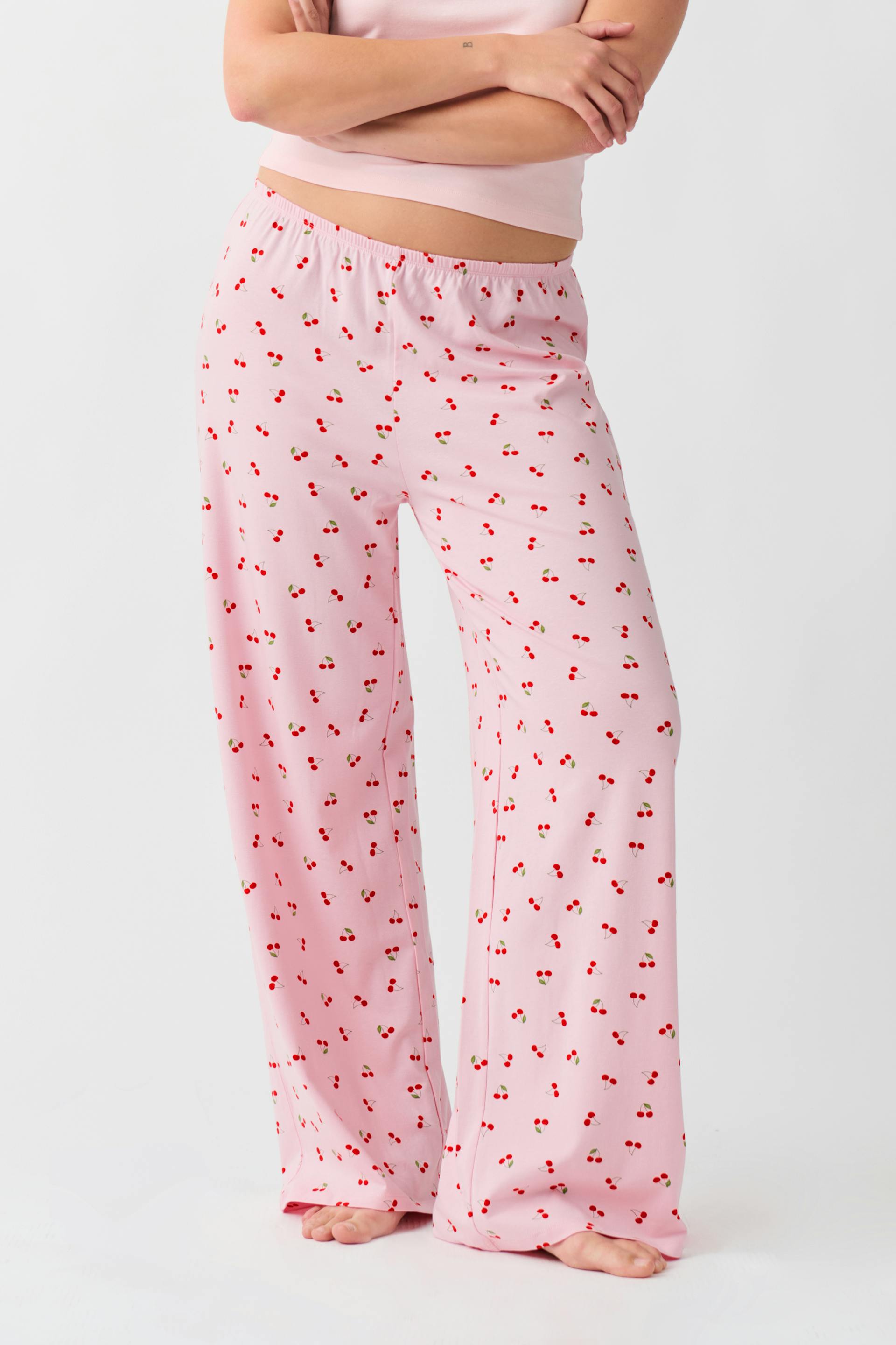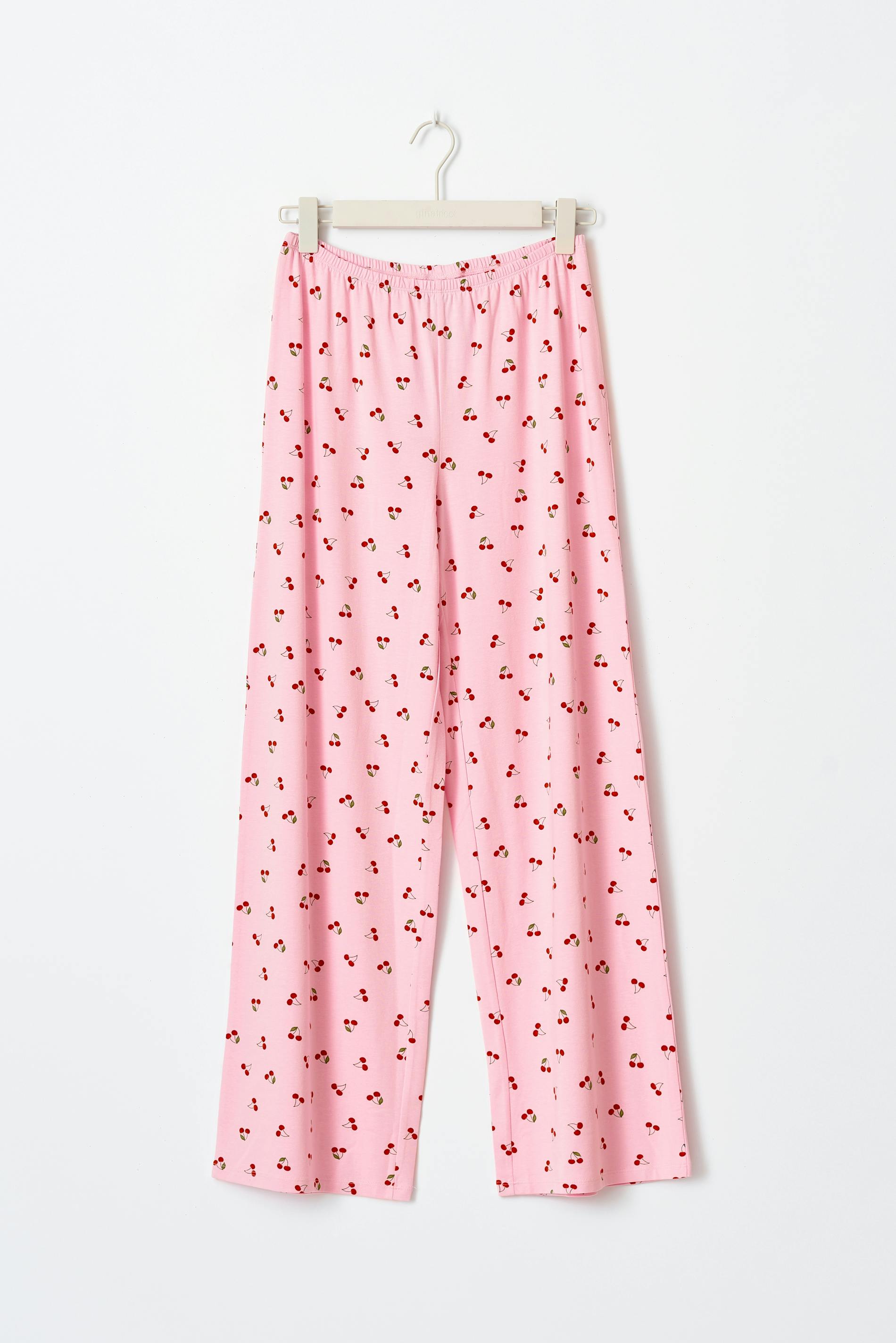 Pyjama tracksuit trousers with small cherries. The pyjama tracksuit trousers are pink and have regular fit. They have straight legs and elastic at the waist.