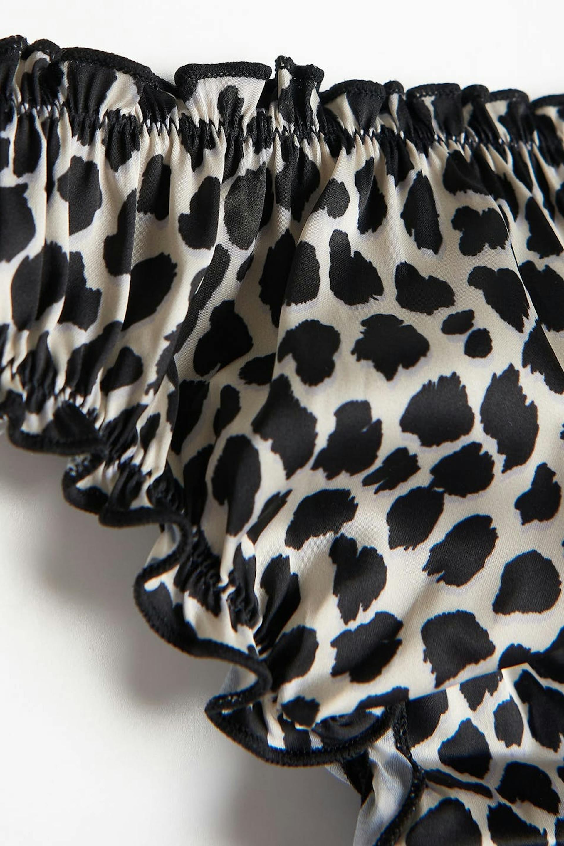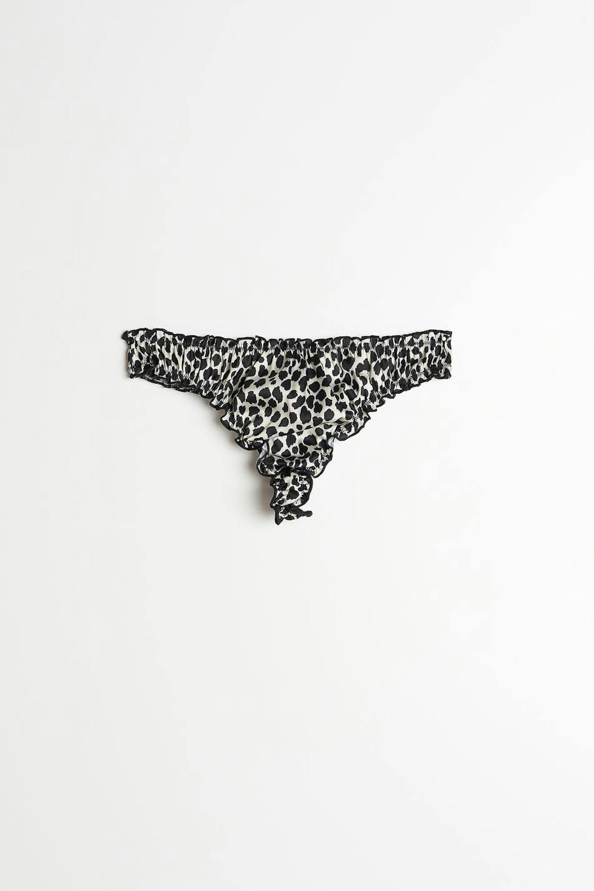 Satin thongs with frills. The thongs are leopard and have a lined crotch in cotton.