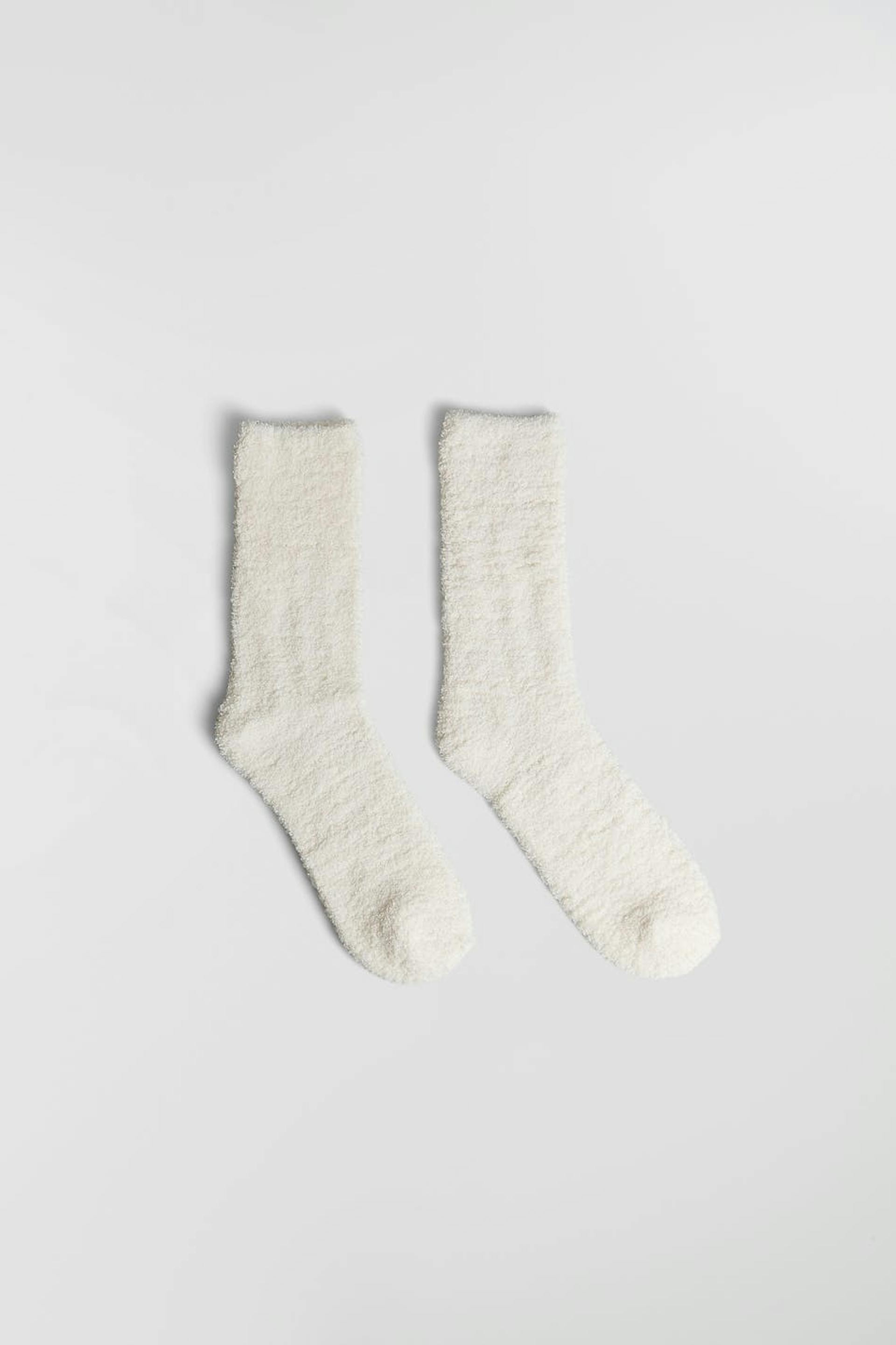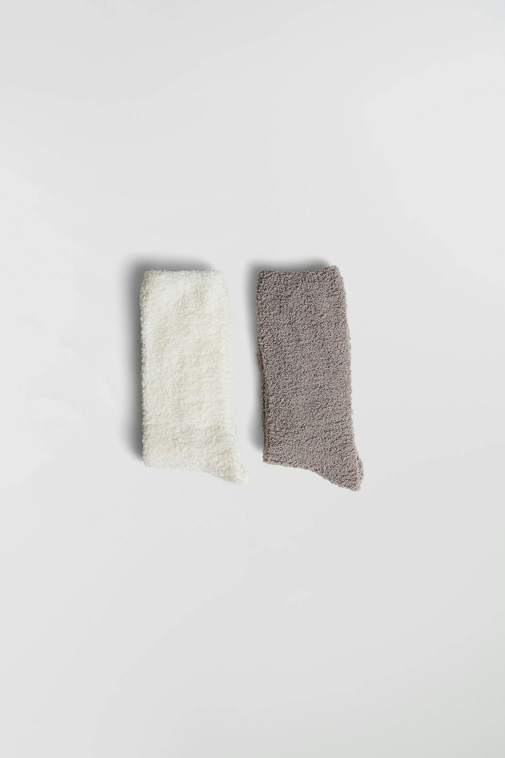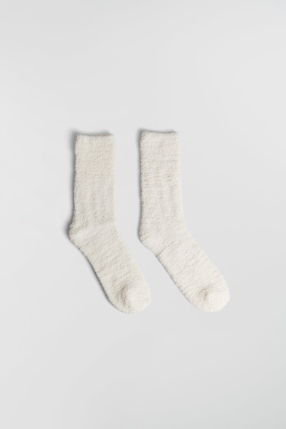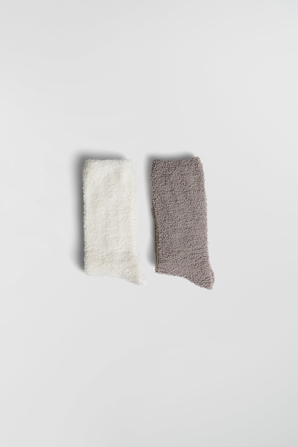 Socks with a soft, fluffy quality in chenille. The socks are white and brown. They are made of recycled polyester.