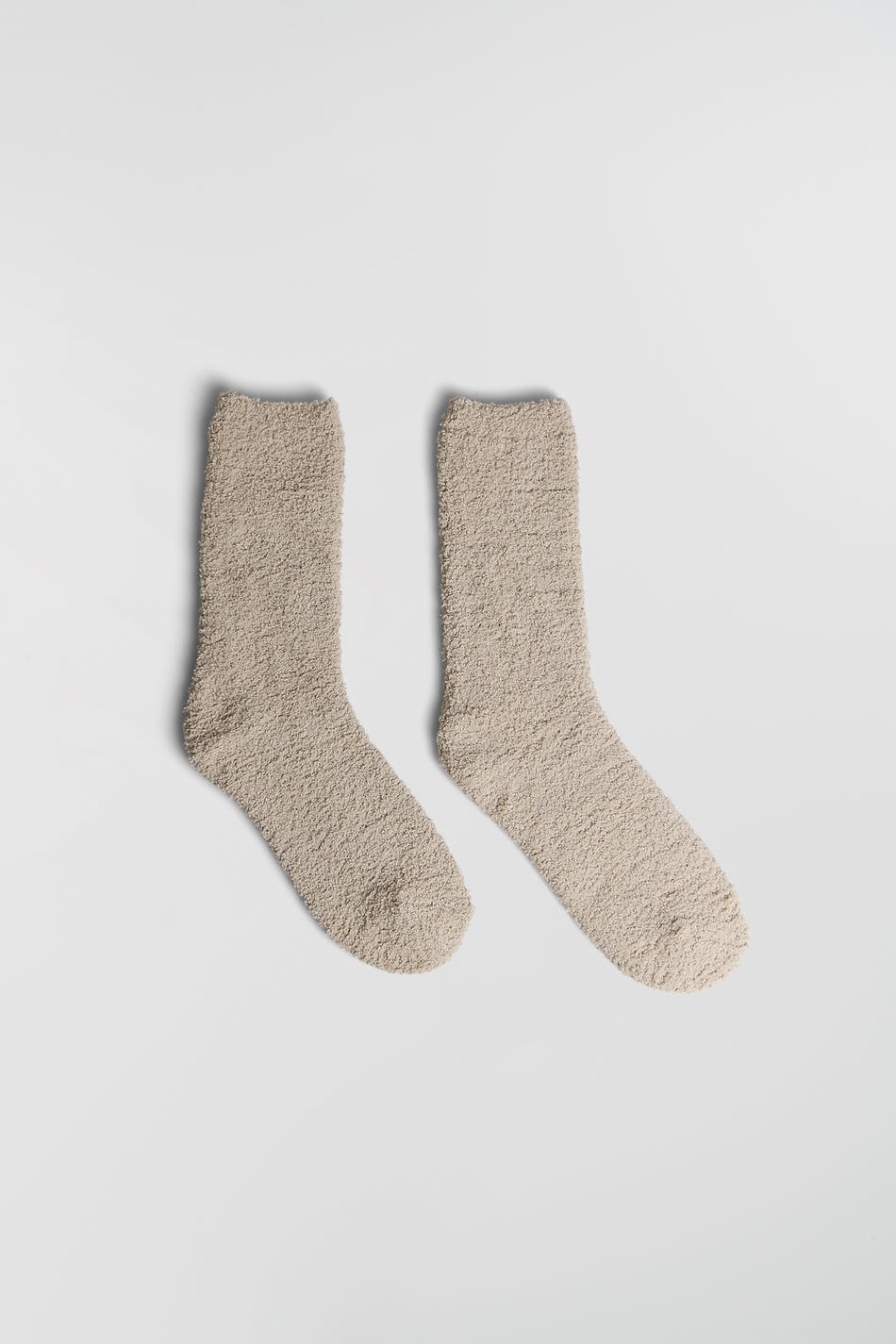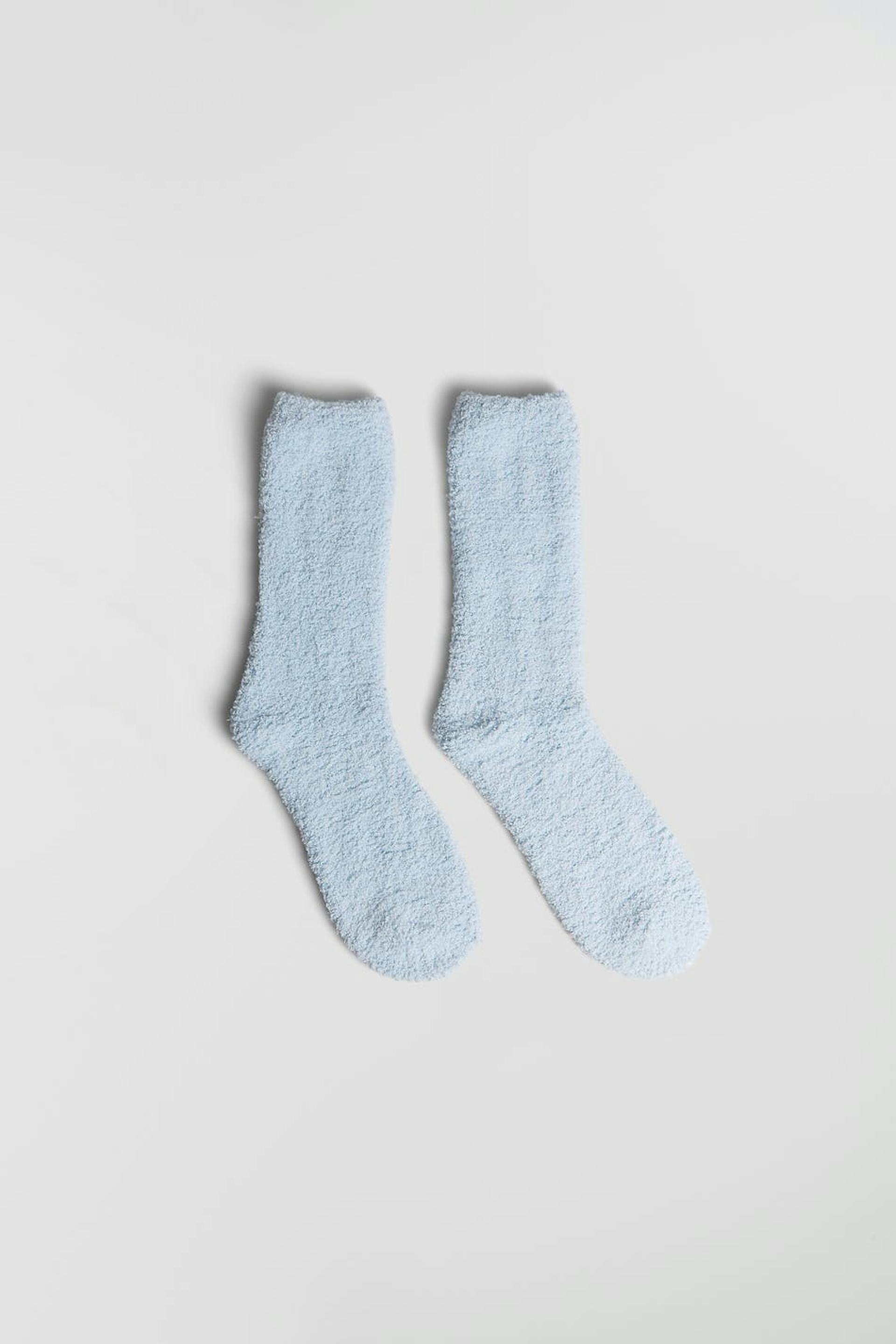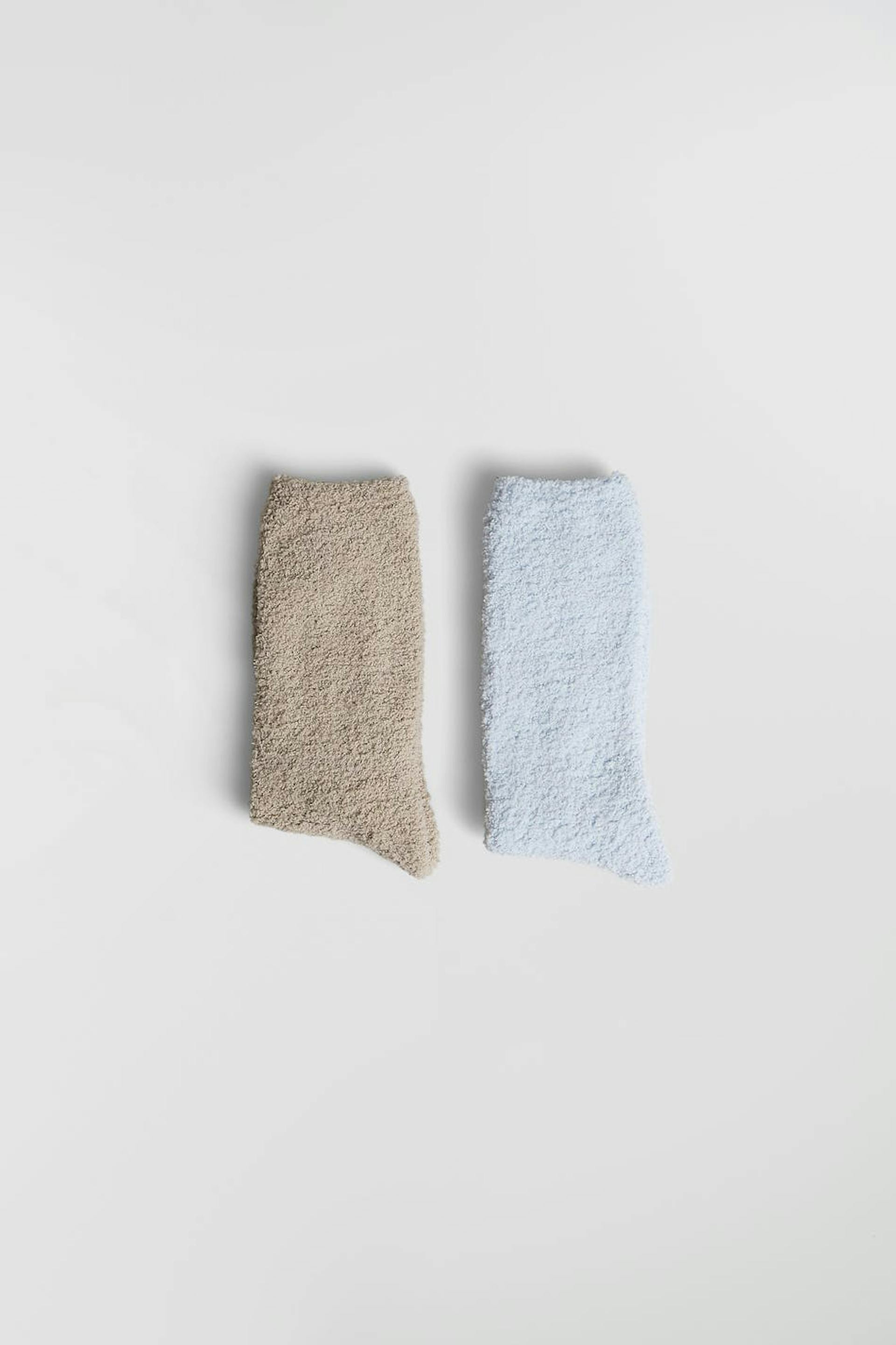 2-pack socks with a soft, fluffy quality. The socks are blue and beige. They are made of recycled polyester.