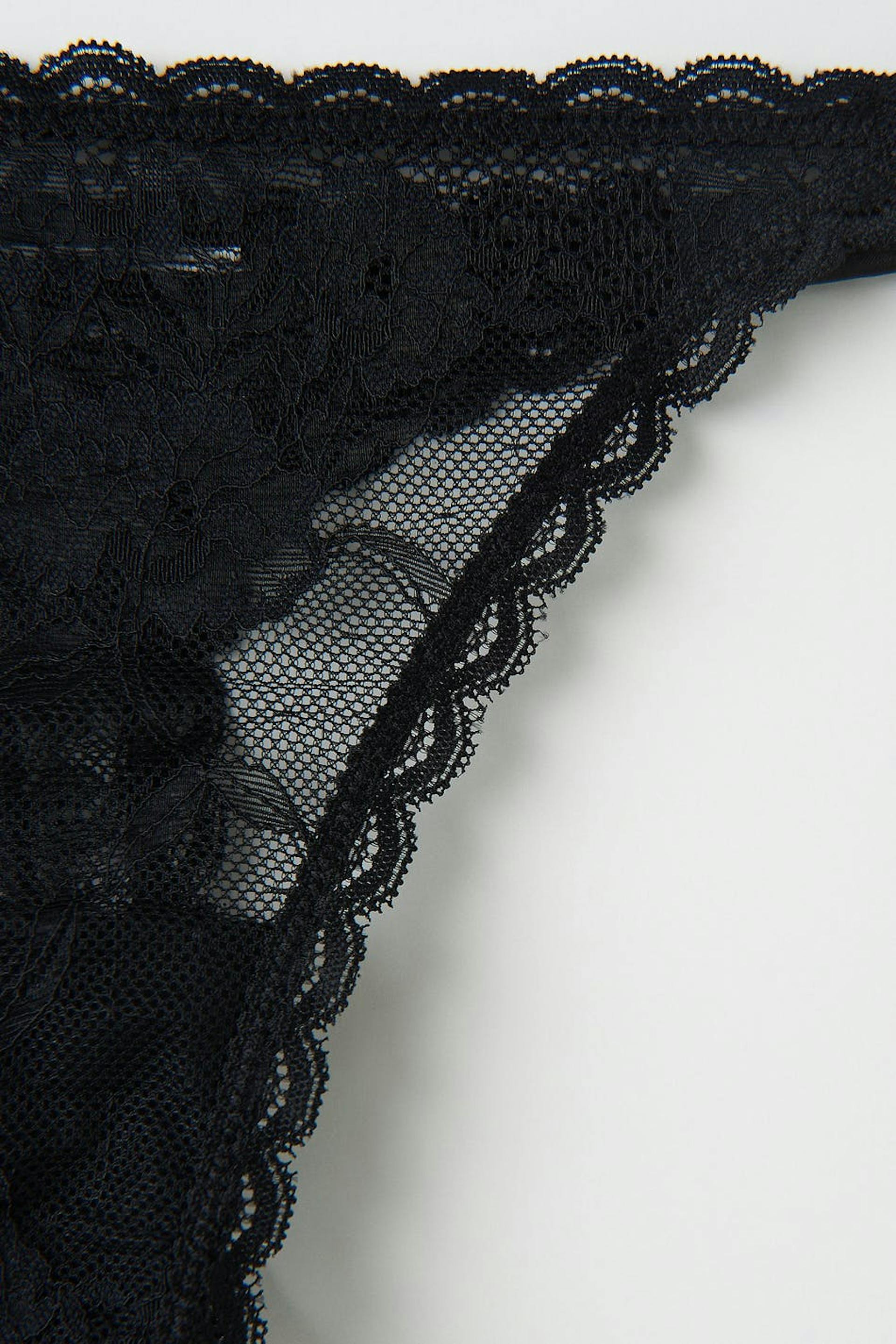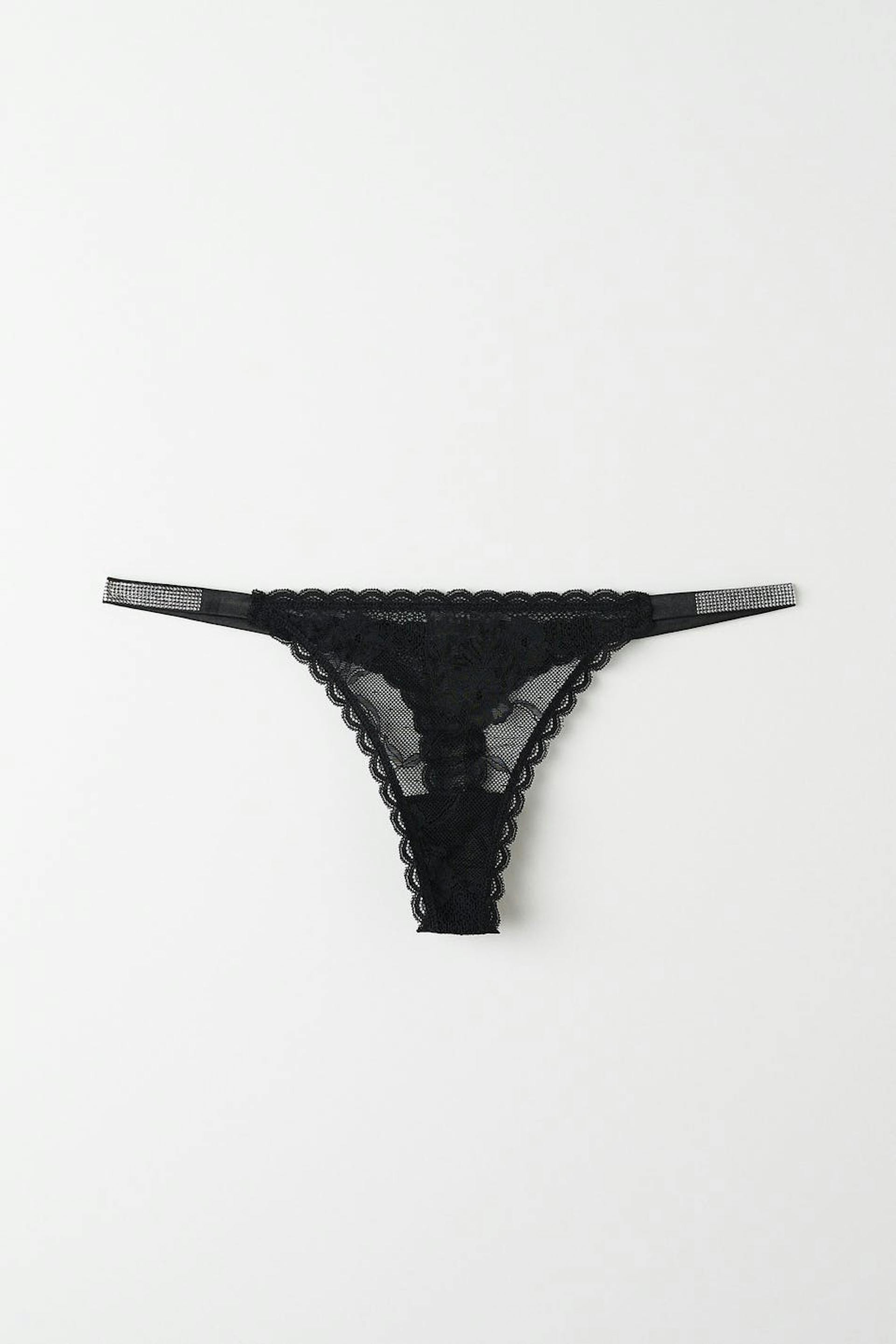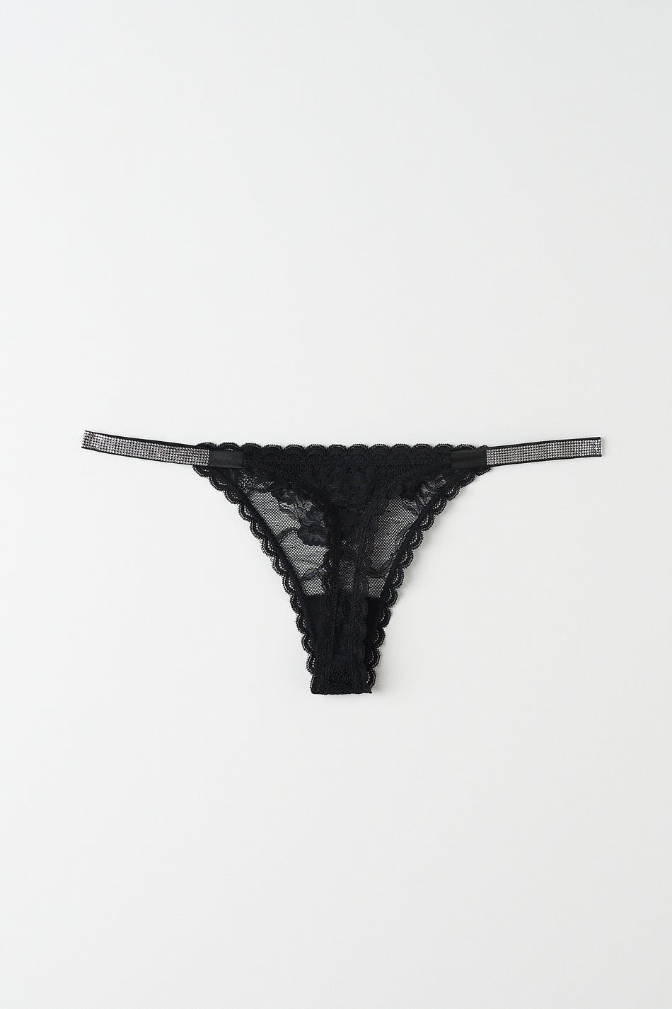 Thongs in lace with crotch lining. The thongs are black and have thin elastic straps with rhinestone in the sides.