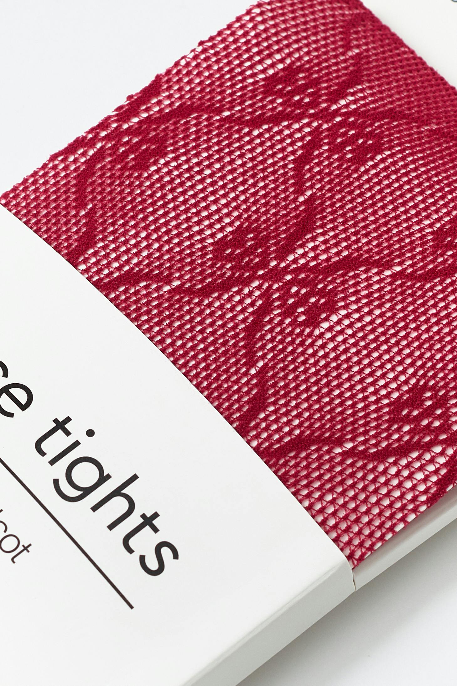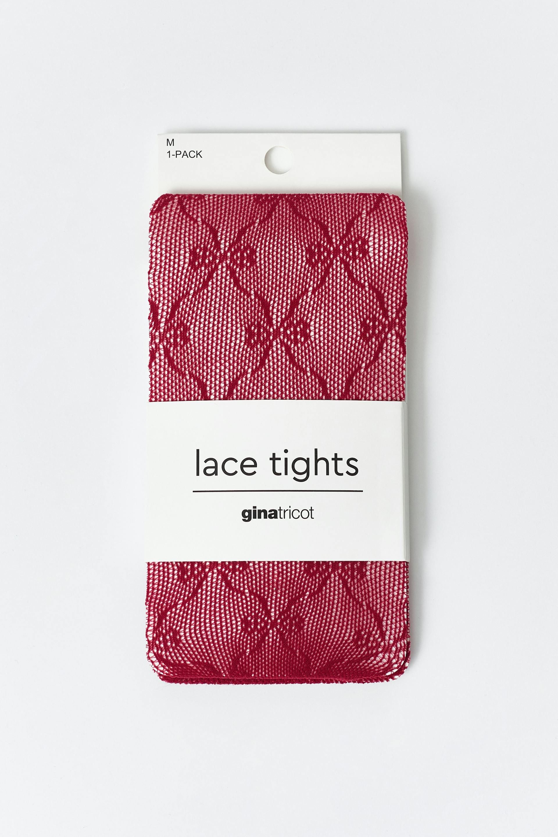 Pantyhoses in lace with small bows. The pantyhoses are red.