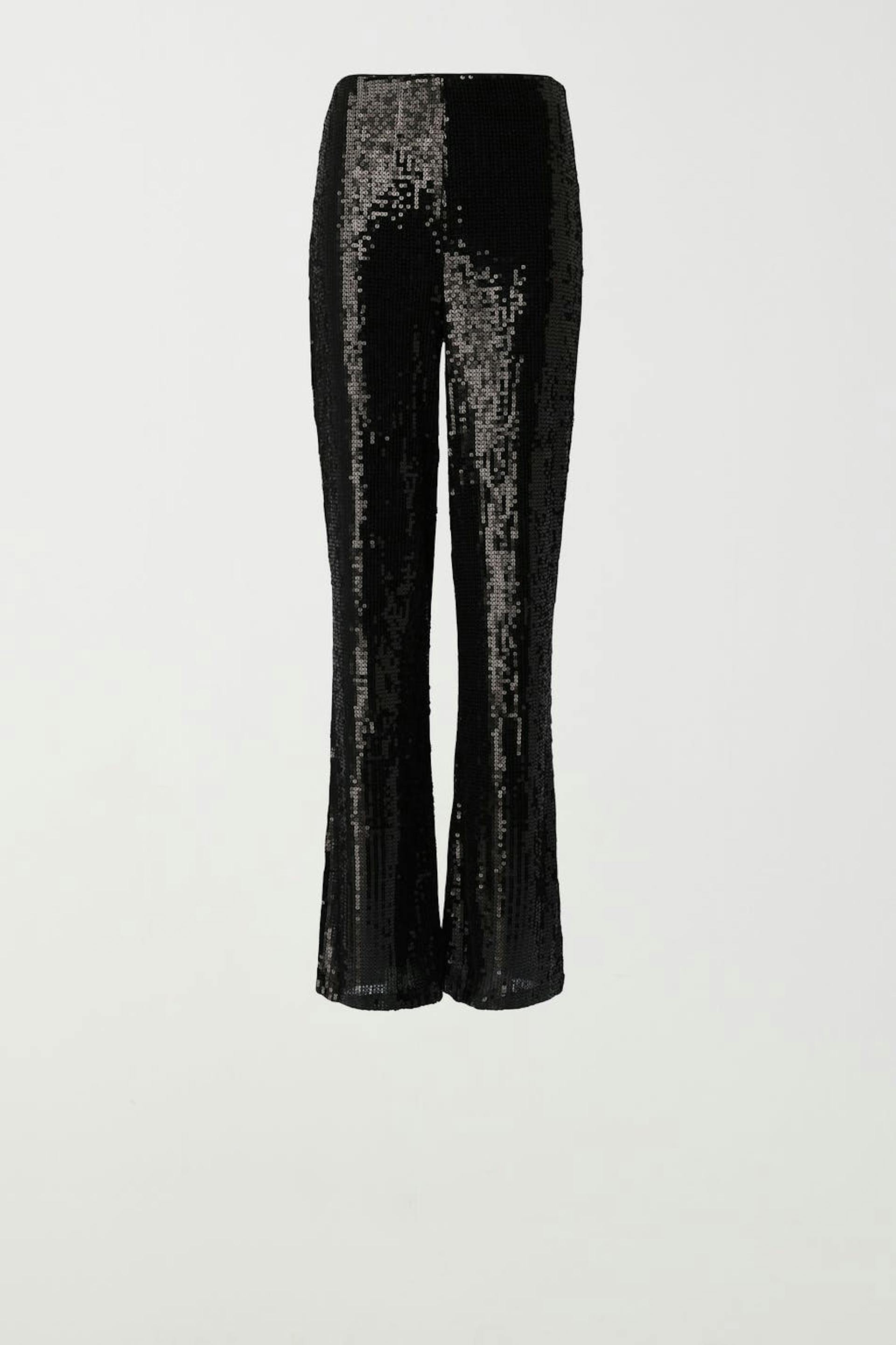 Fully lined sequin trousers with regular fit. The trousers are black and have elastic at the waist.