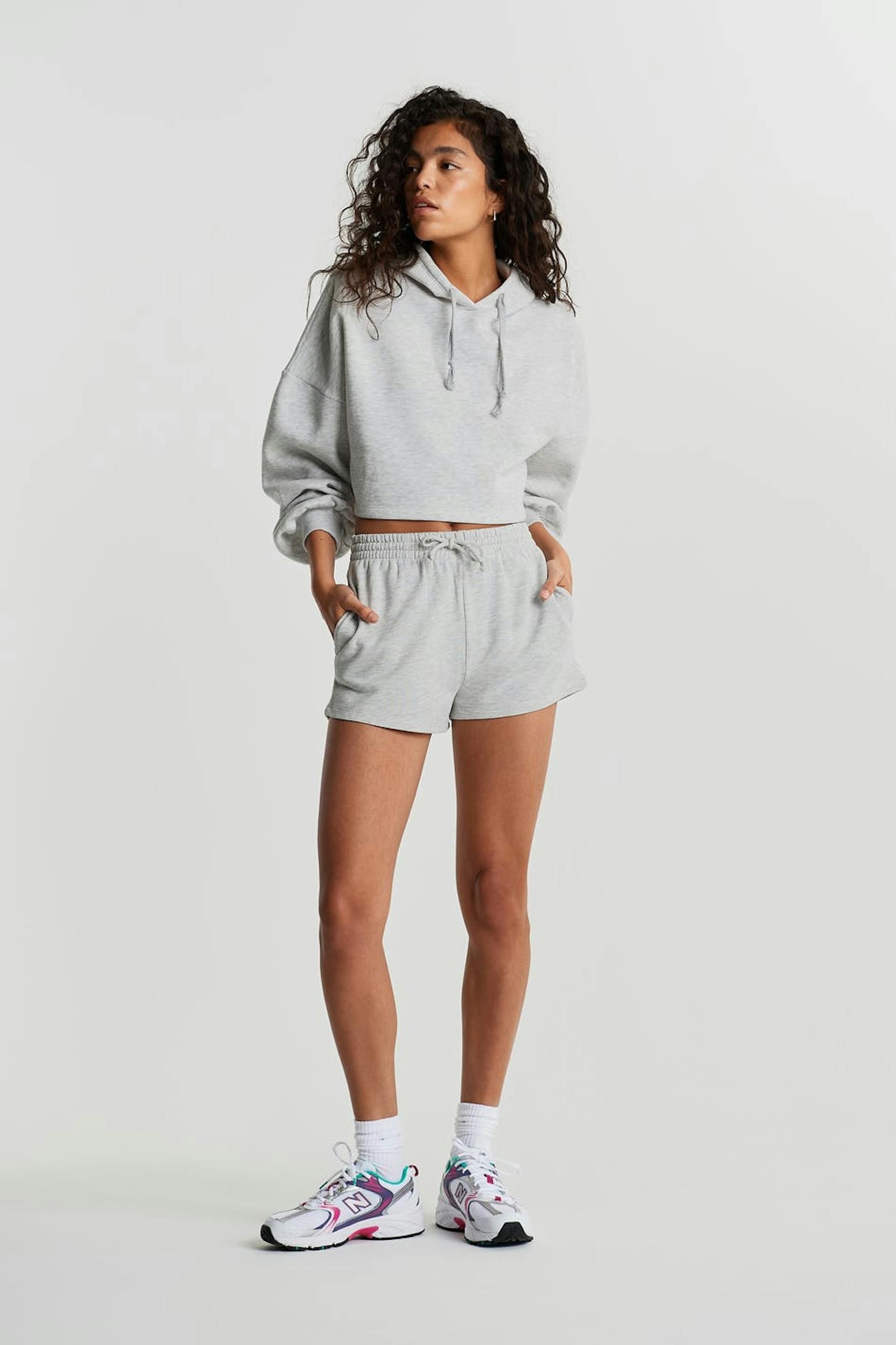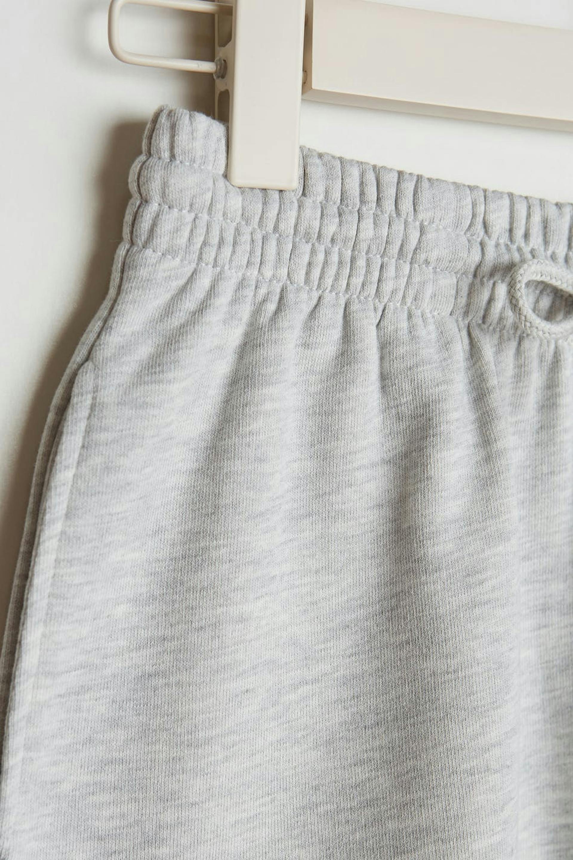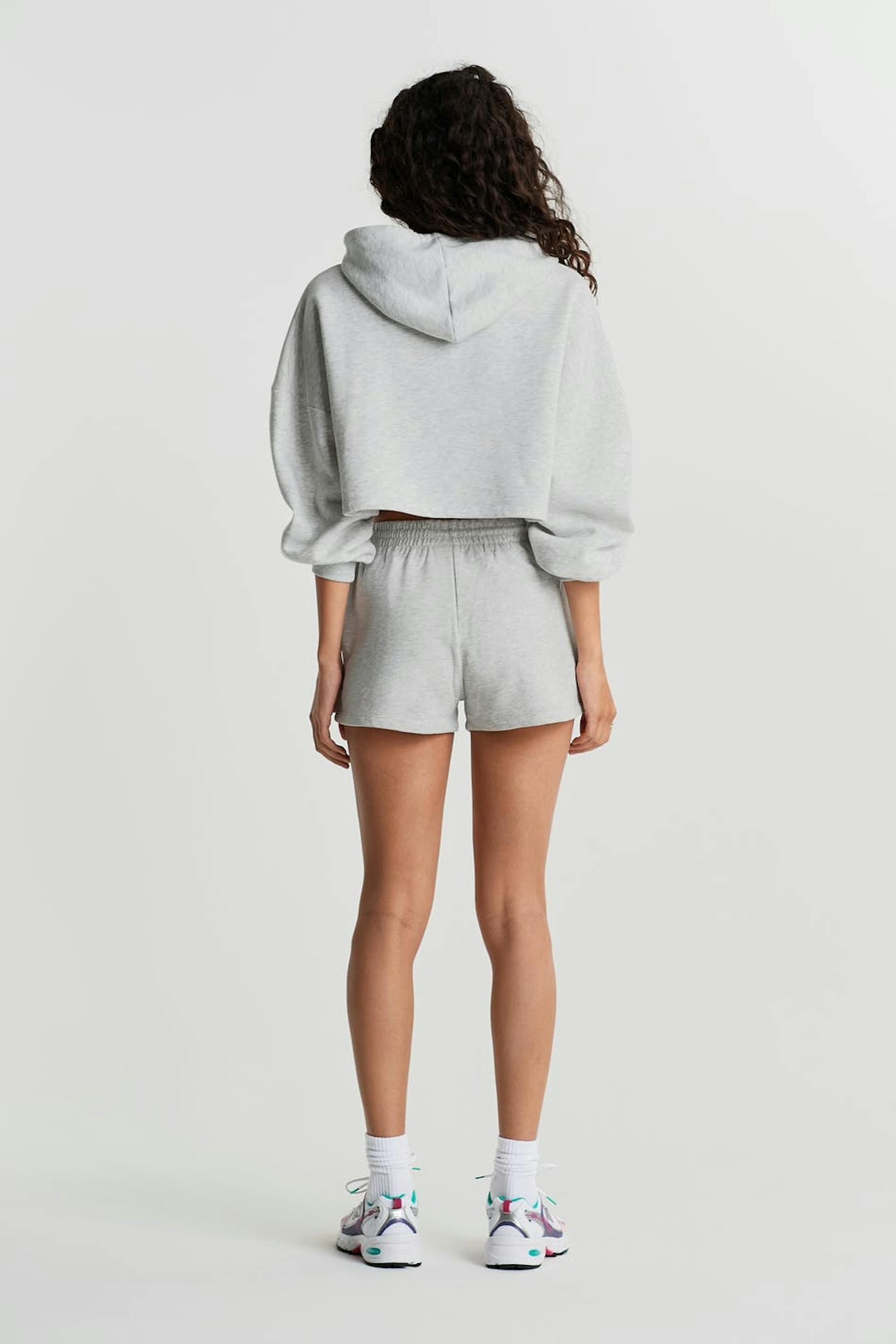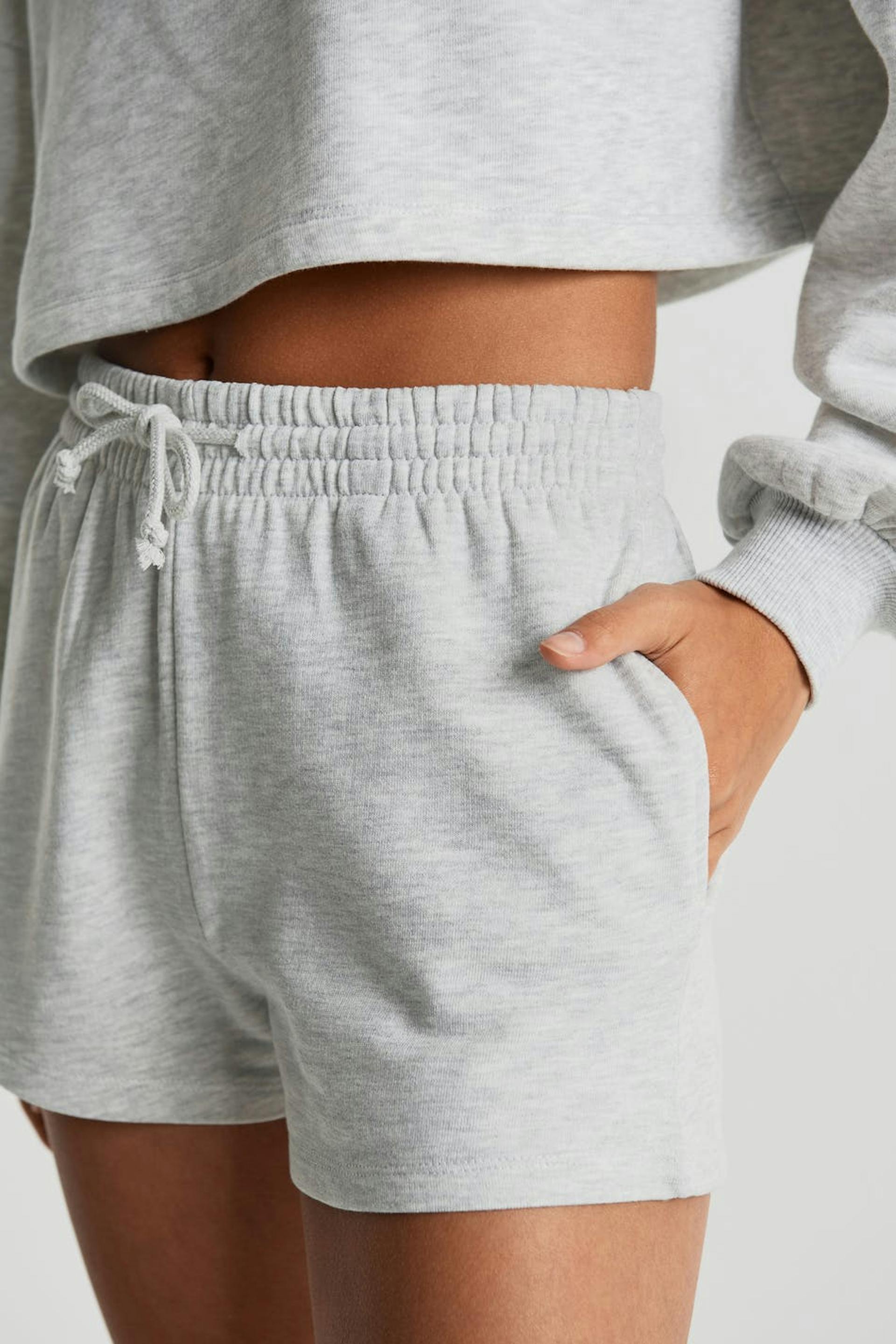Short shorts with a regular fit. The shorts are grey and soft and have a waist in elastic with a drawstring. They are made of sweatshirt fabric.