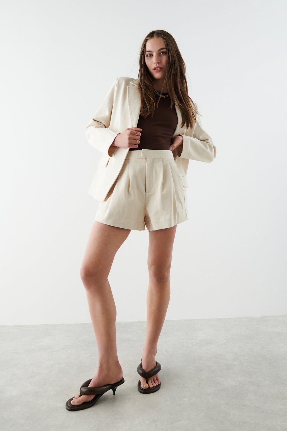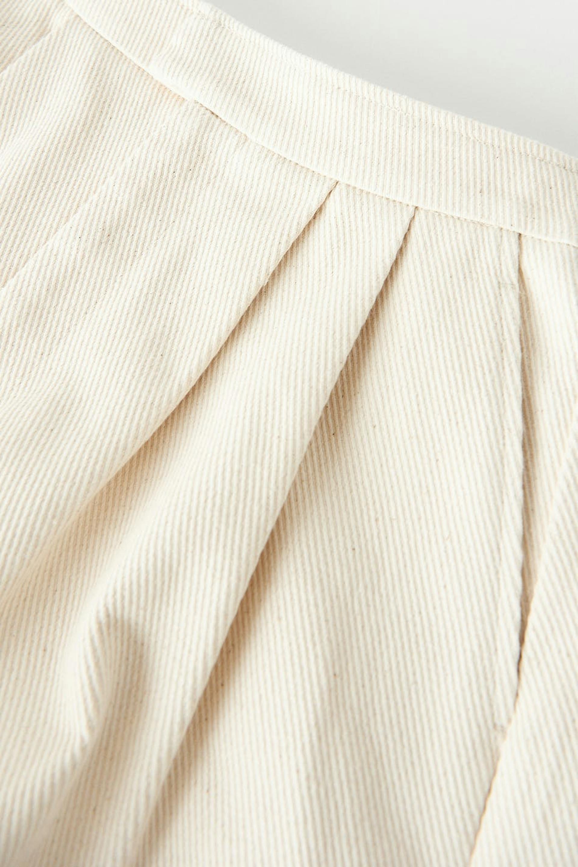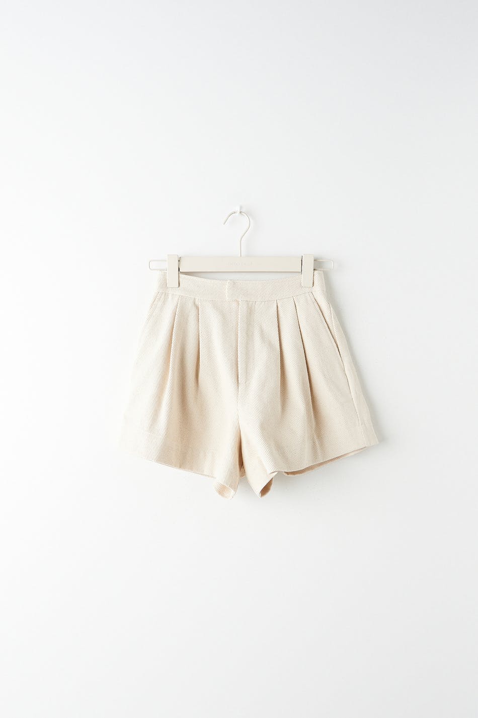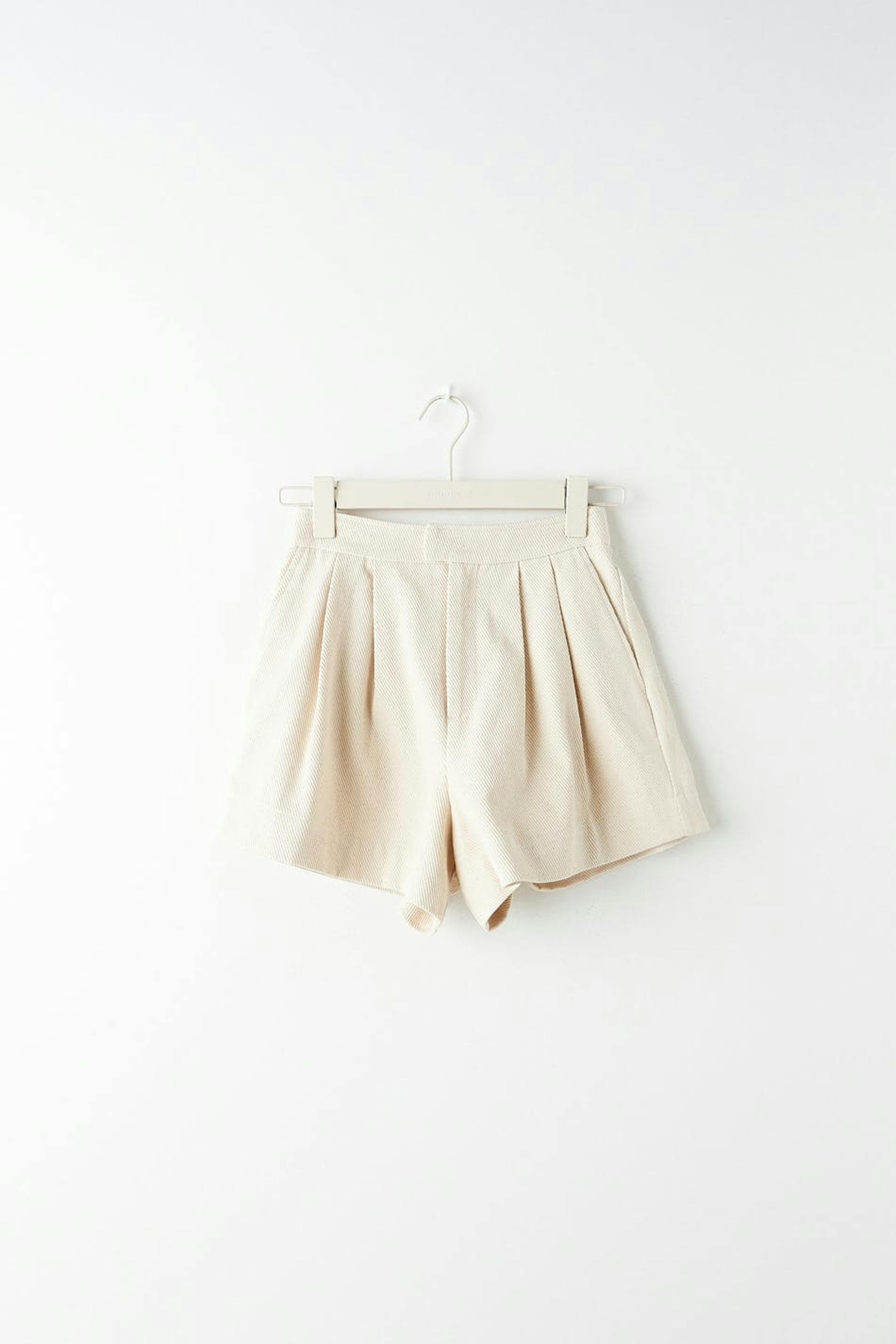 Short shorts with high waist. The shorts are beige, wide and woven. They have side pockets, pleats at the front, zip fly and elastic at the waist.