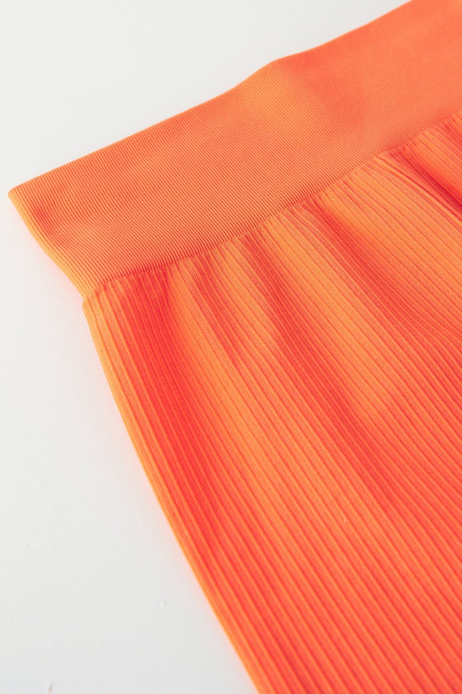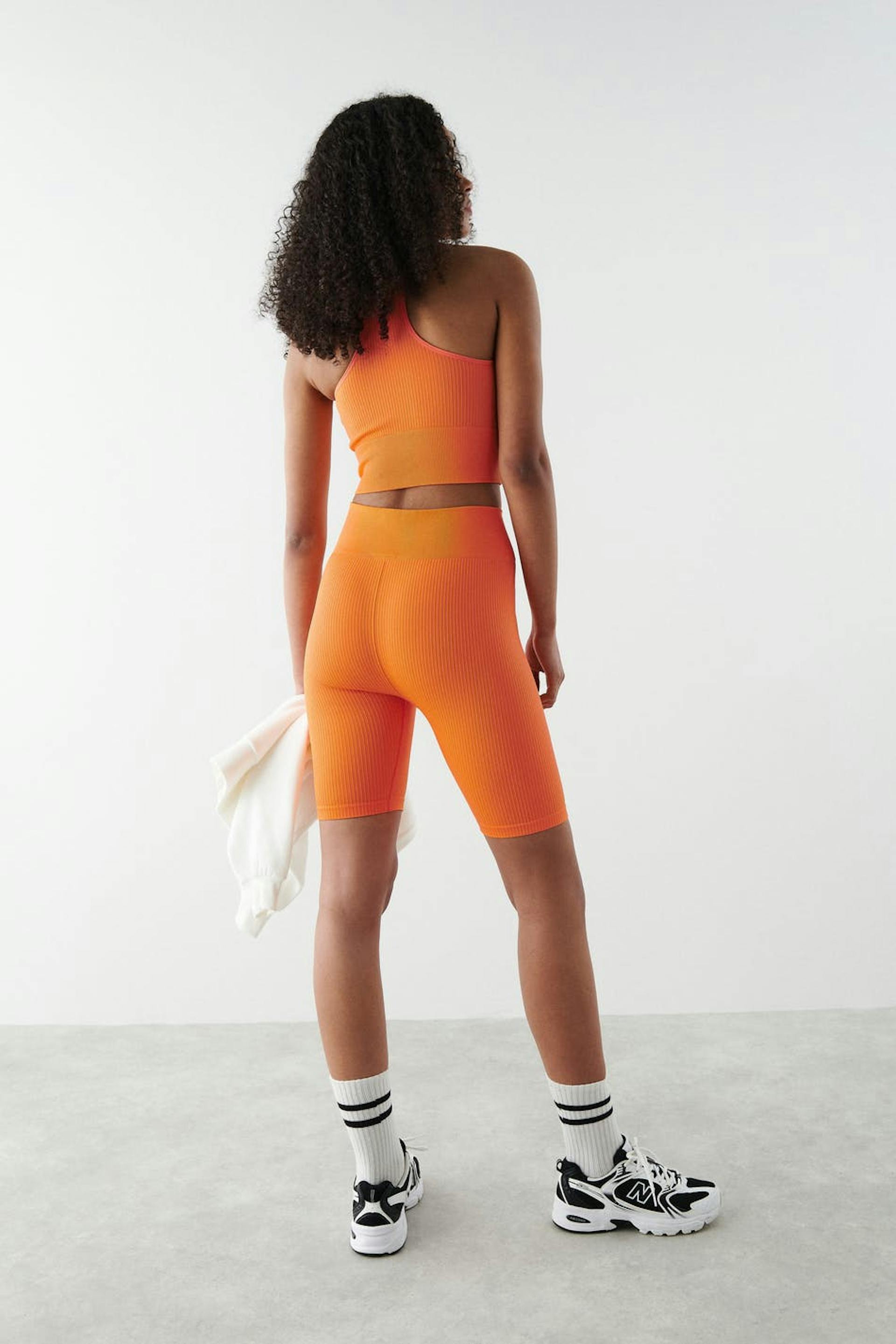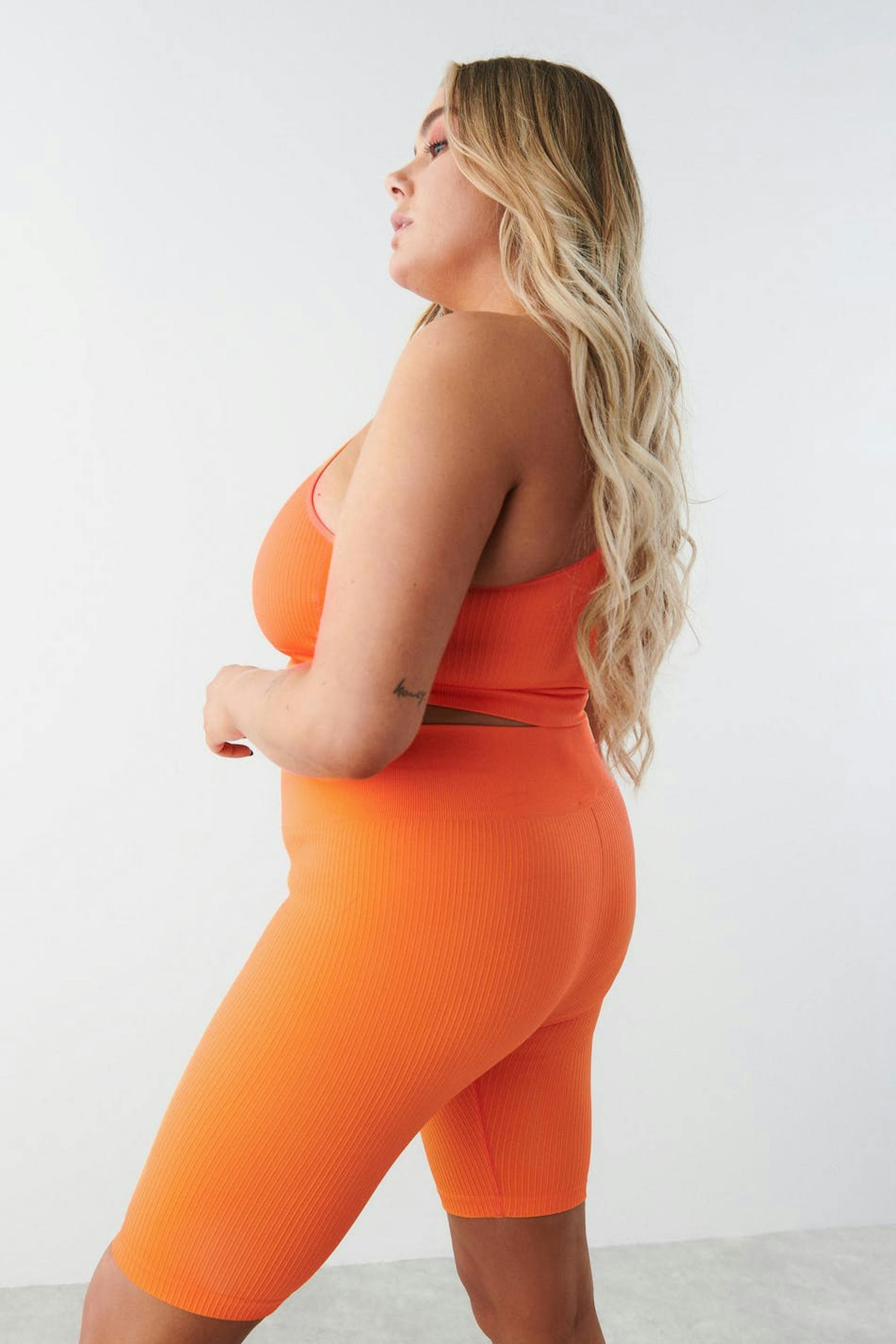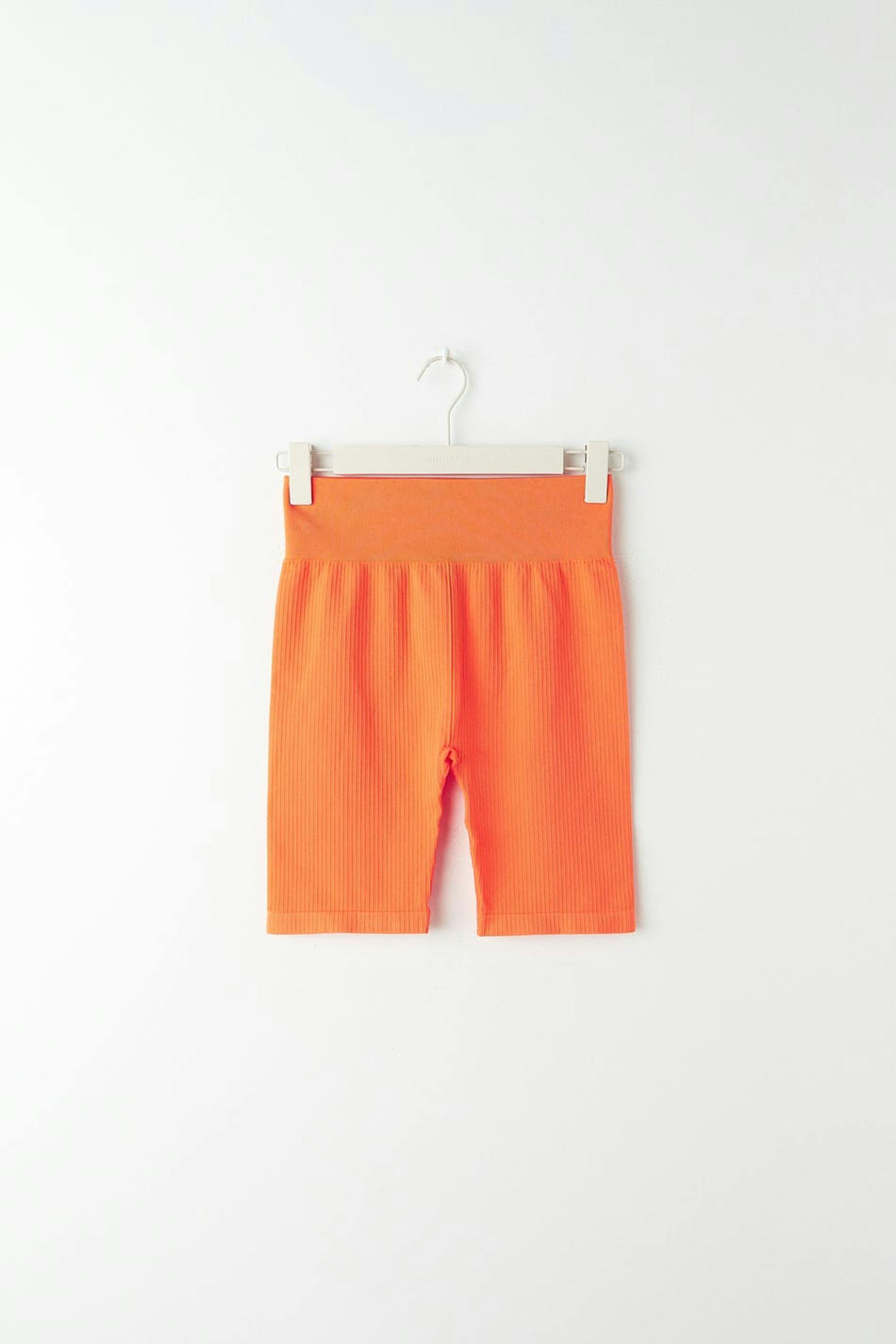 Ribbed cycling shorts with high waist. The shorts are orange and have a stretchy quality in jersey. They have a fitted fit and elastic at the waist.