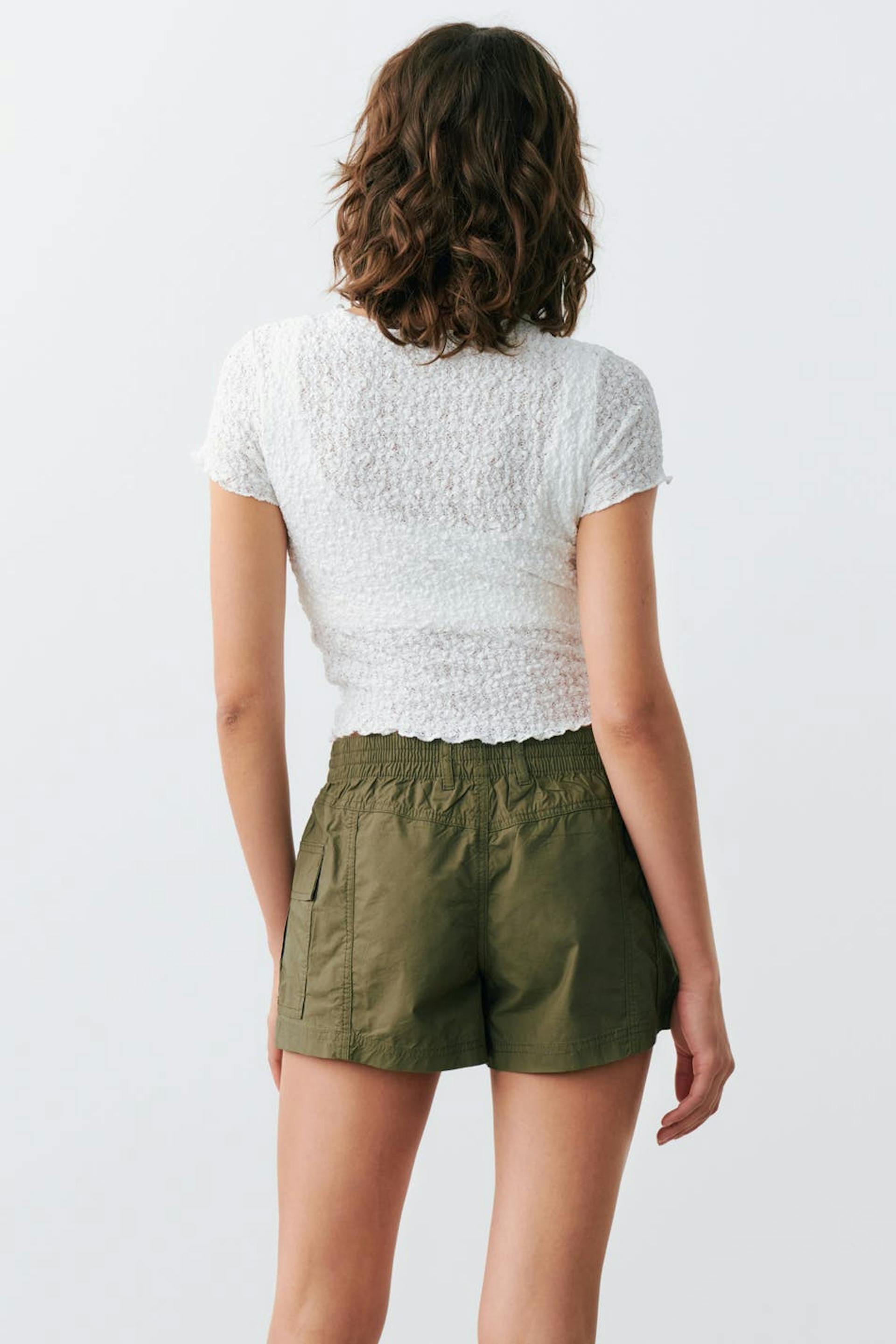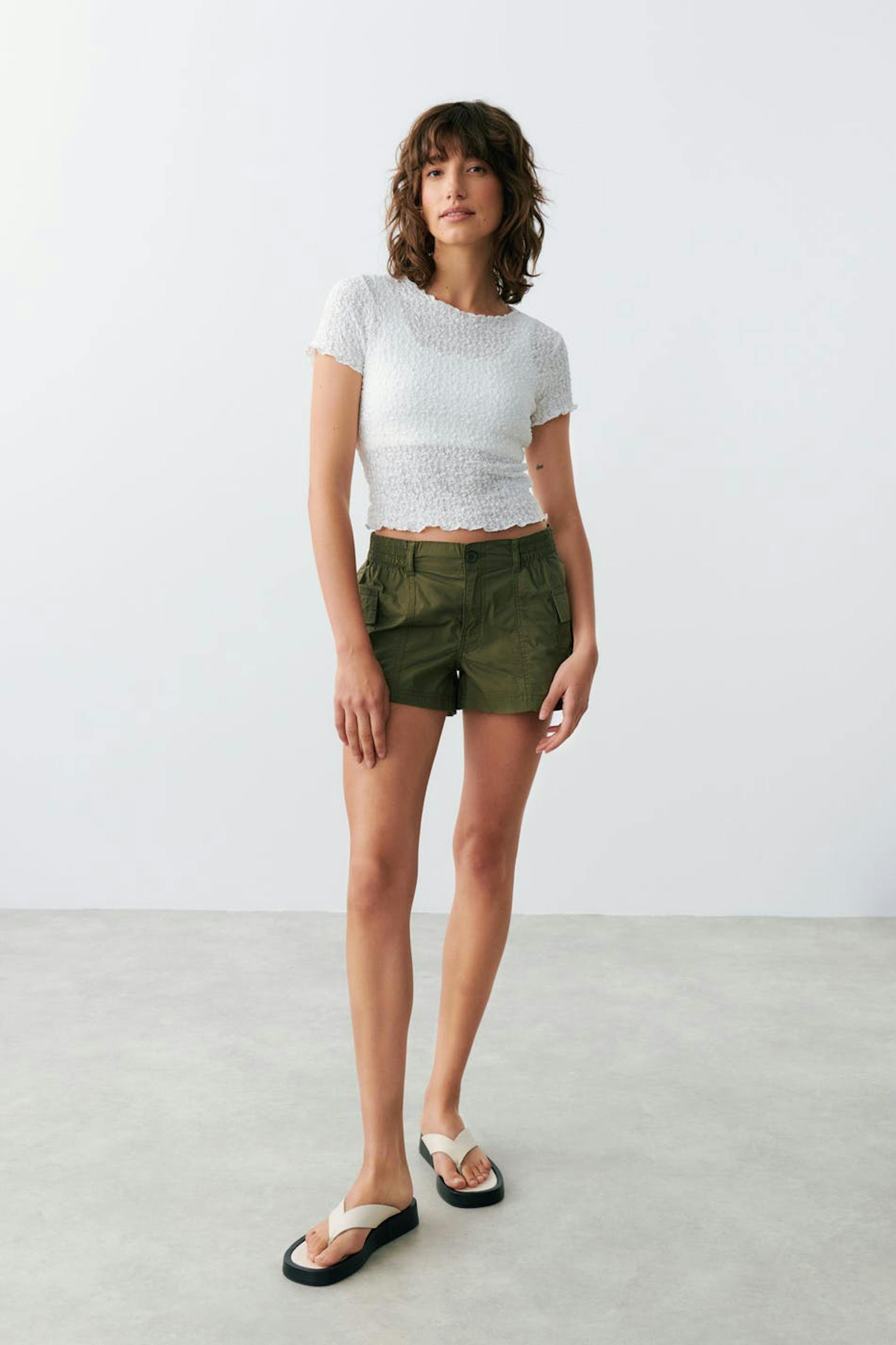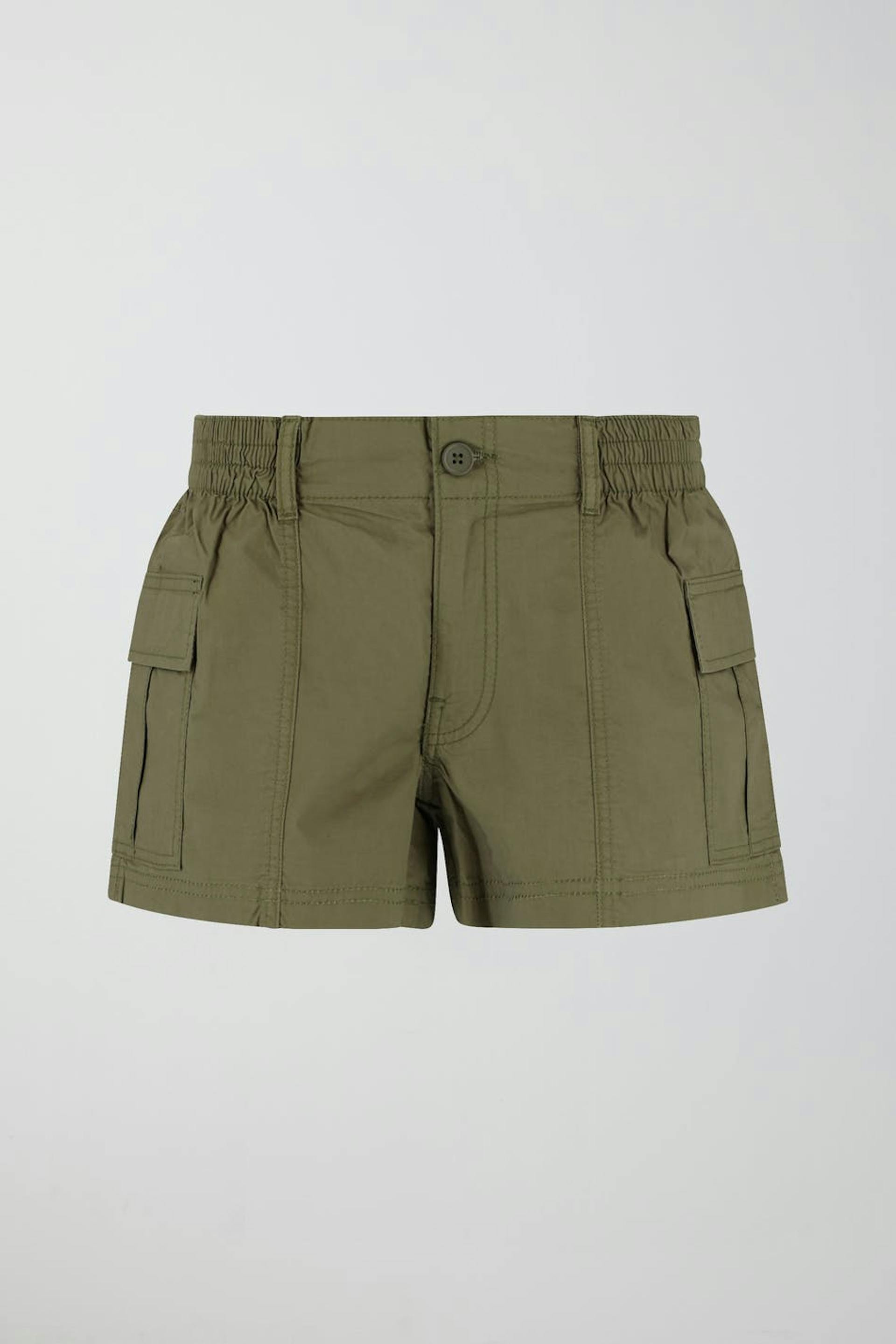 Short shorts with cargo pockets in the sides. The shorts are green and have elastic at the waist. They have zip fly and waistband with belt loops.