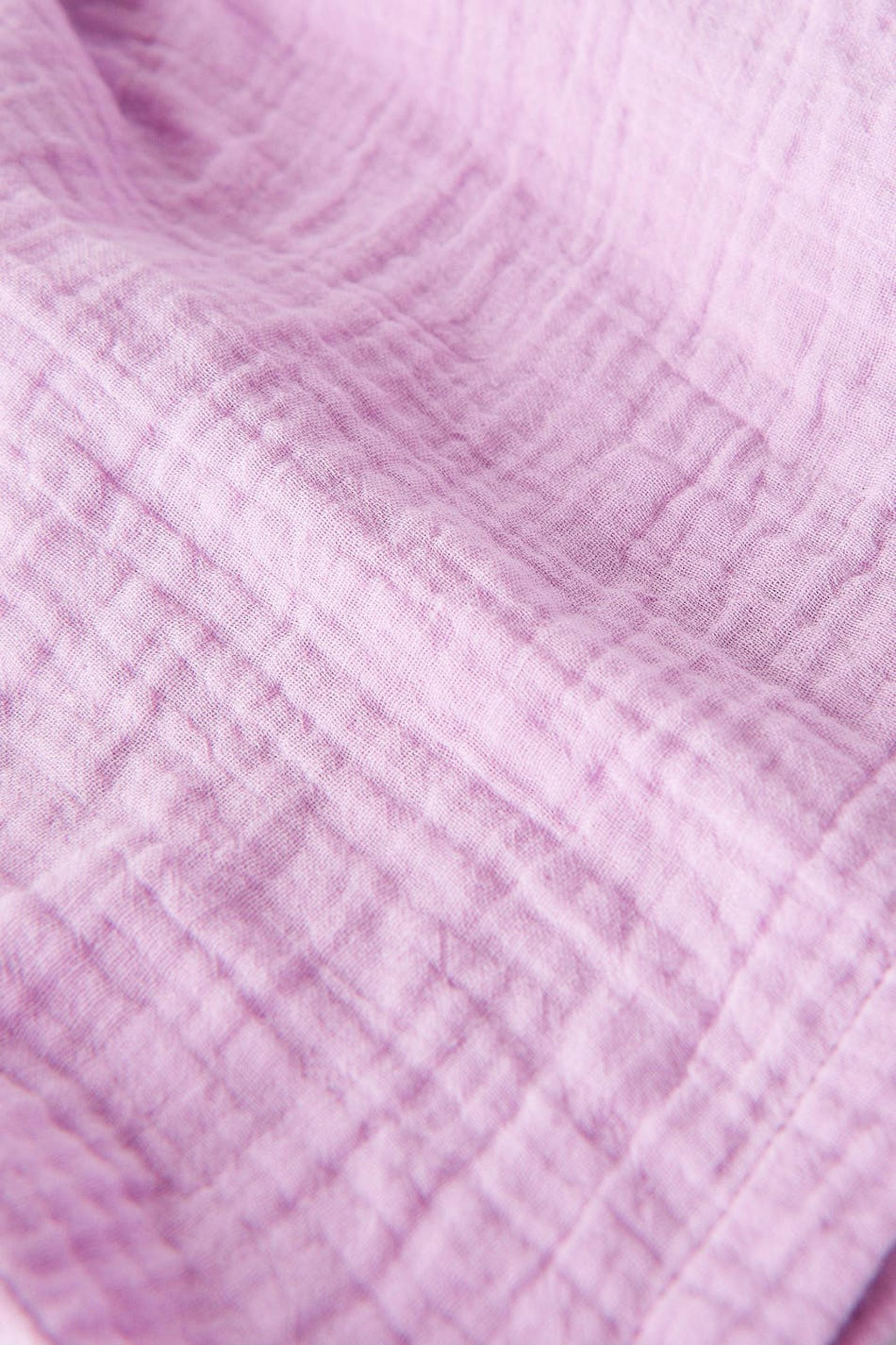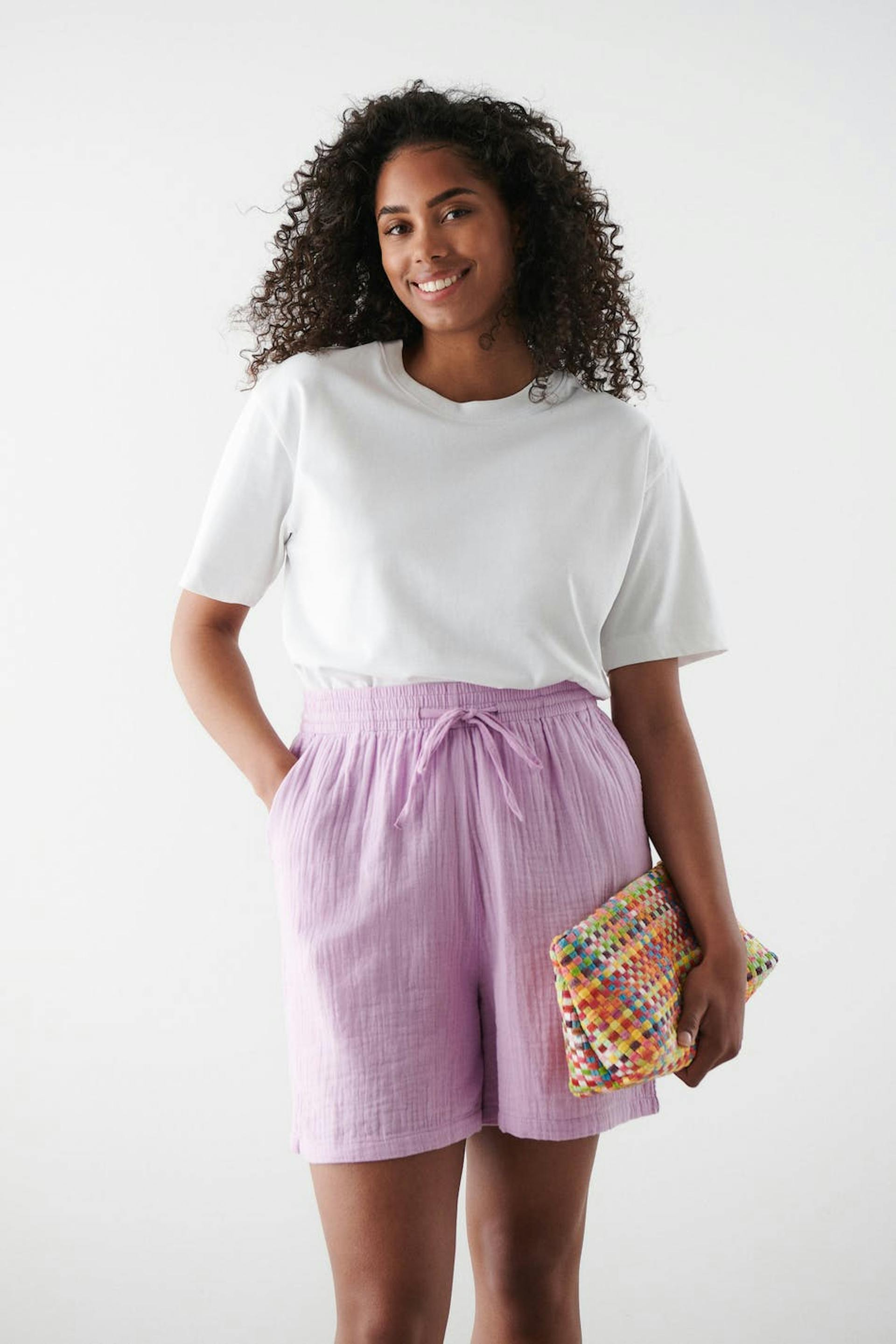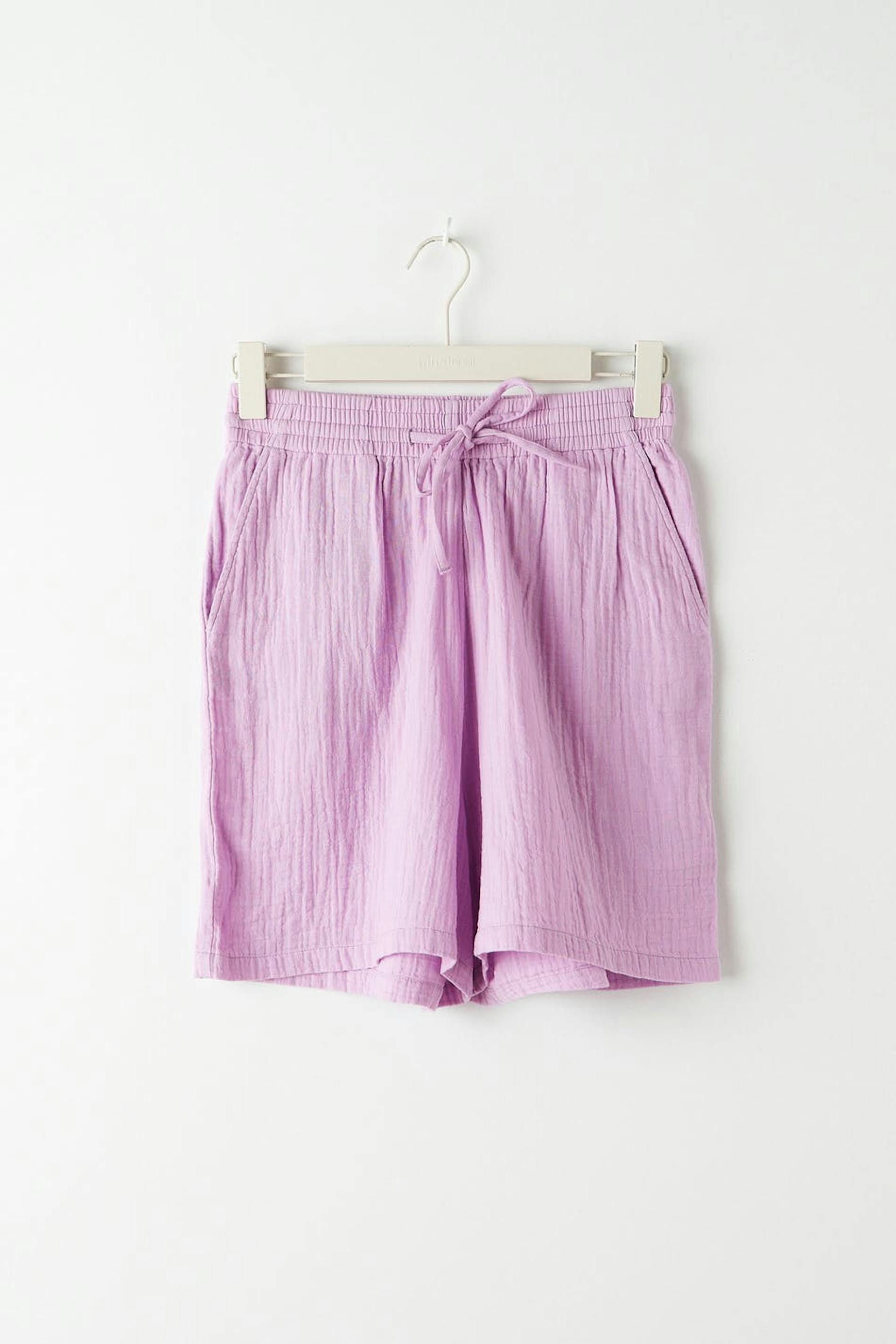 Soft shorts in woven cotton fabric with high waist. The shorts are purple and have pockets on the sides. They have elastic at the waist with self-tie drawstring.