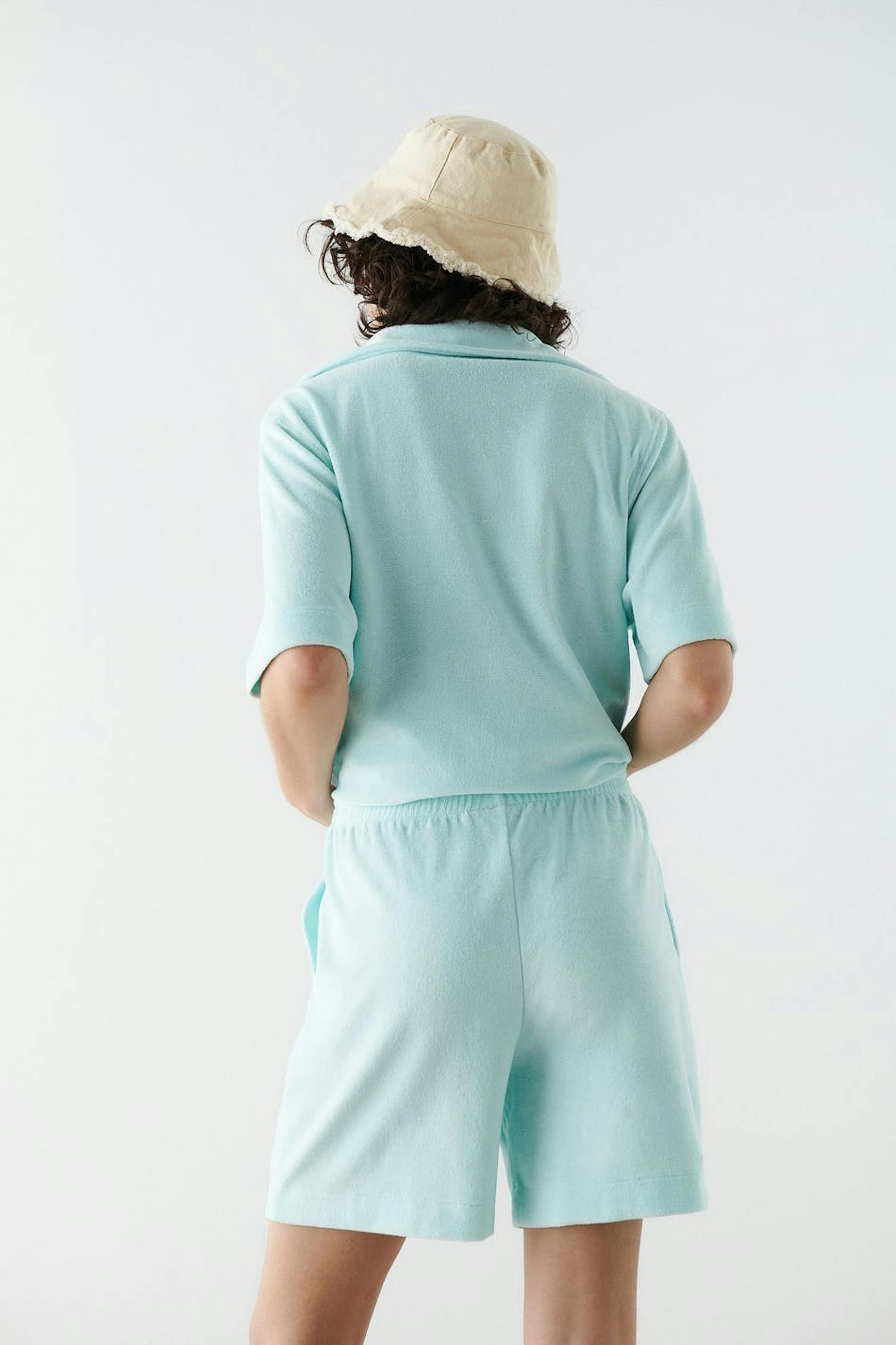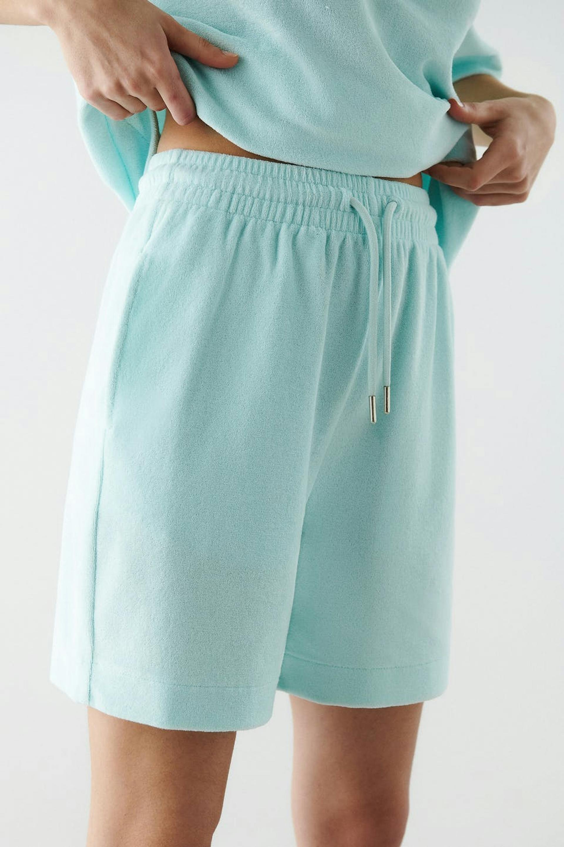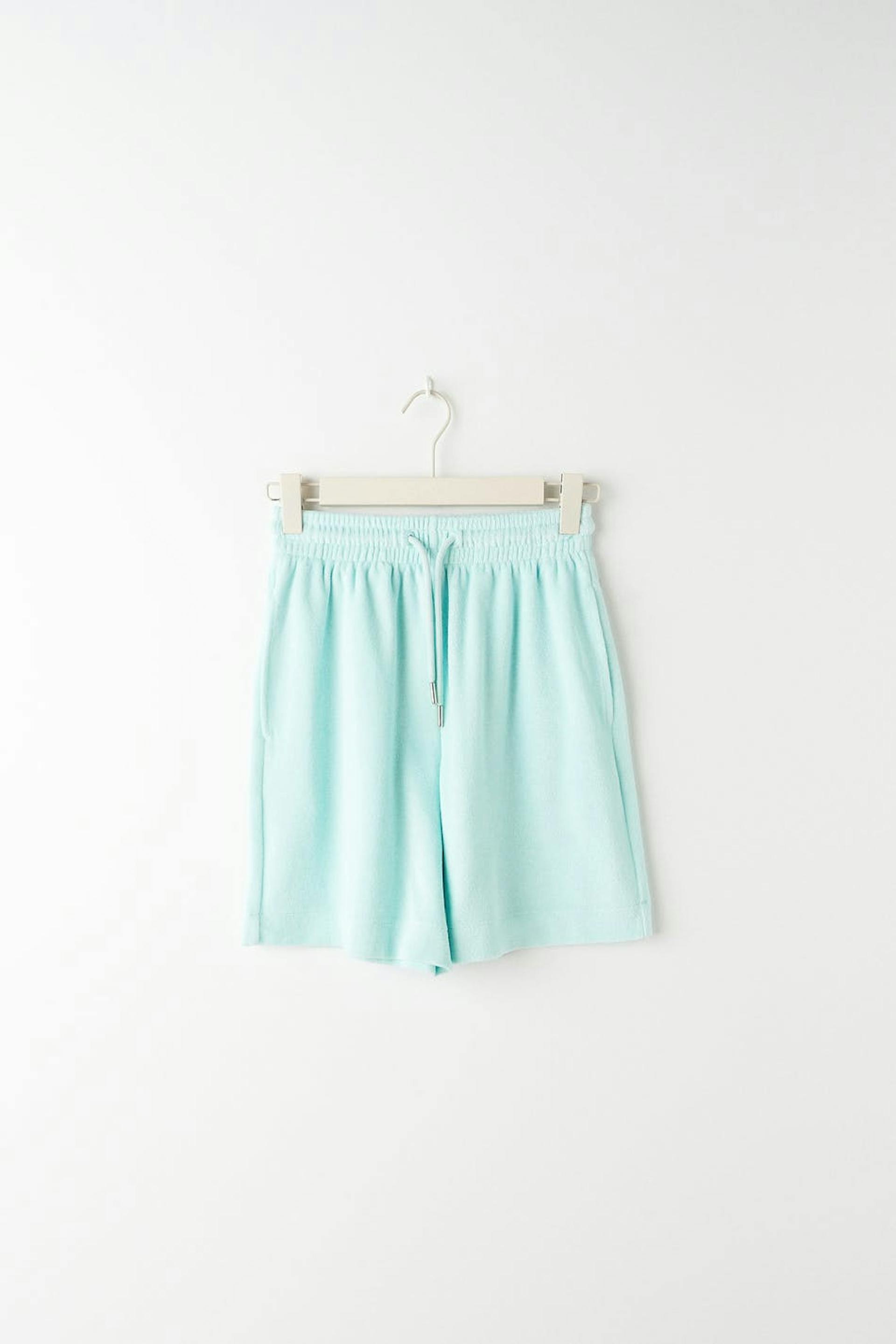 Shorts with an oversize fit. The shorts are blue and have a generous fit. They have a tie string at the waist, an elastic band at the waist and pockets on the sides.