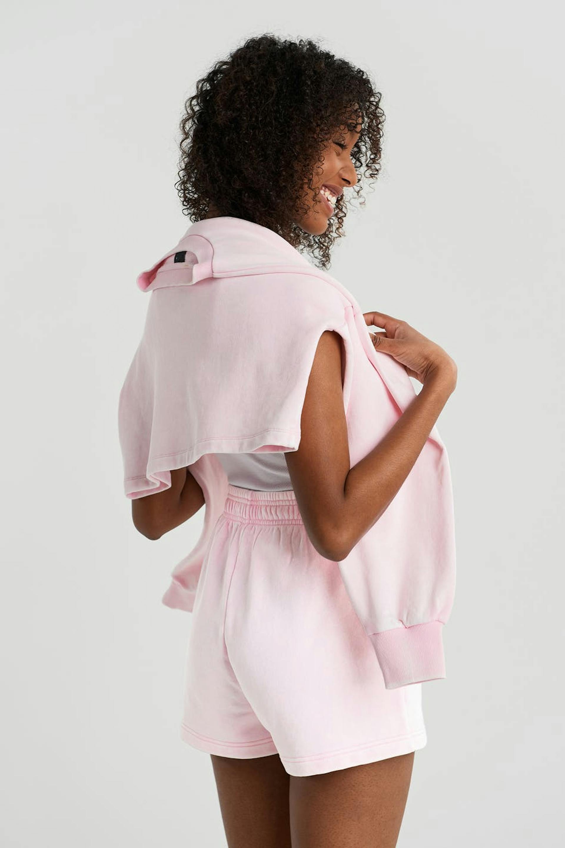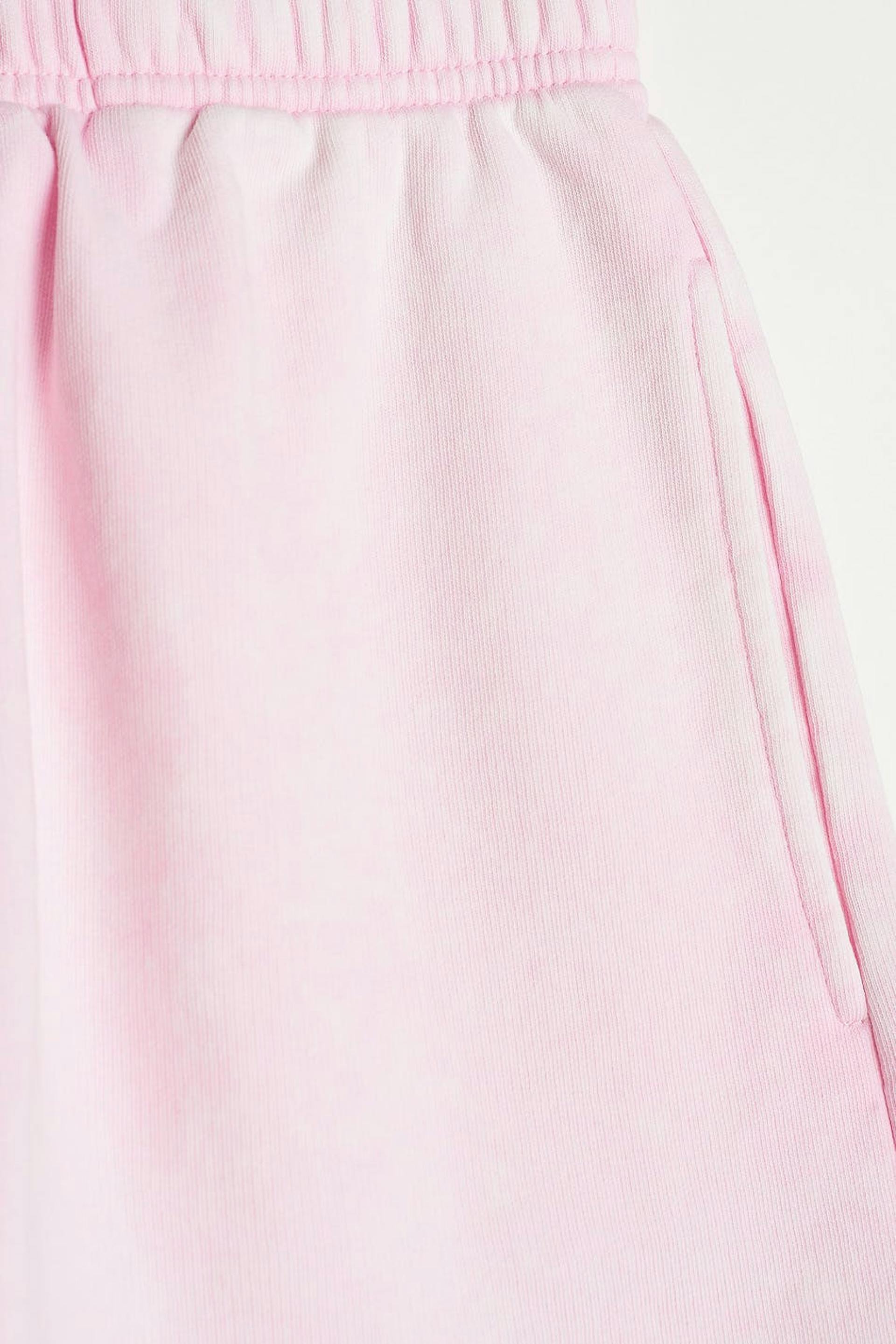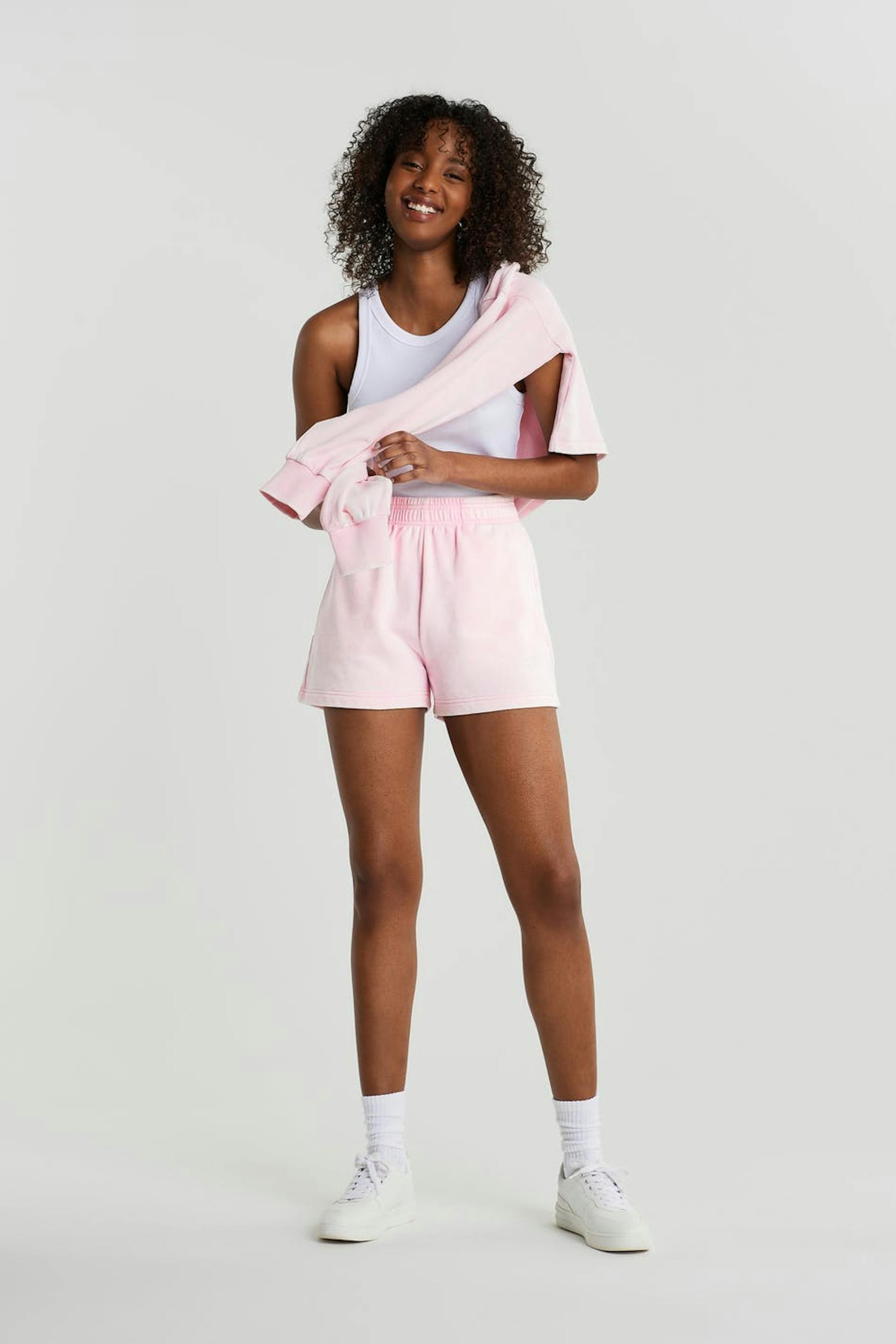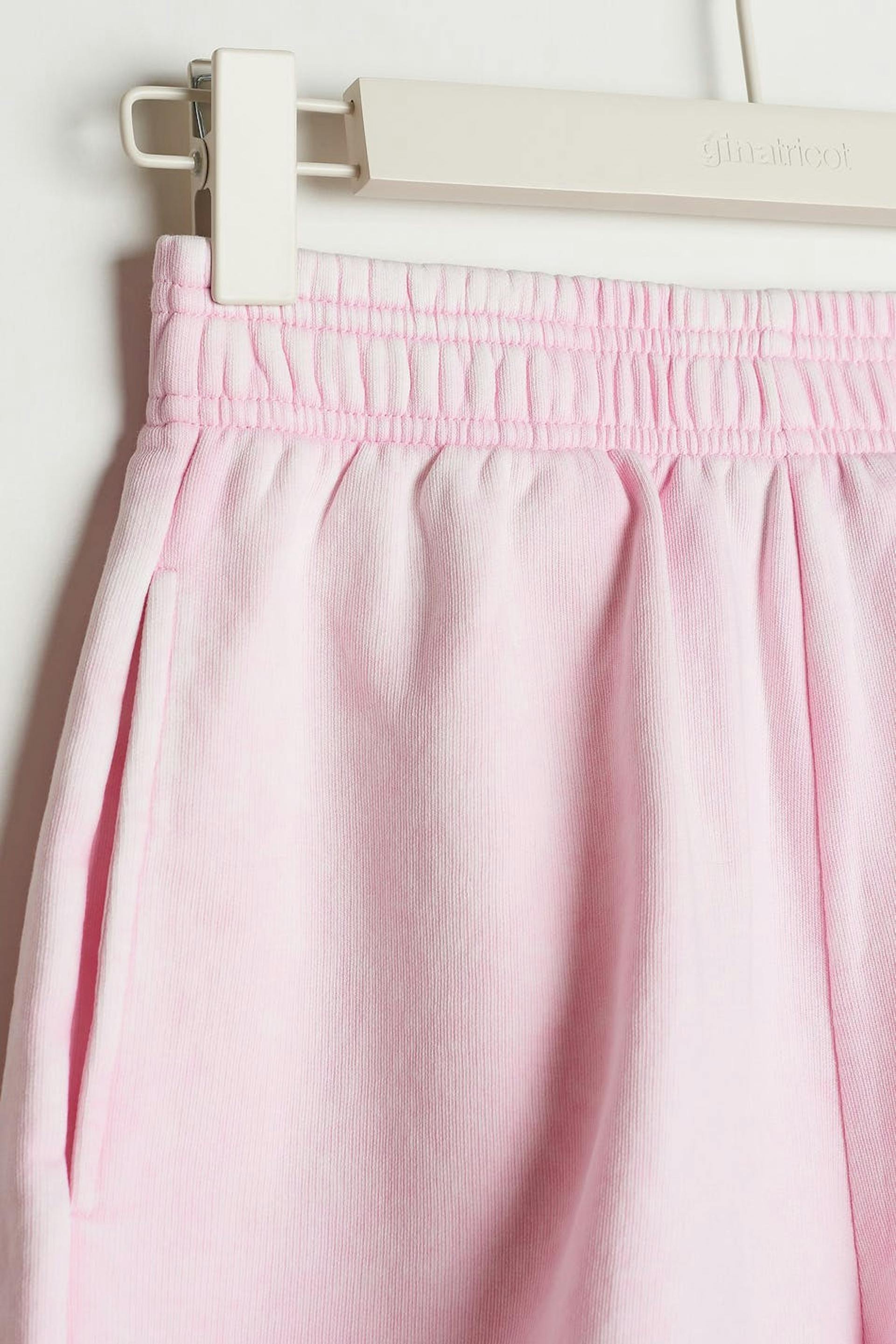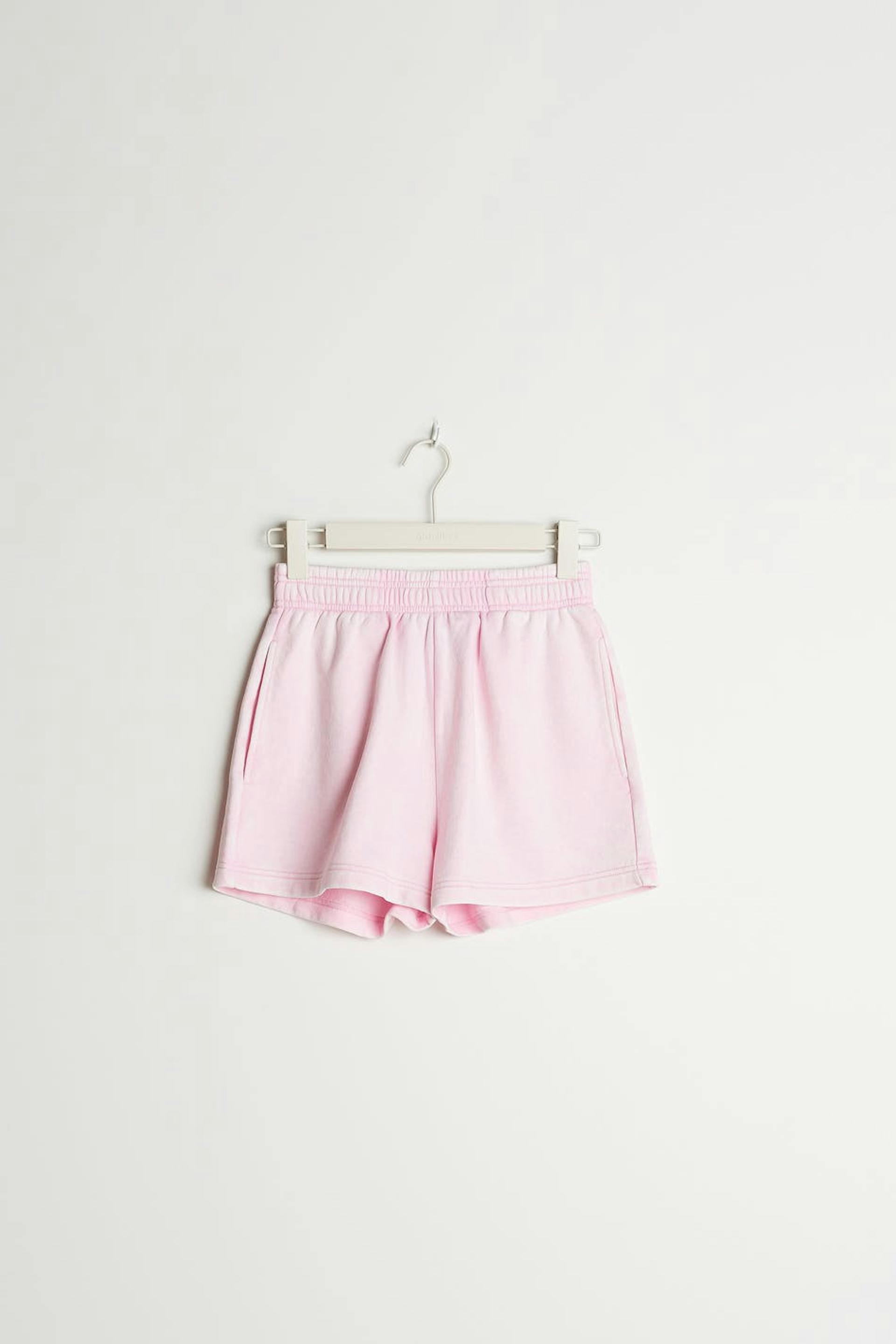 Soft shorts with a high waist with an elastic and a self-tie on the inside. The shorts are pink and short and have side pockets.