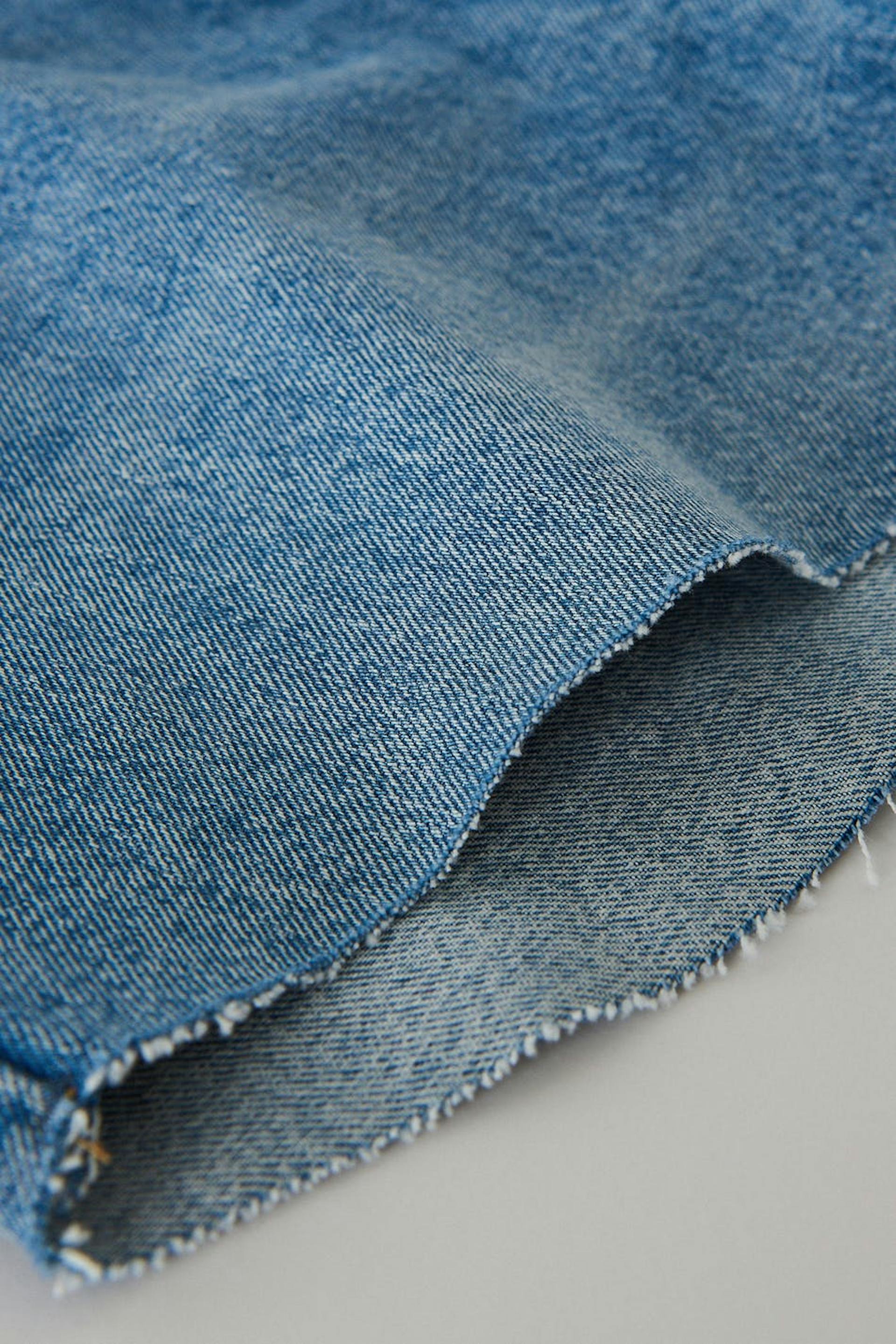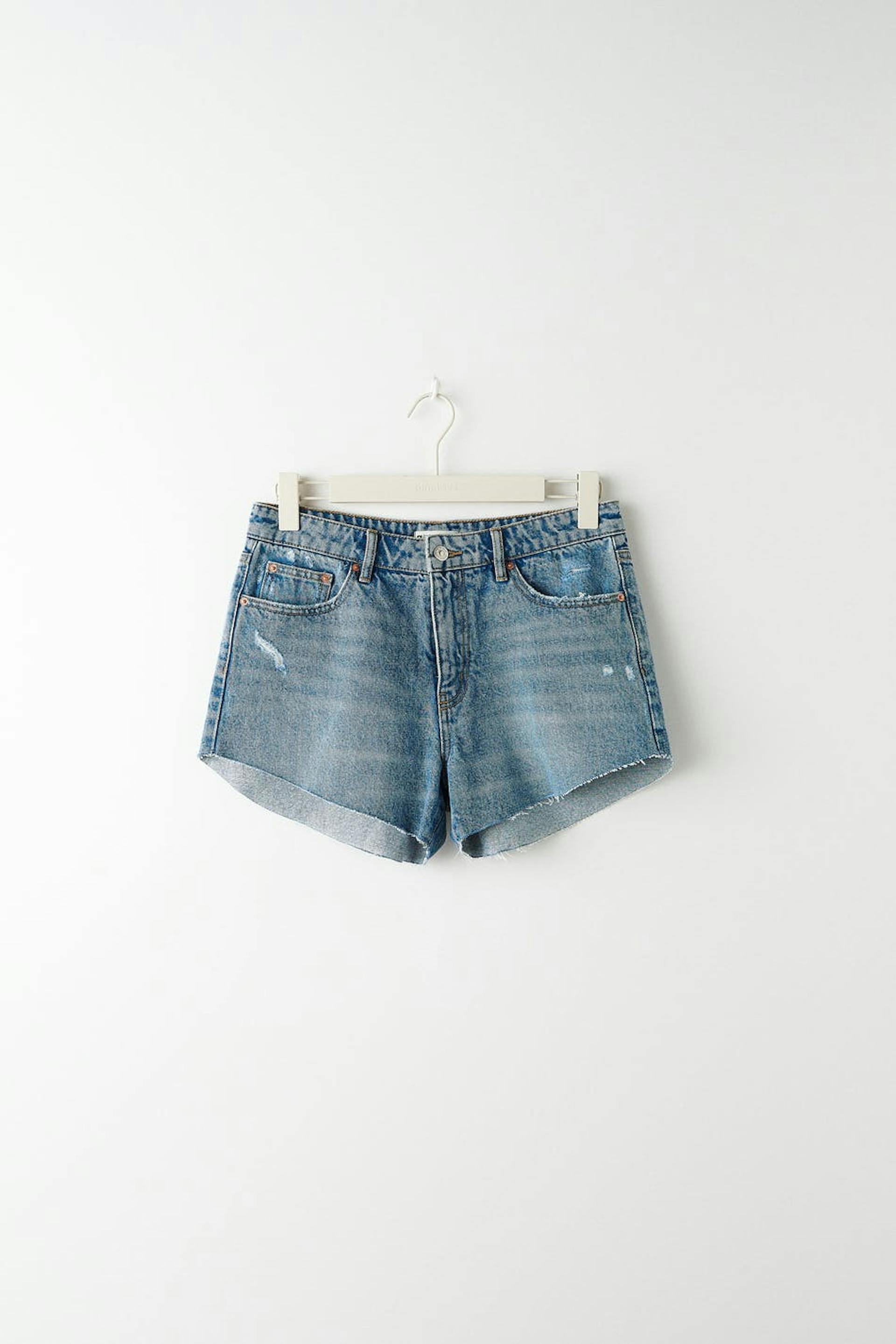 Short denim shorts with a regular fit. The shorts are blue and have a mid waist. They have a raw edge at the bottom and pockets at the front and back.