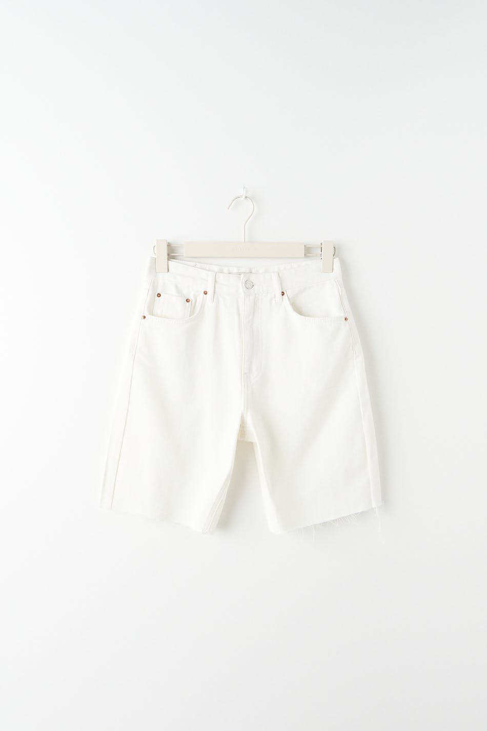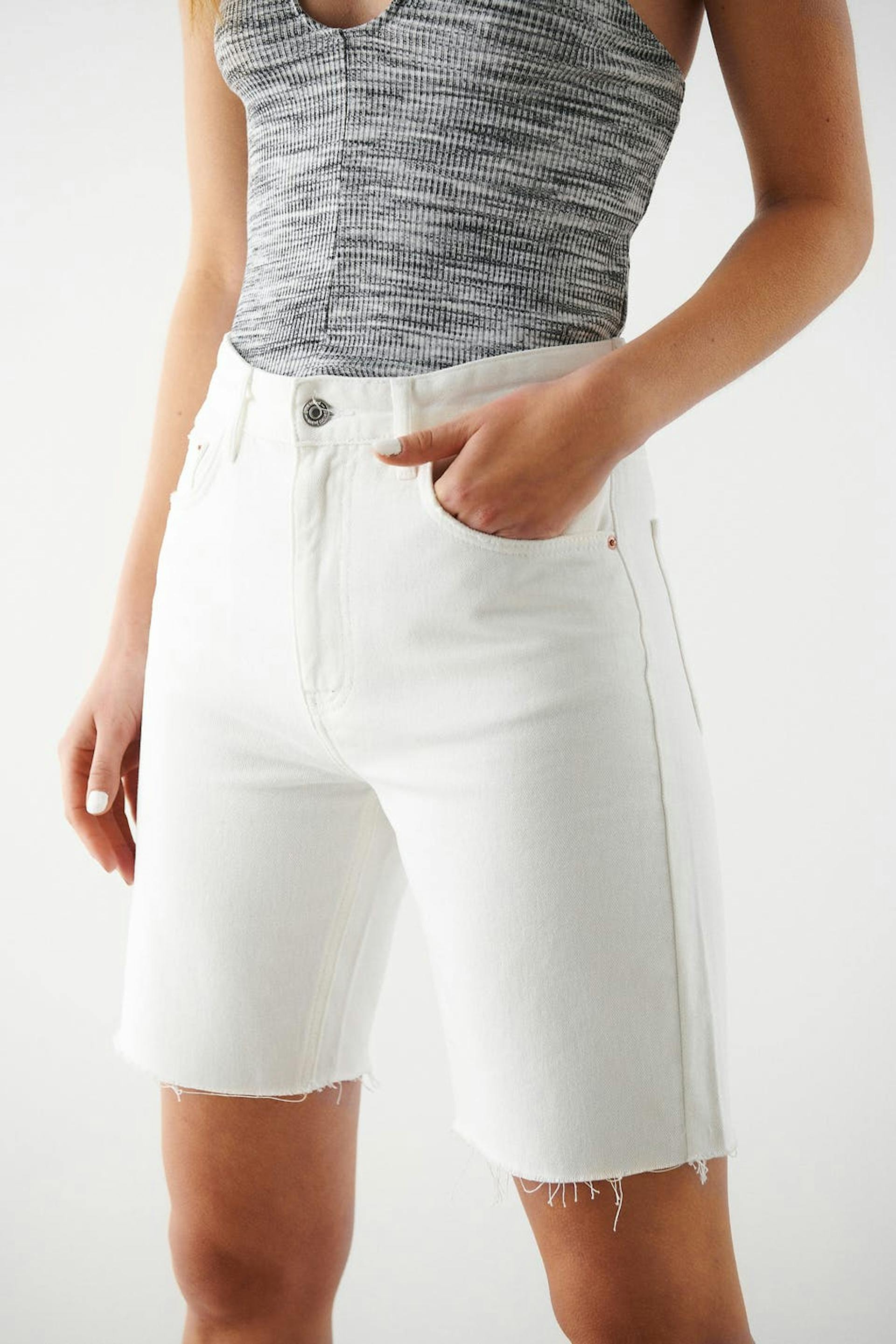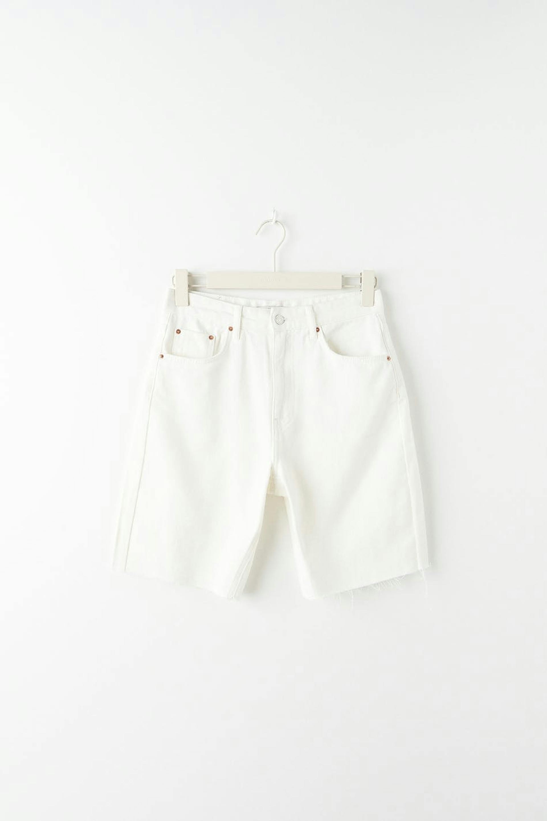 Bermuda shorts with high waist. The shorts are white and have a long, straight fit in non-stretch denim. They have a raw hem at the bottom and pockets at the front and back.