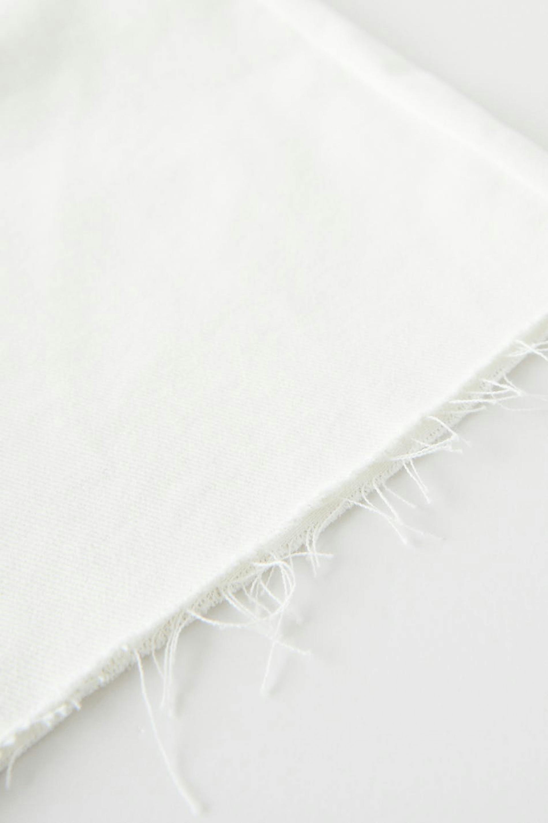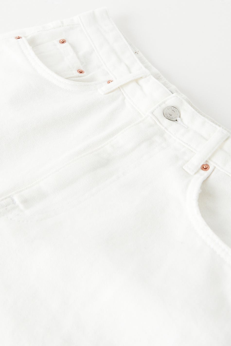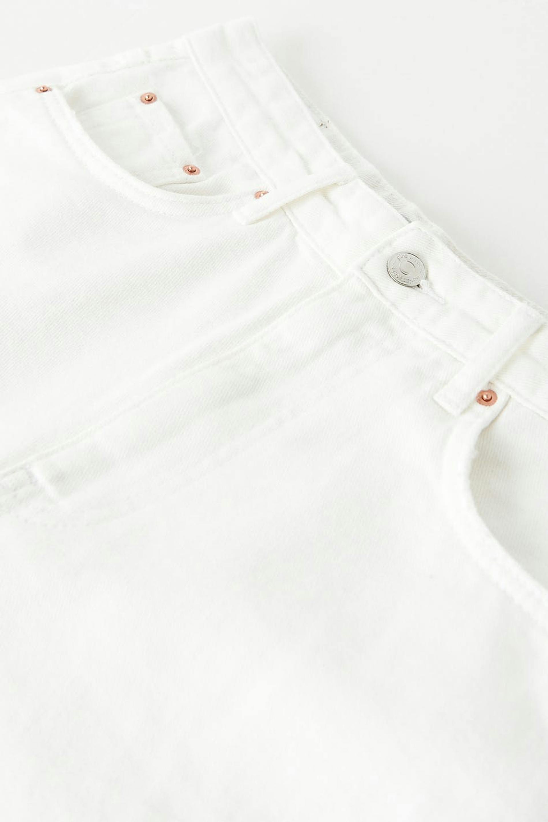 Bermuda shorts with high waist. The shorts are white and have a long, straight fit in non-stretch denim. They have a raw hem at the bottom and pockets at the front and back.
