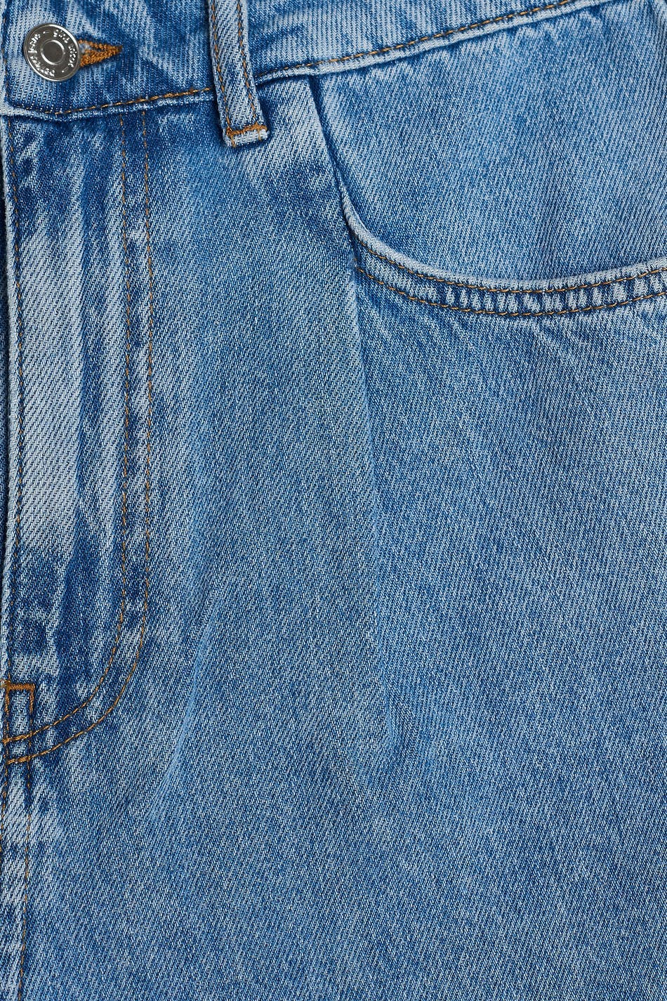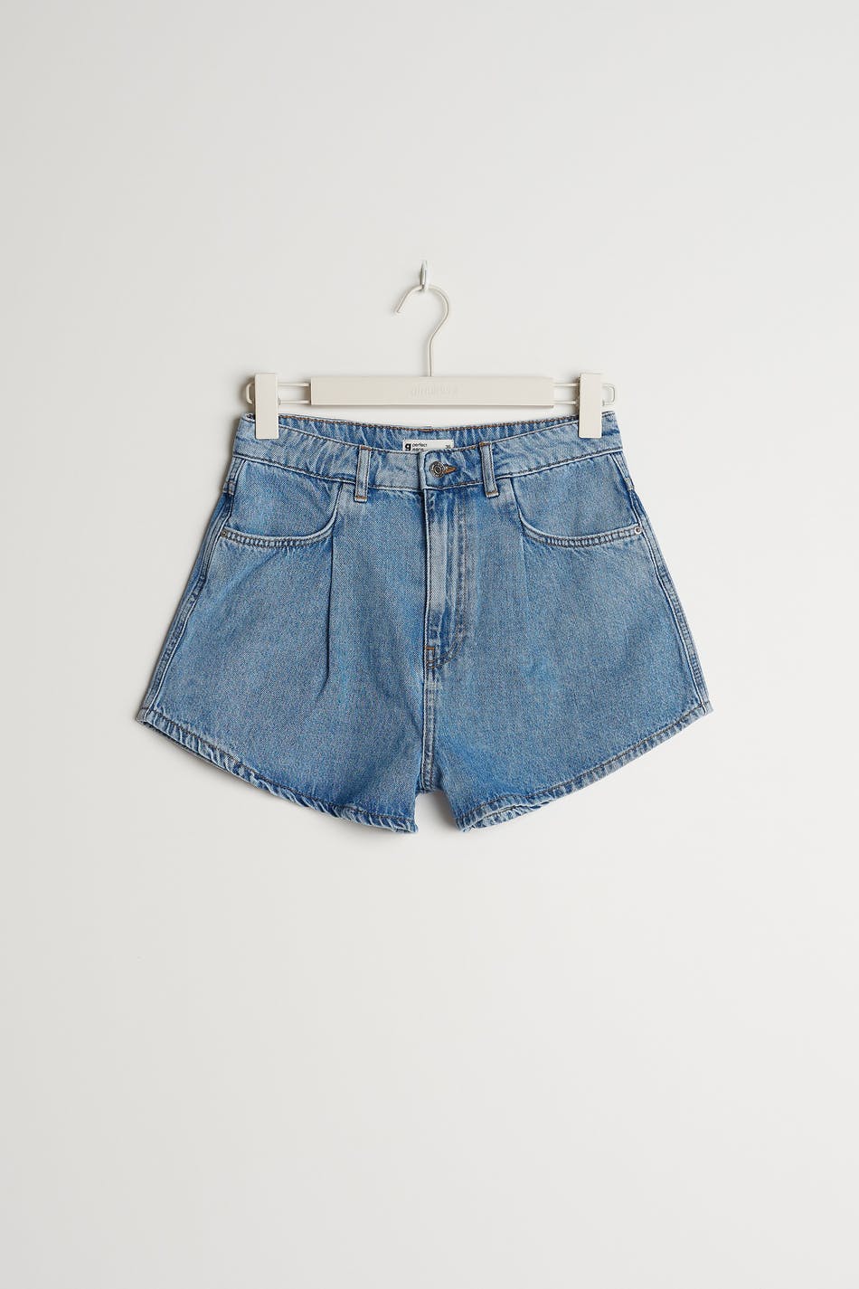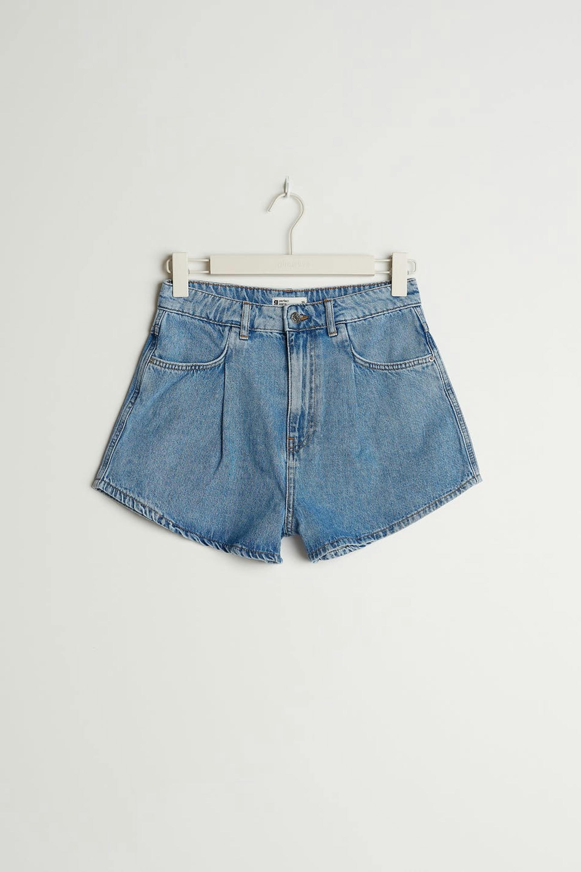 Non-stretch denim shorts with wide, short trouser legs. The shorts are light-blue and have pleats at the front. They are made of denim and have a high waist.