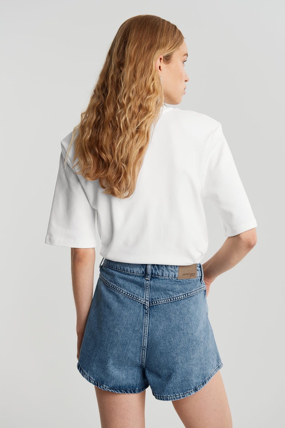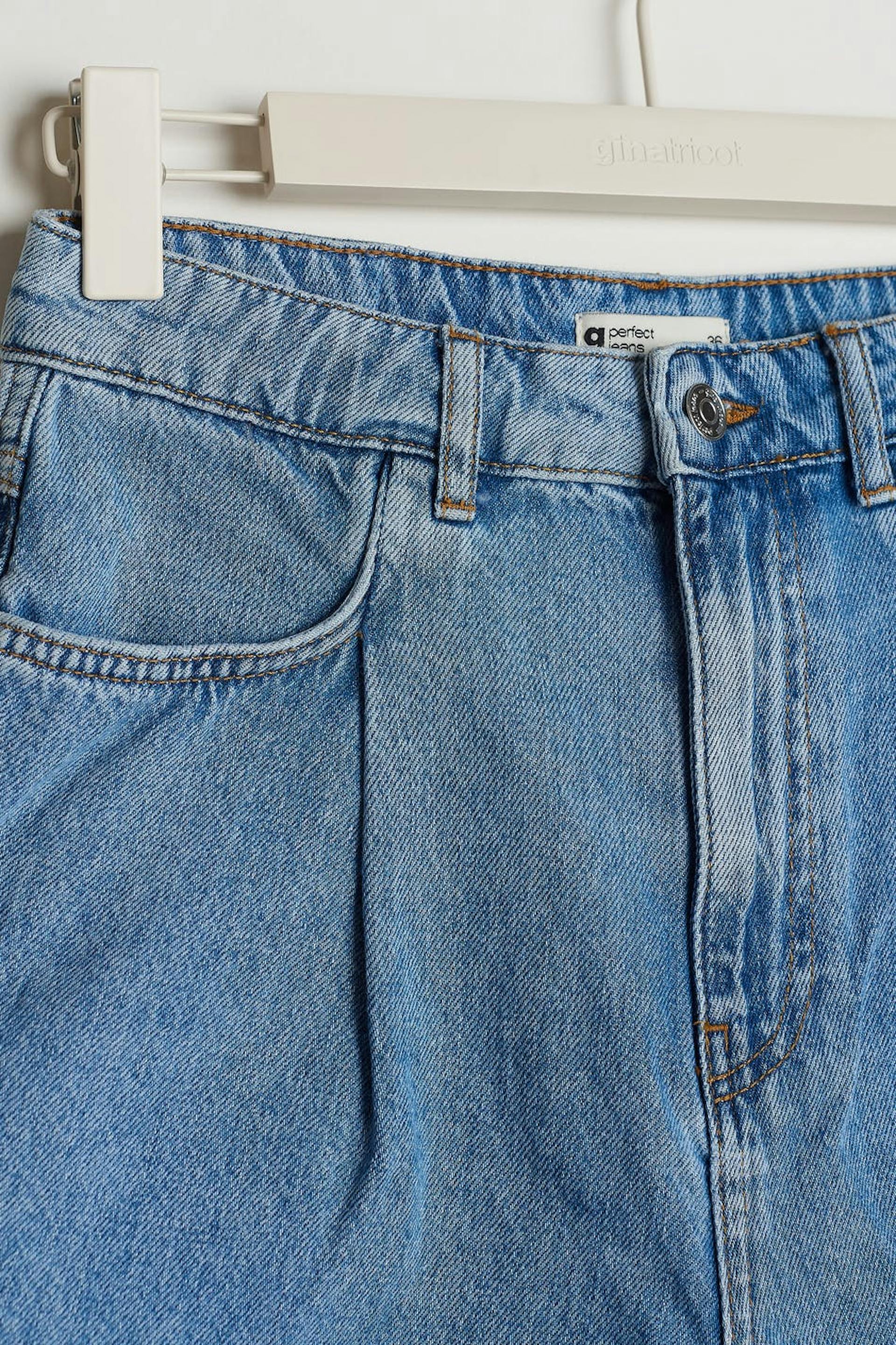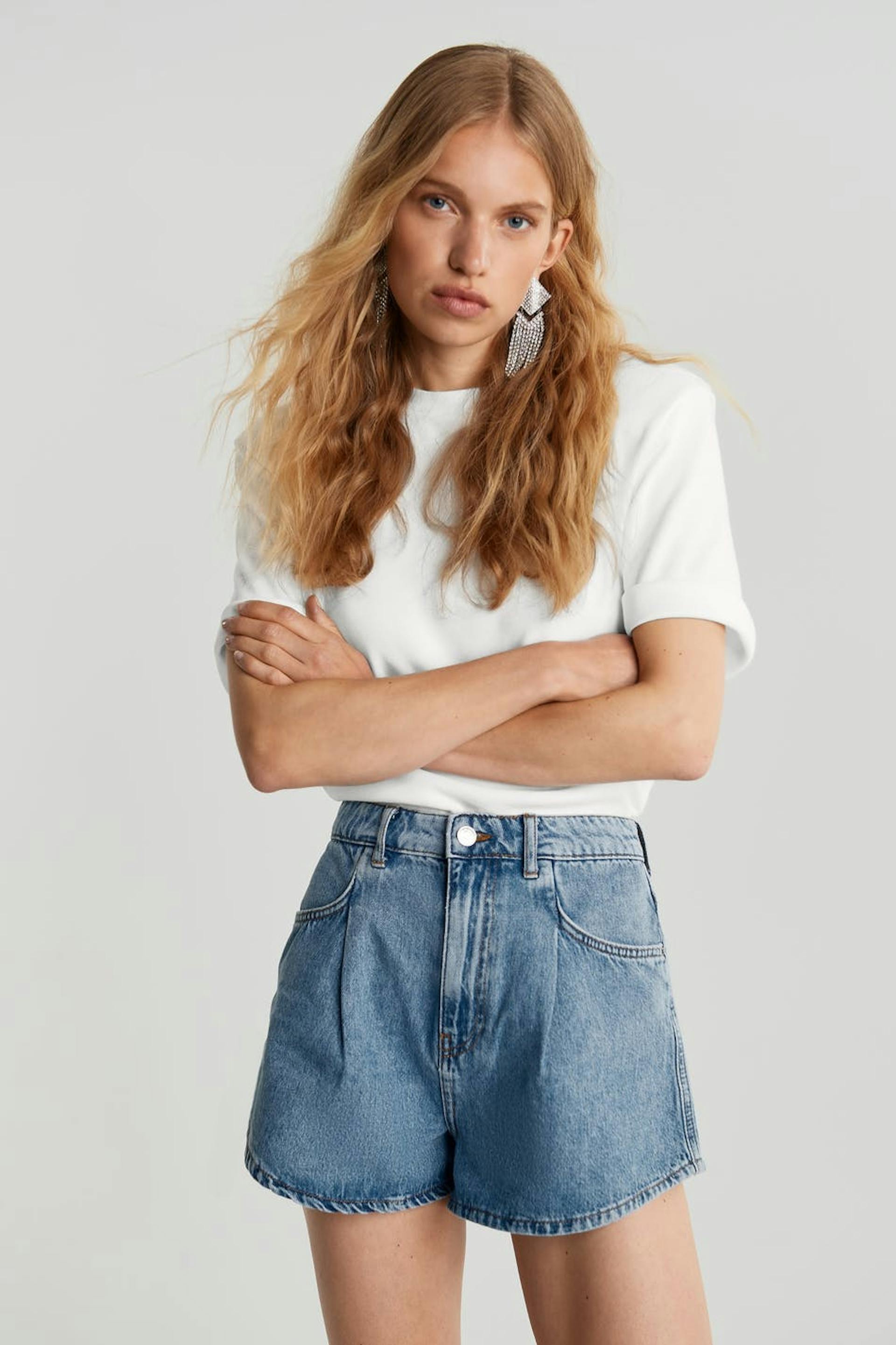 Non-stretch denim shorts with wide, short trouser legs. The shorts are light-blue and have pleats at the front. They are made of denim and have a high waist.