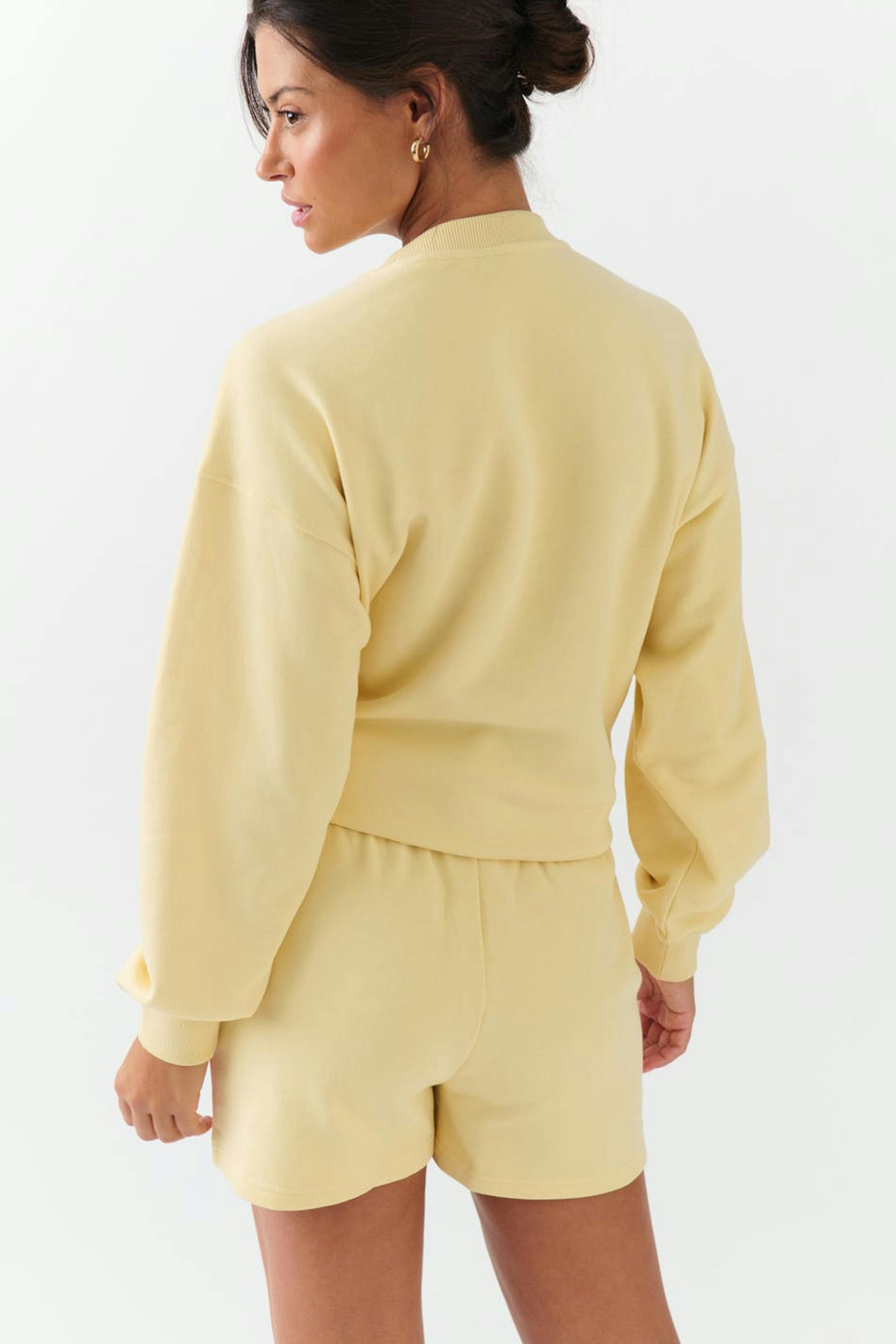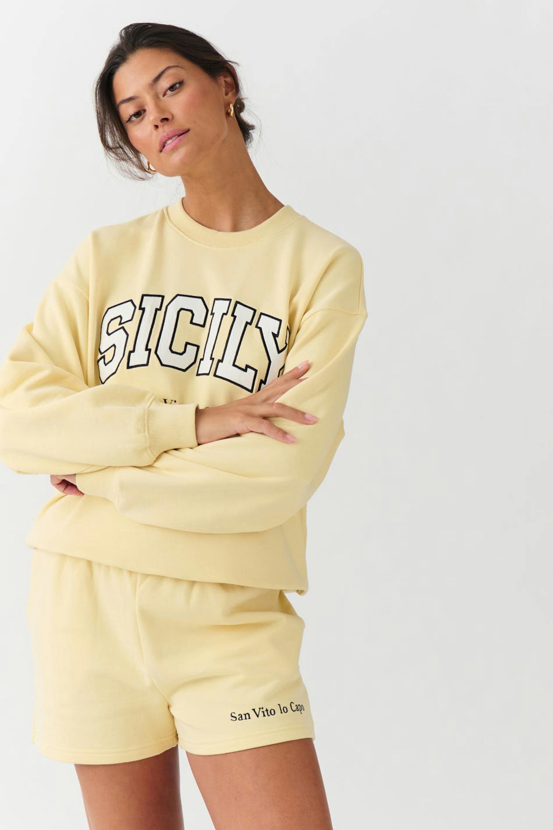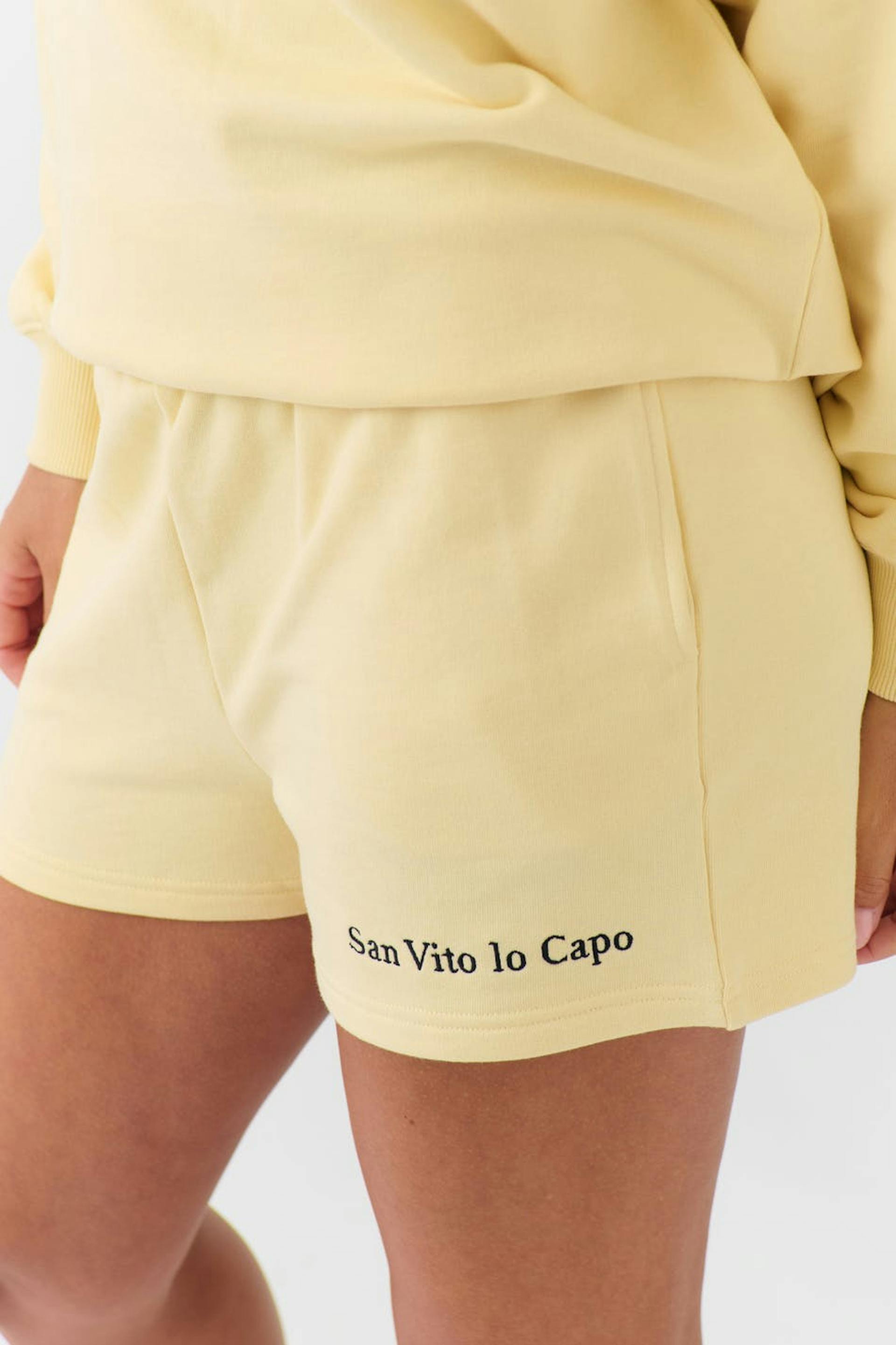 Short shorts with embroidered text at the front. The shorts are yellow and have mid waist. They have loose-fitting style, elastic at the waist and pockets in the sides.