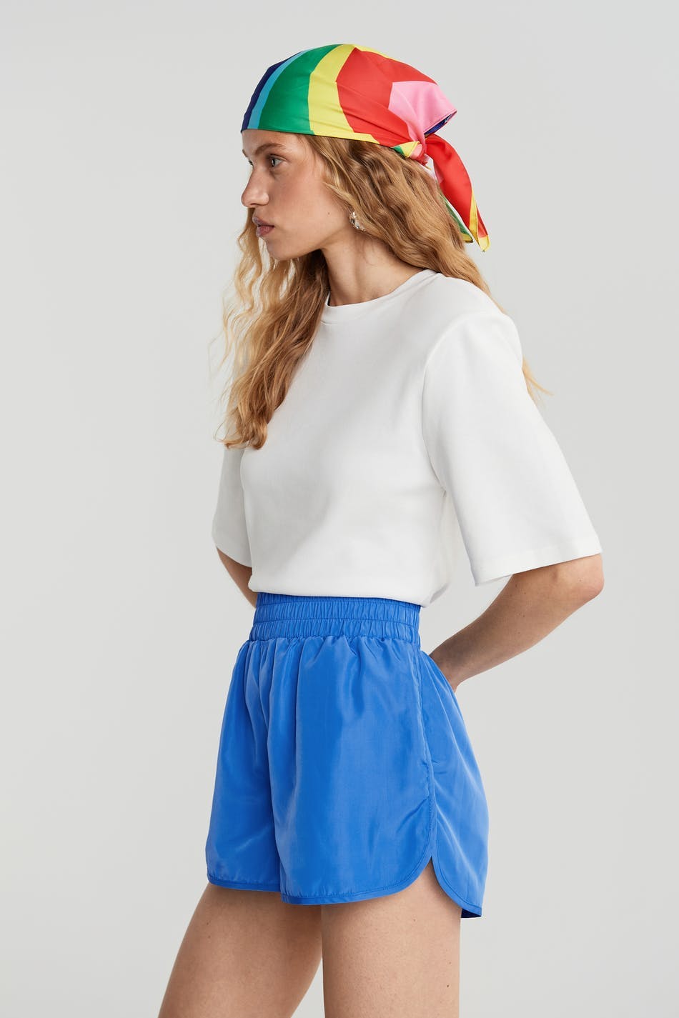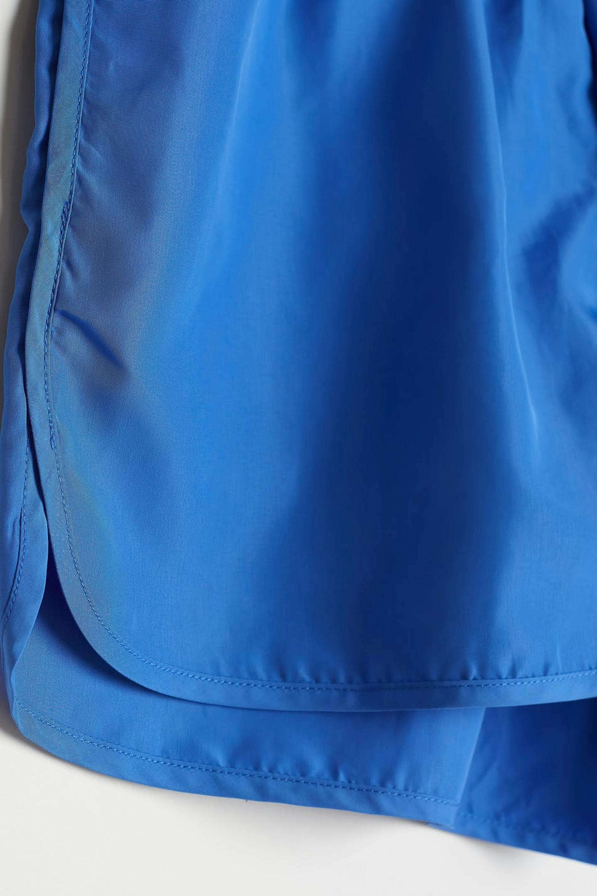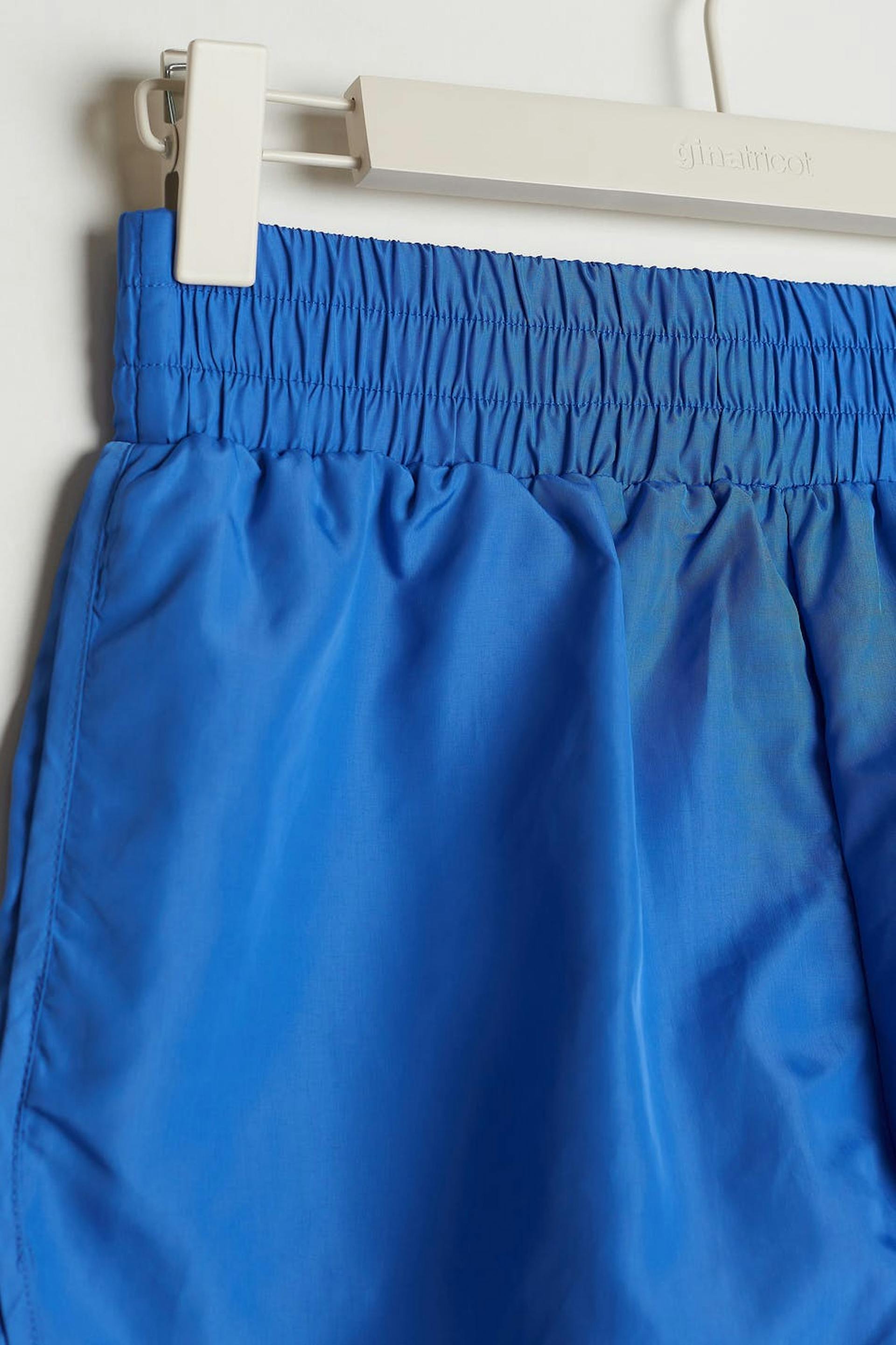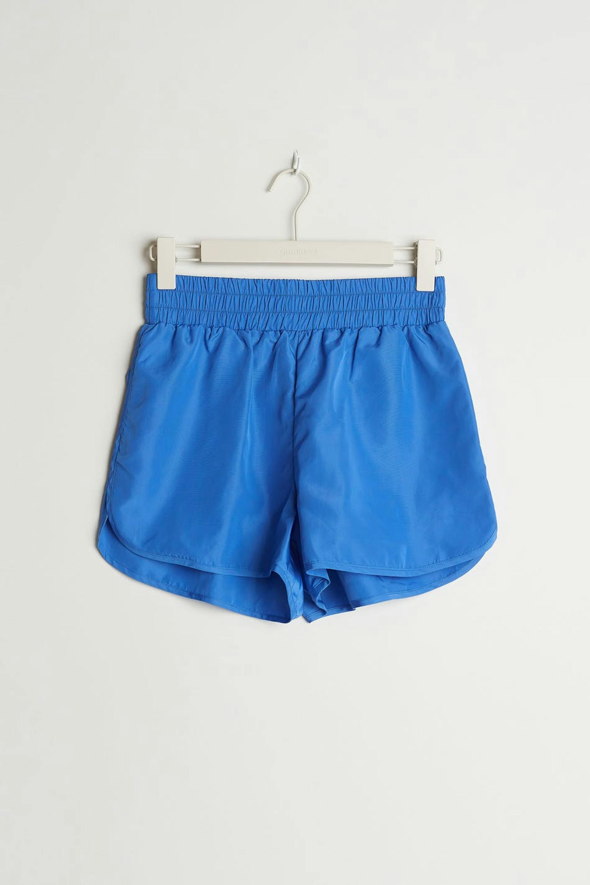 Sporty shorts with an elastic at the waist. The shorts are blue.
