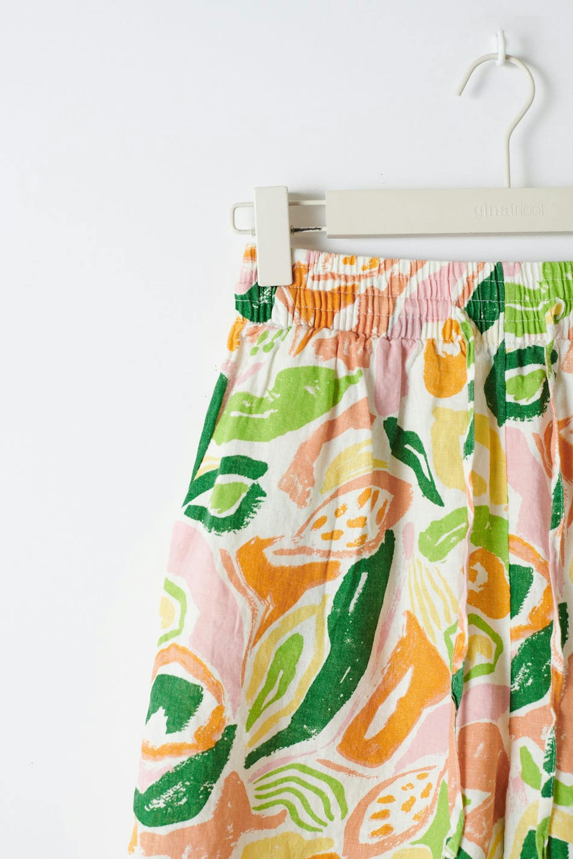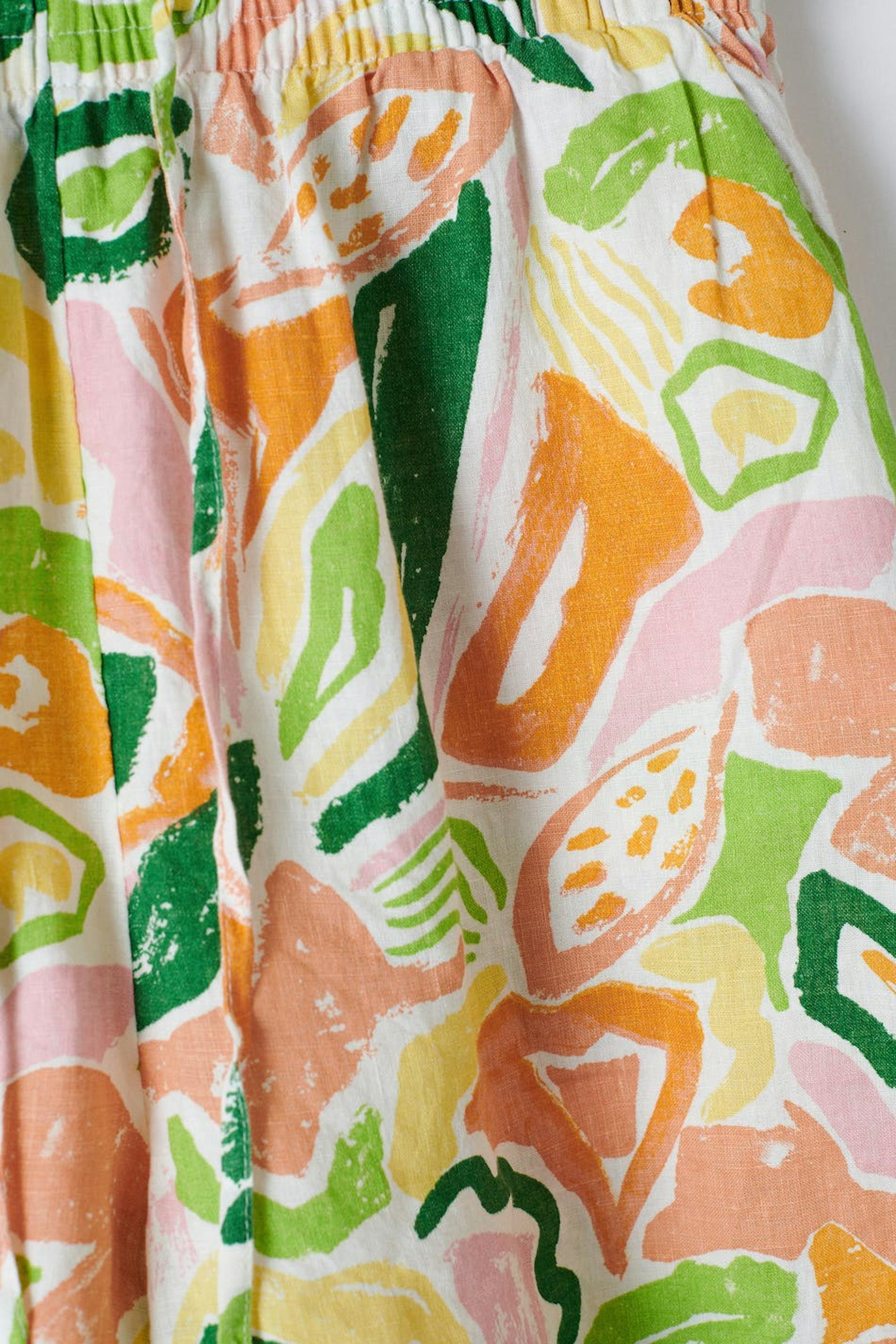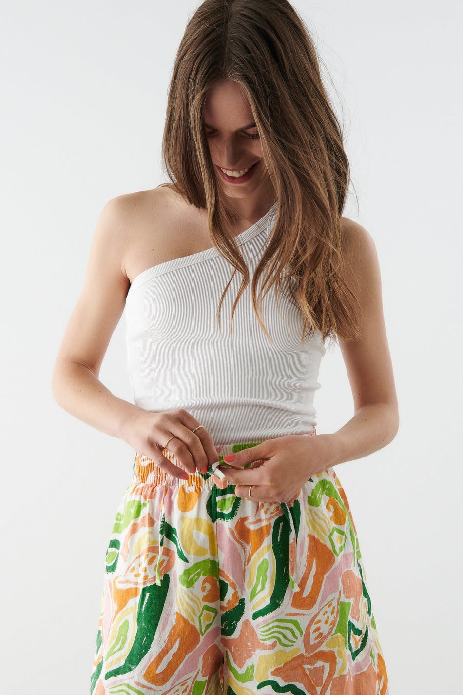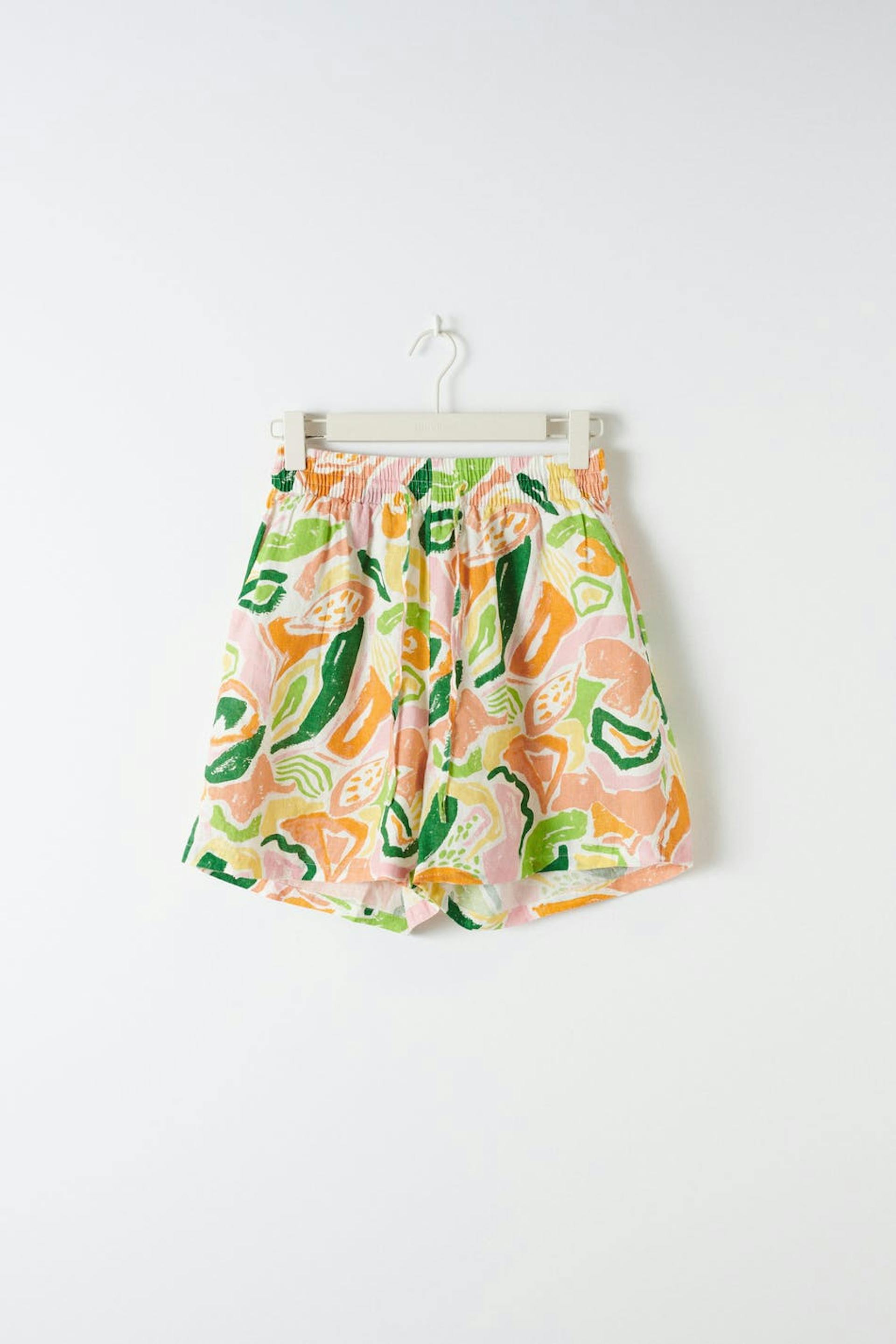 Shorts with high waist. The shorts are patterned and have pockets on the sides. They have a woven quality in linen, elastic at the waist and an adjustable drawstring with self-tie at the front.
