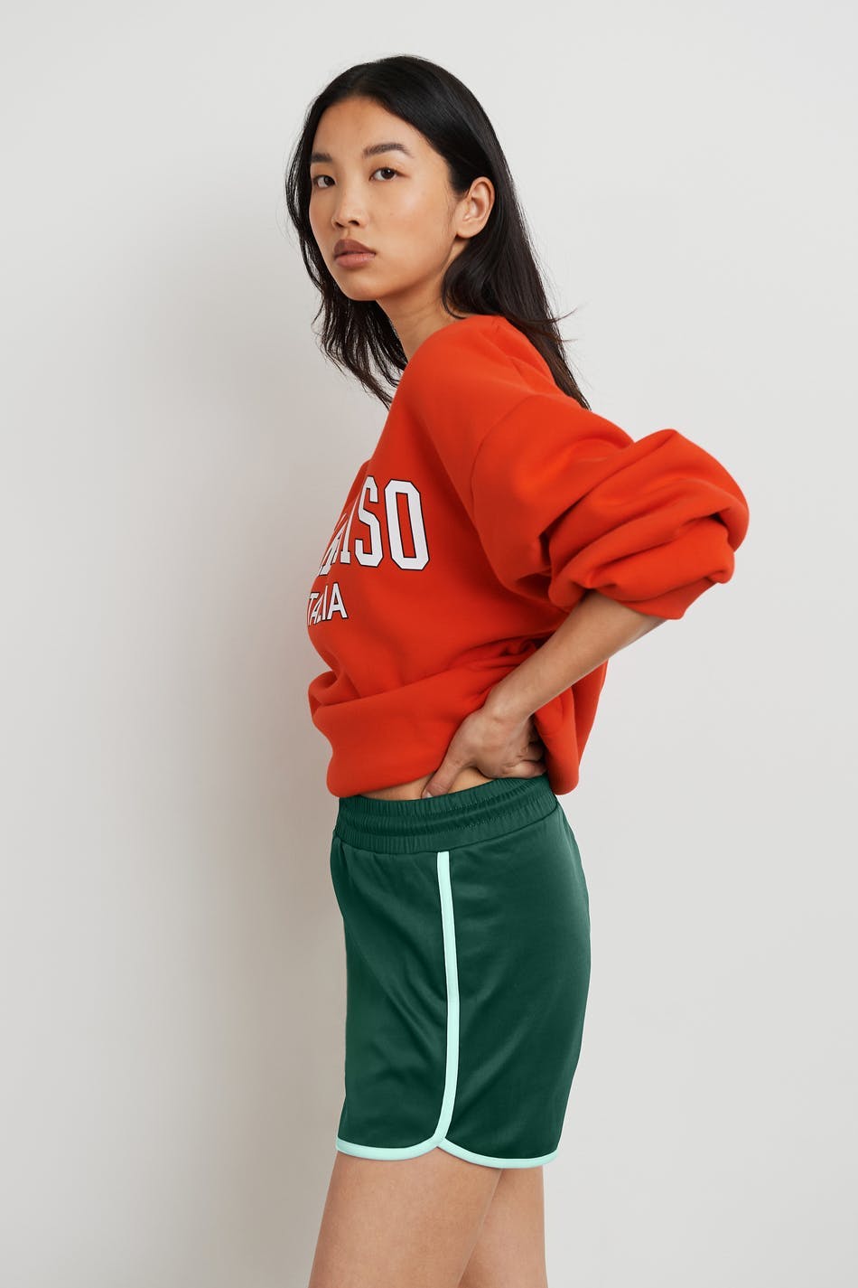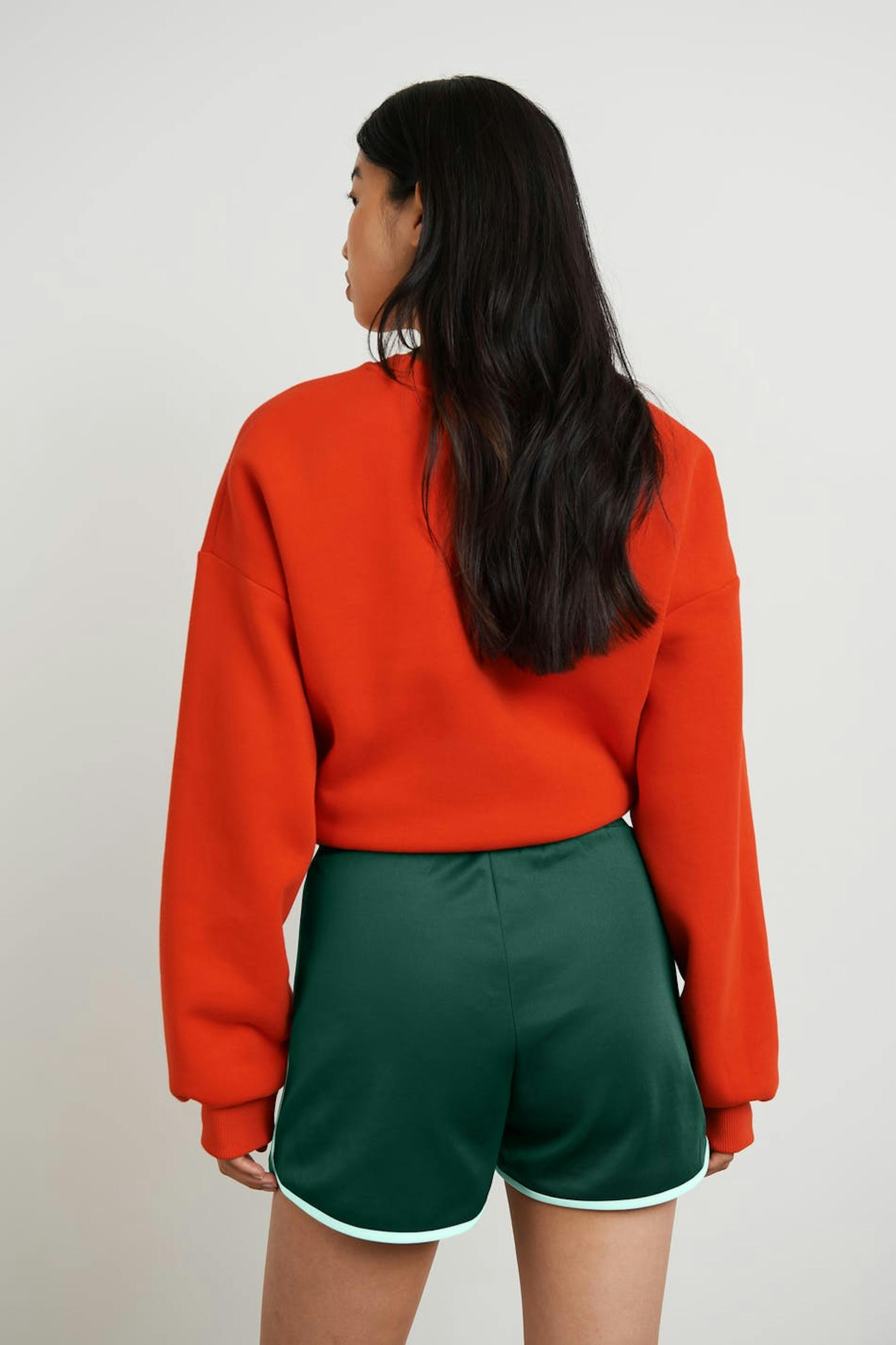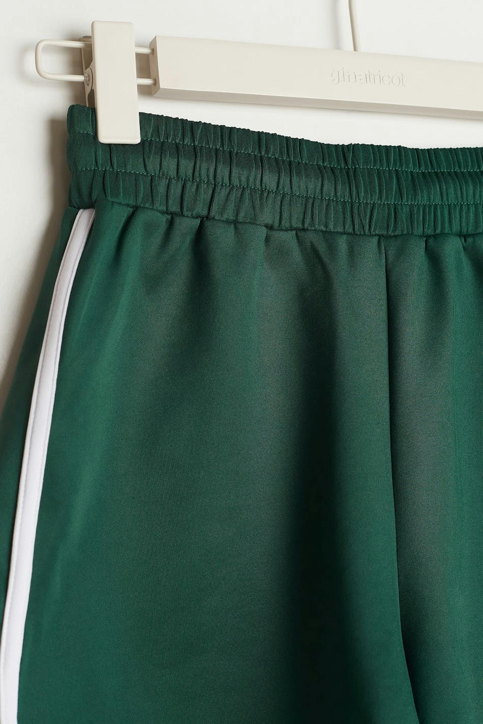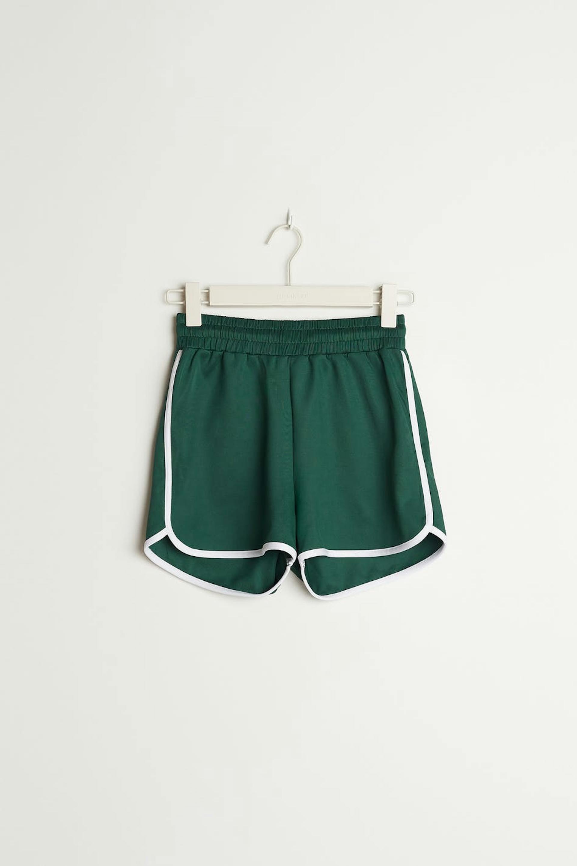 Short shorts with a regular fit. The shorts are green and have a sporty design. They have a white stripe at the edges and an elastic band at the waist.