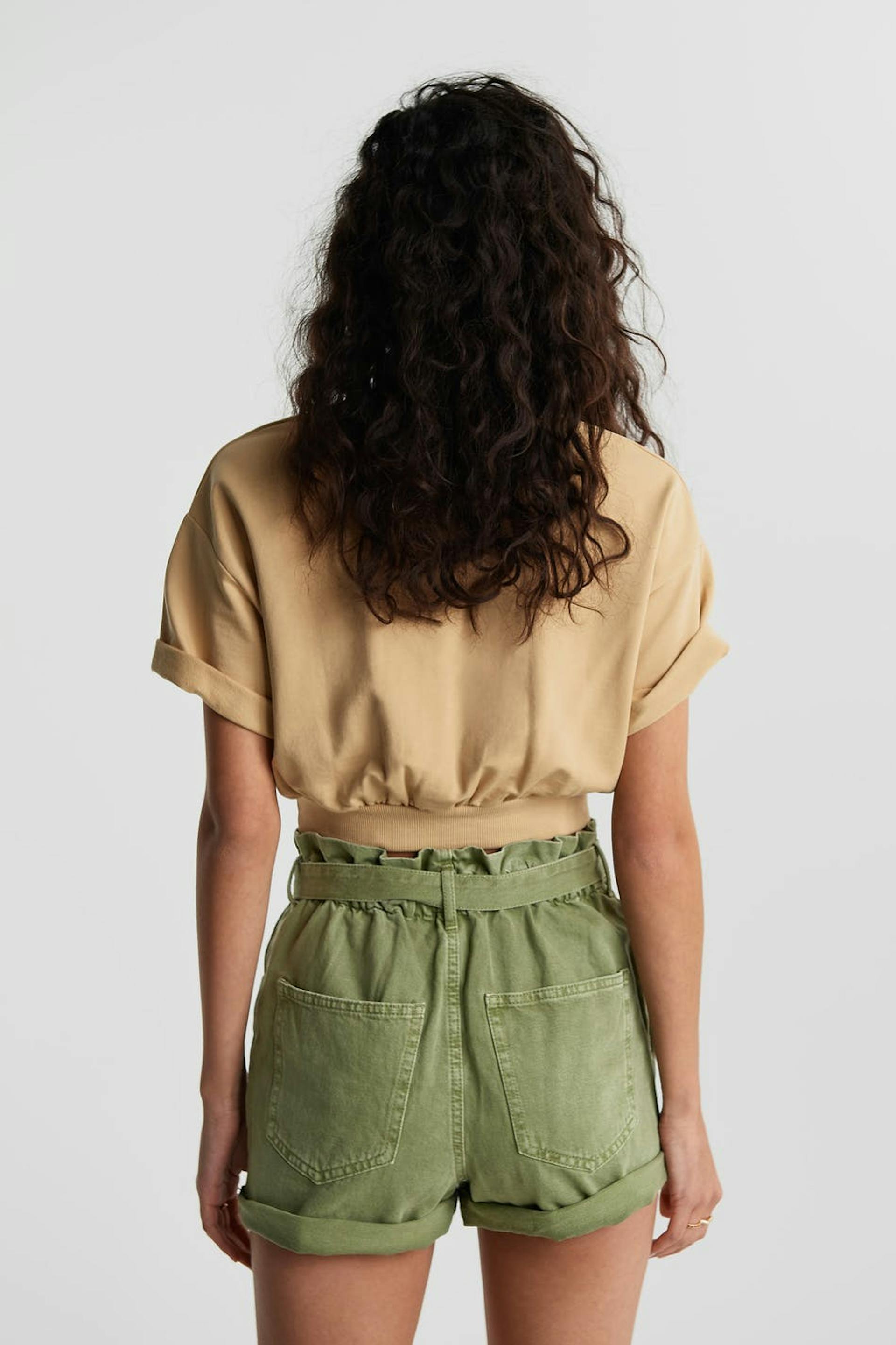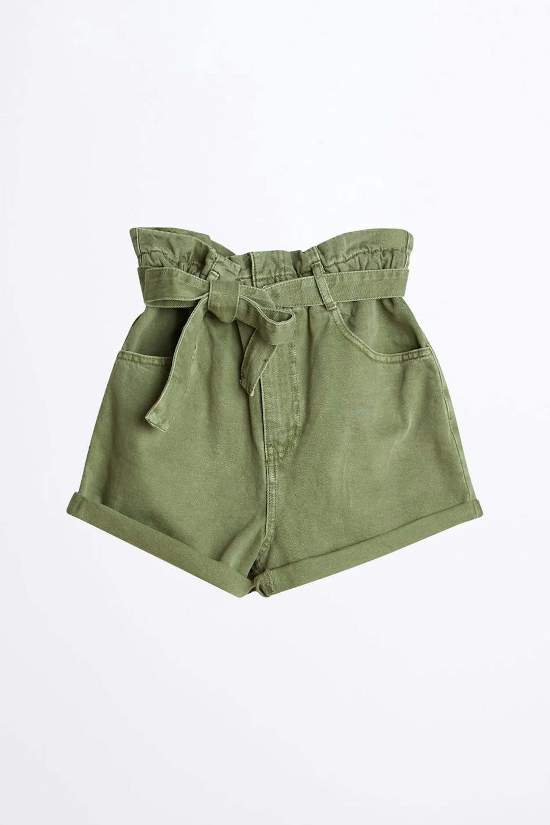 Short denim shorts with a regular fit. The shorts are green and nonstretch and have a high, paper bag waist in elastic with a belt tie.