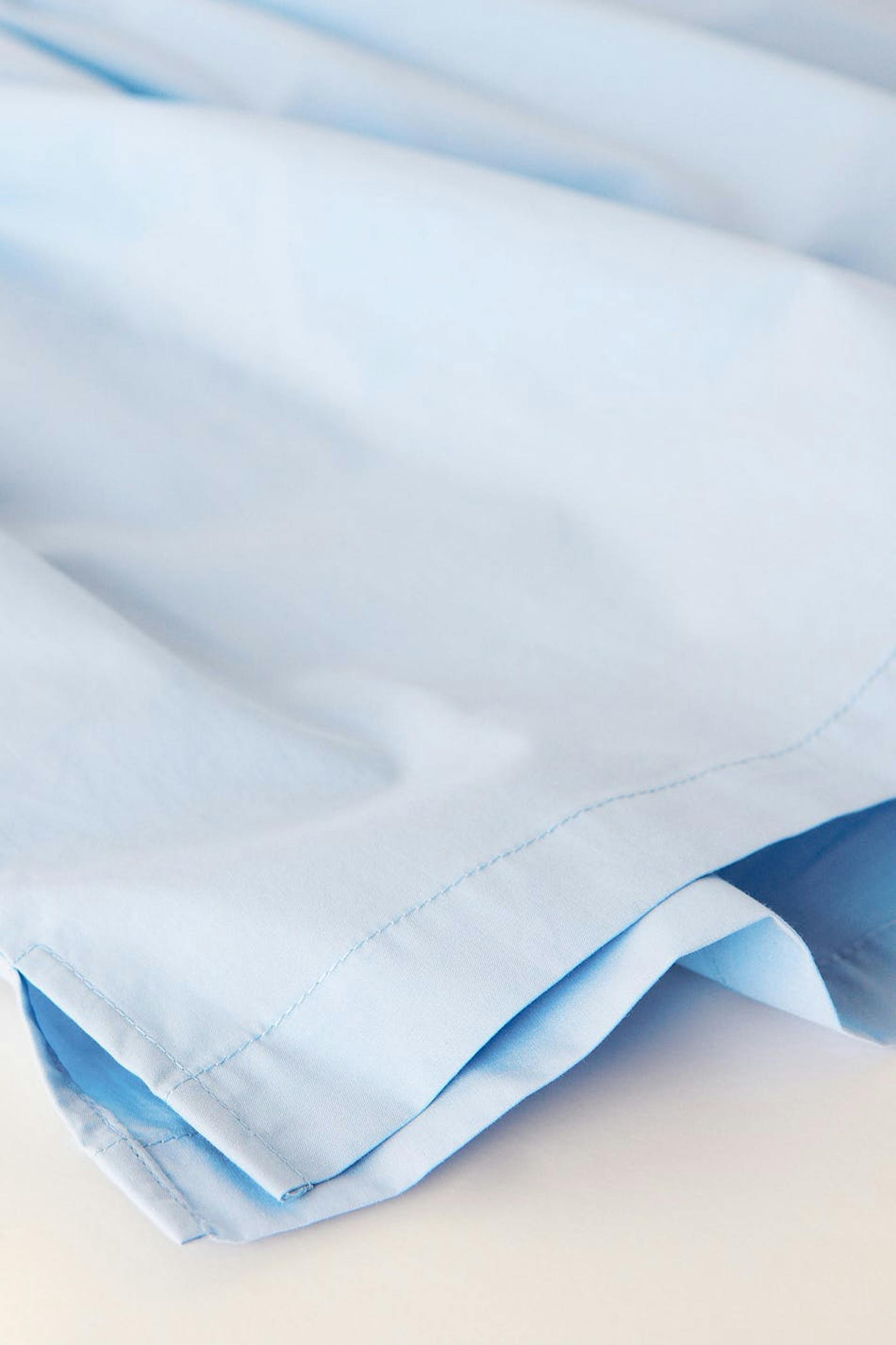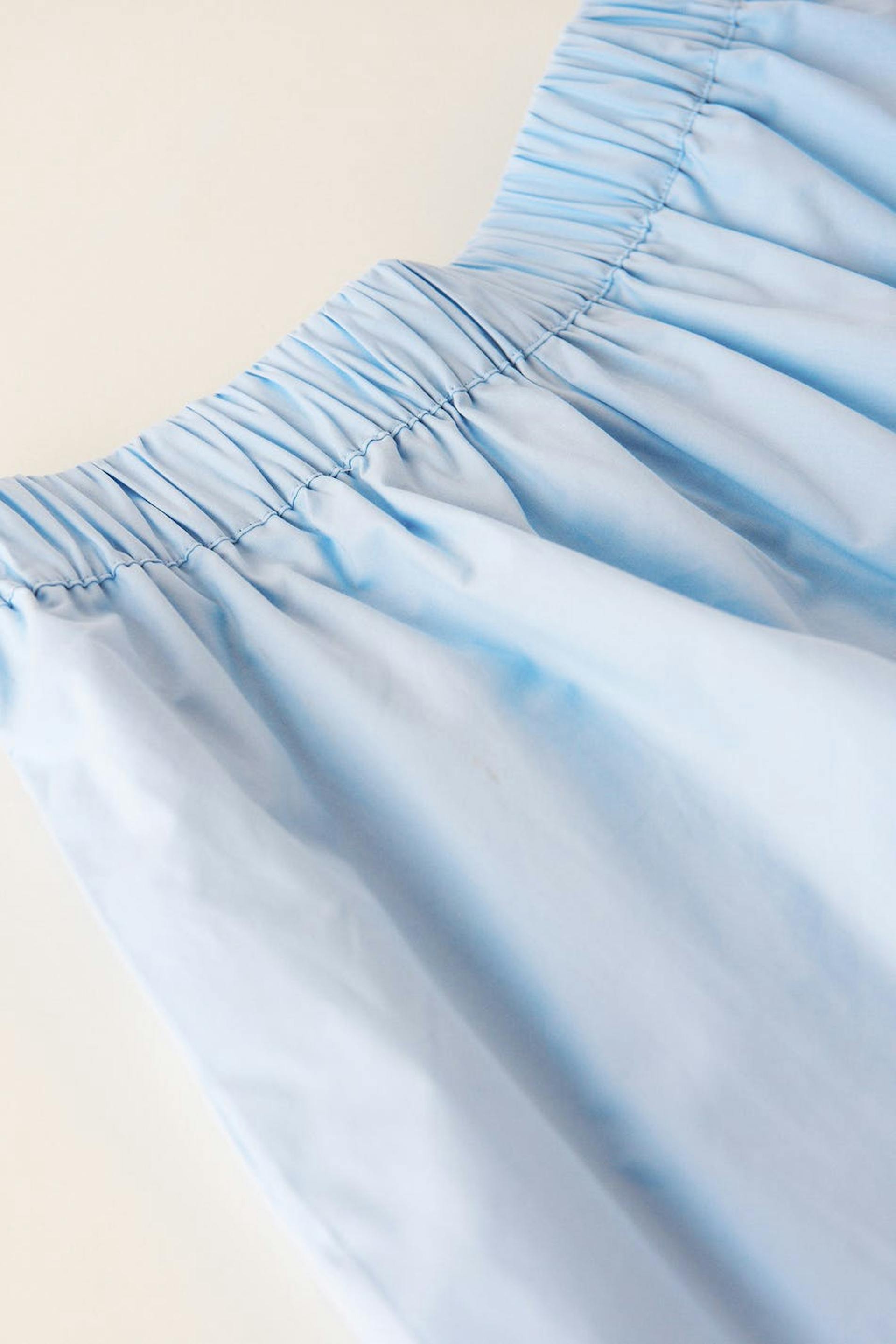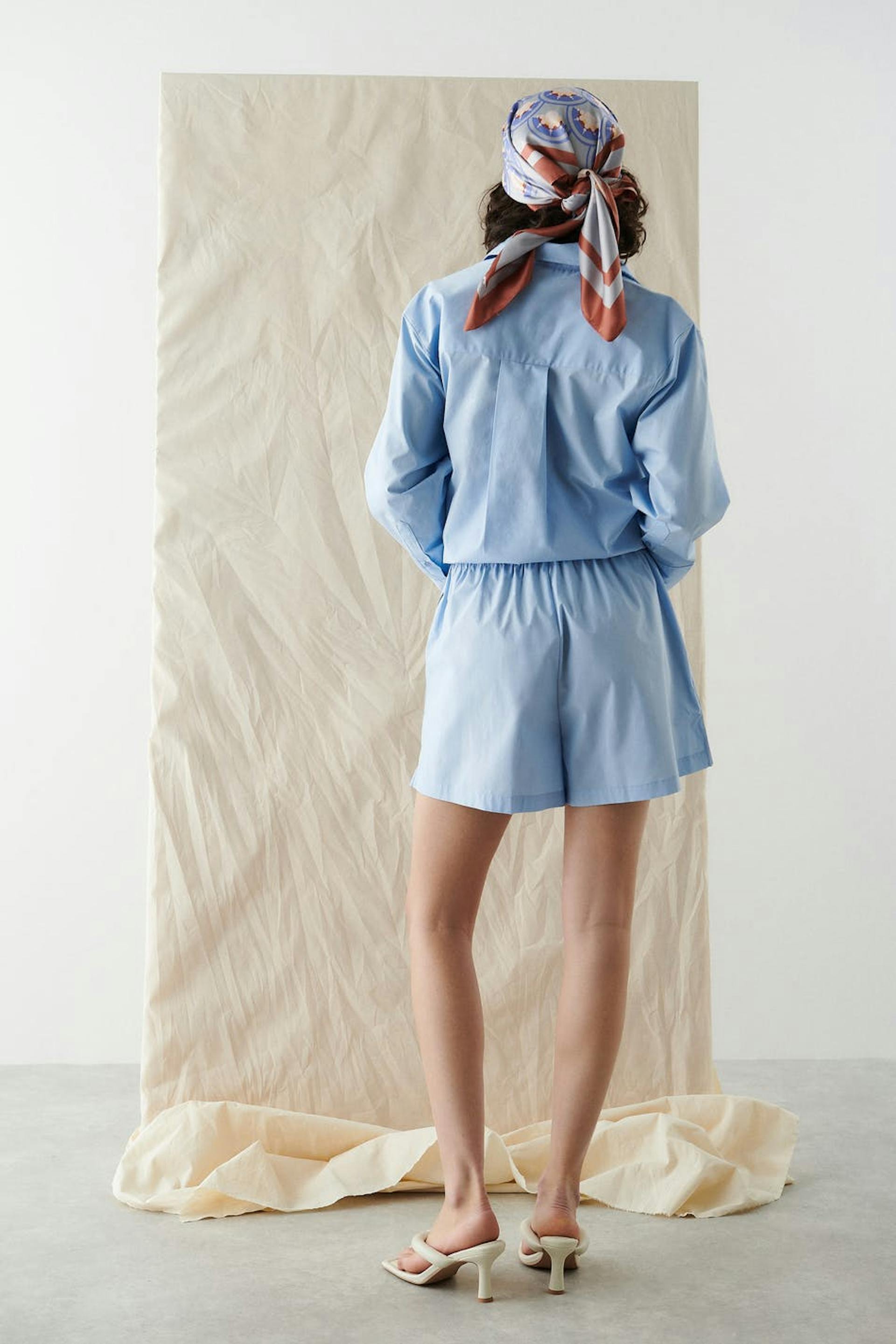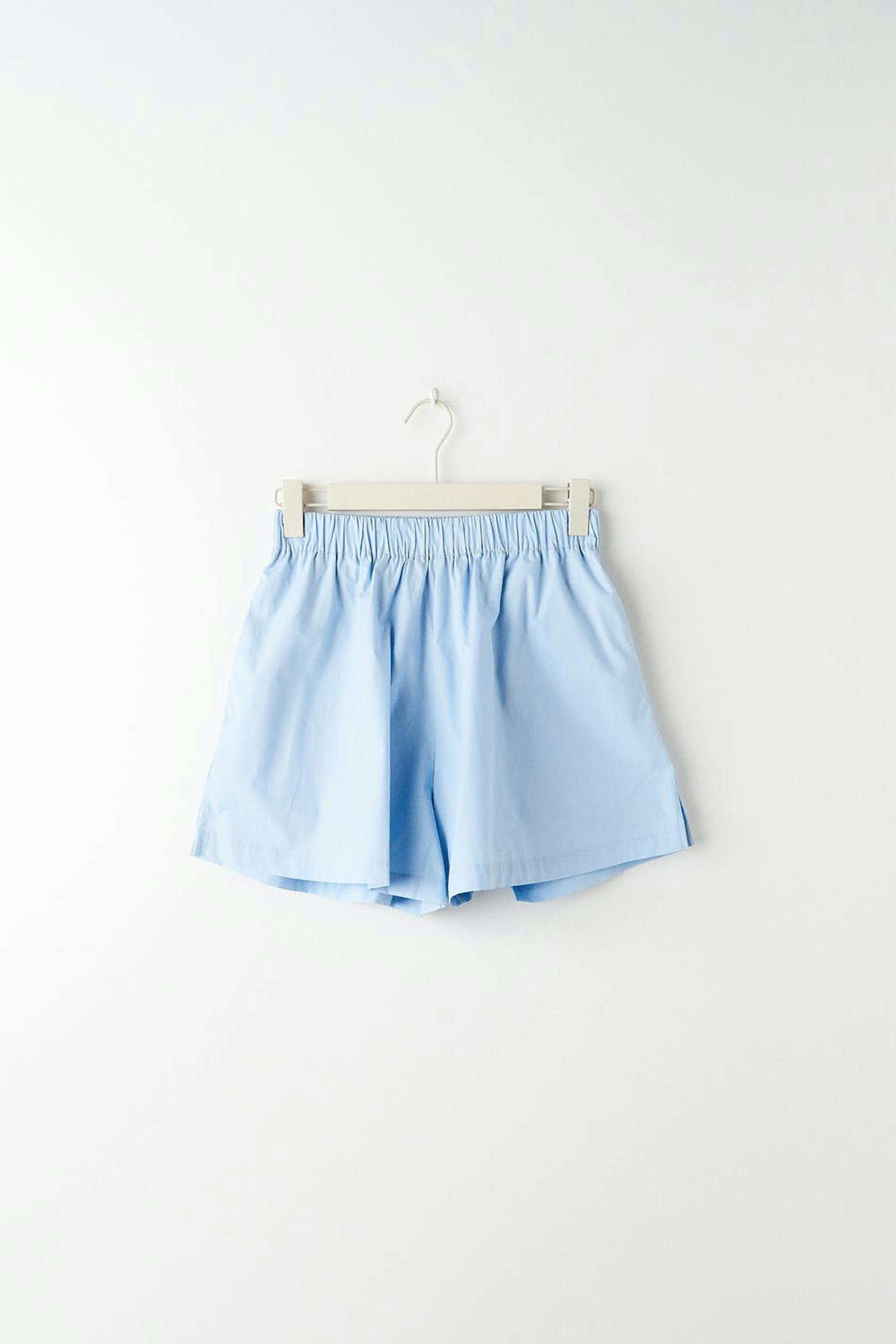 Shorts with high waist. The shorts are blue and have a woven quality in cotton poplin. They have a boxy fit, pockets on the sides, elastic at the waist and vent in the sides.
