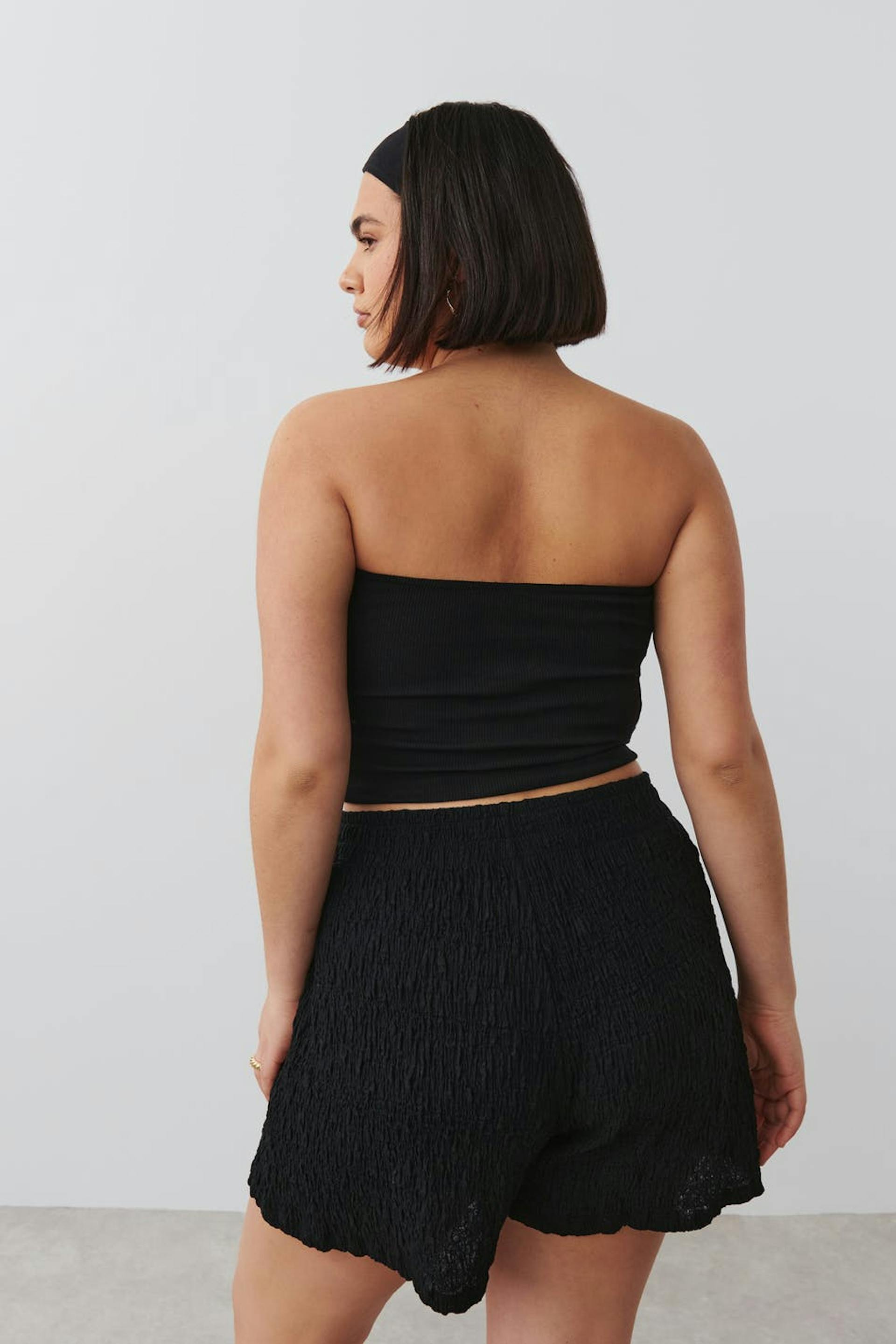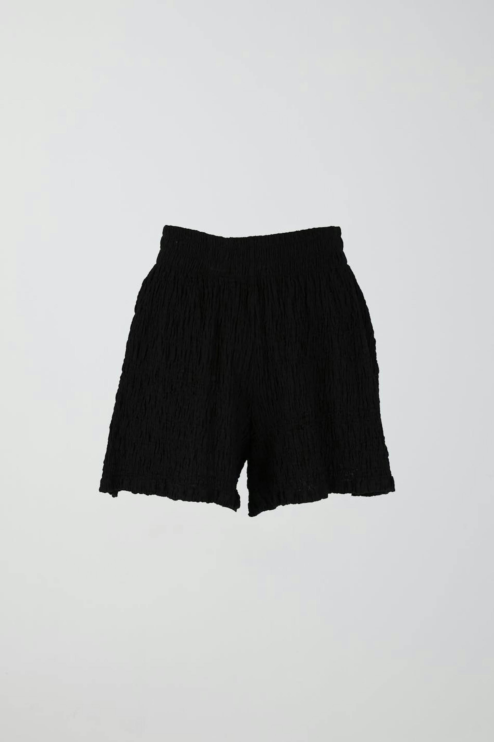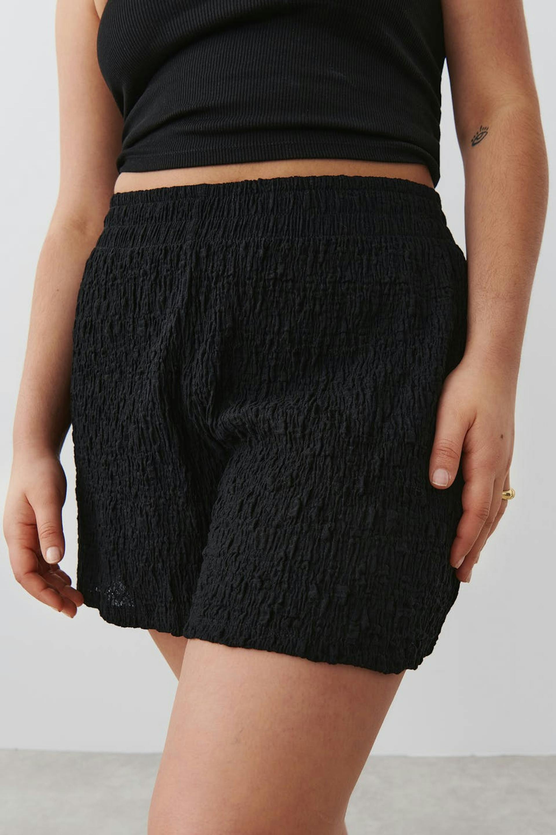 Shorts with a regular fit. The shorts are black and have high waist. They have elastic at the waist and textured cloth.
