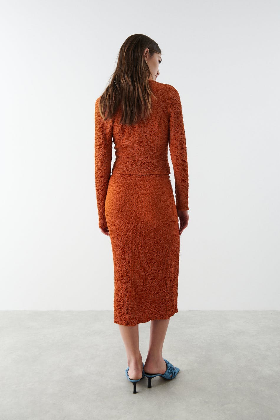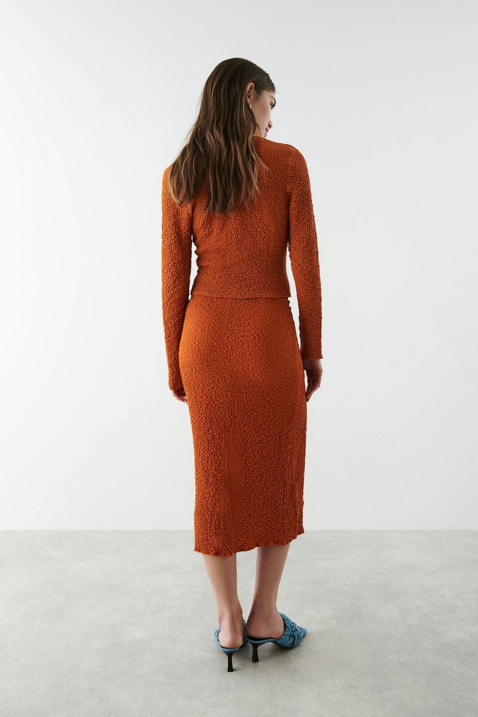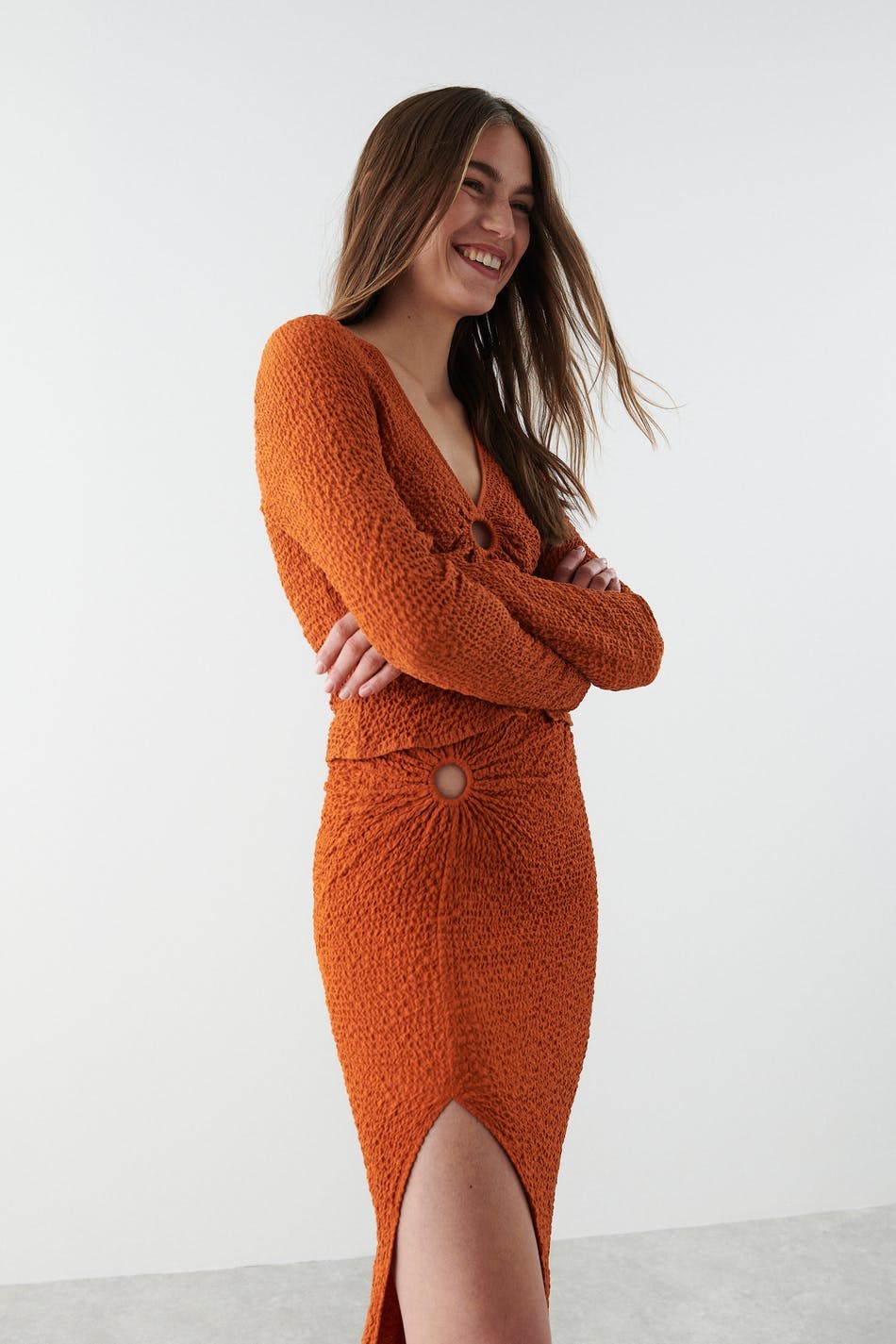Long midi skirt with a keyhole on the right side with gathers and a slit. The skirt is orange and high-waisted.