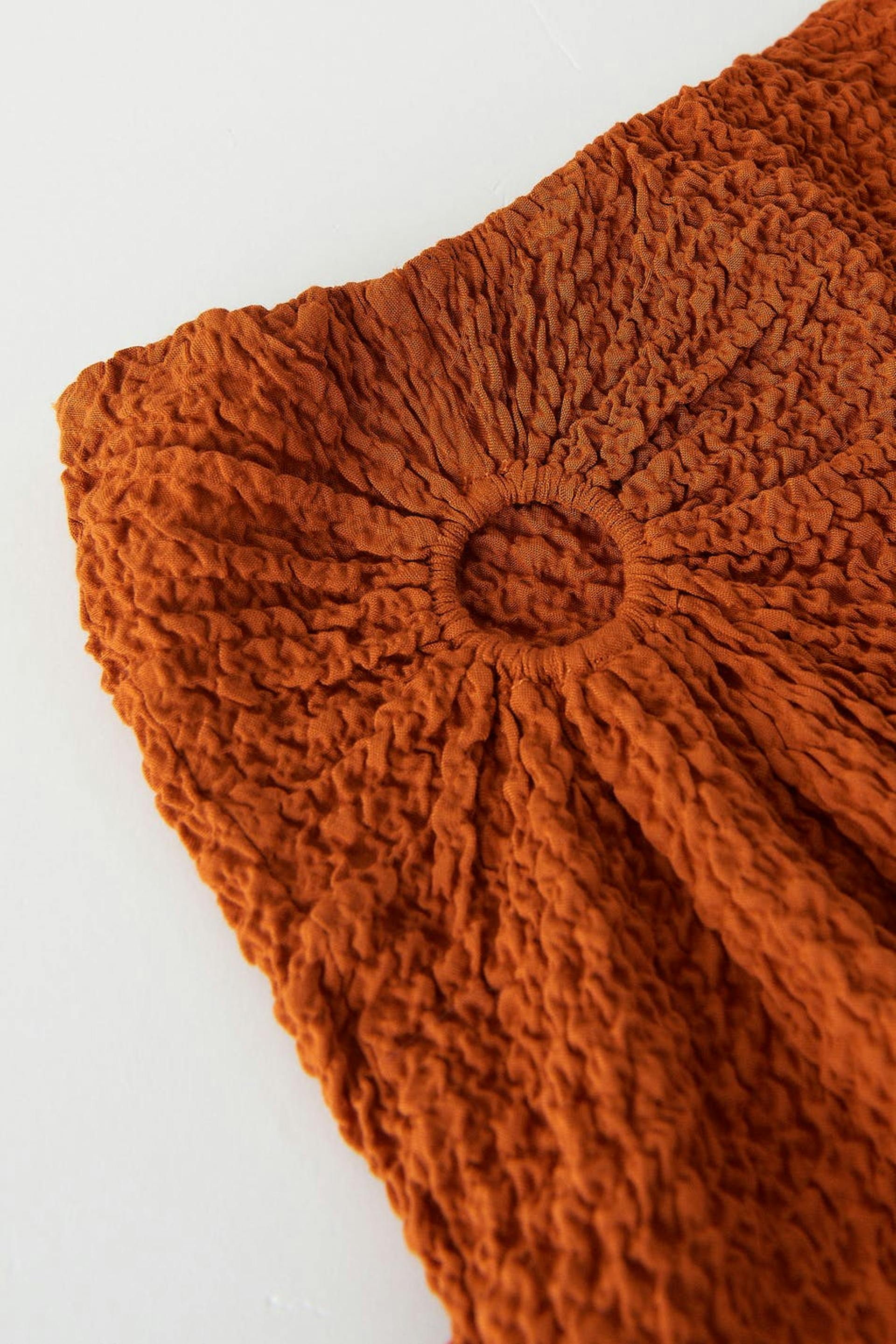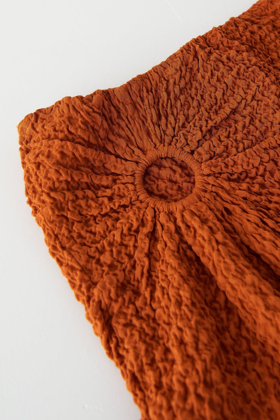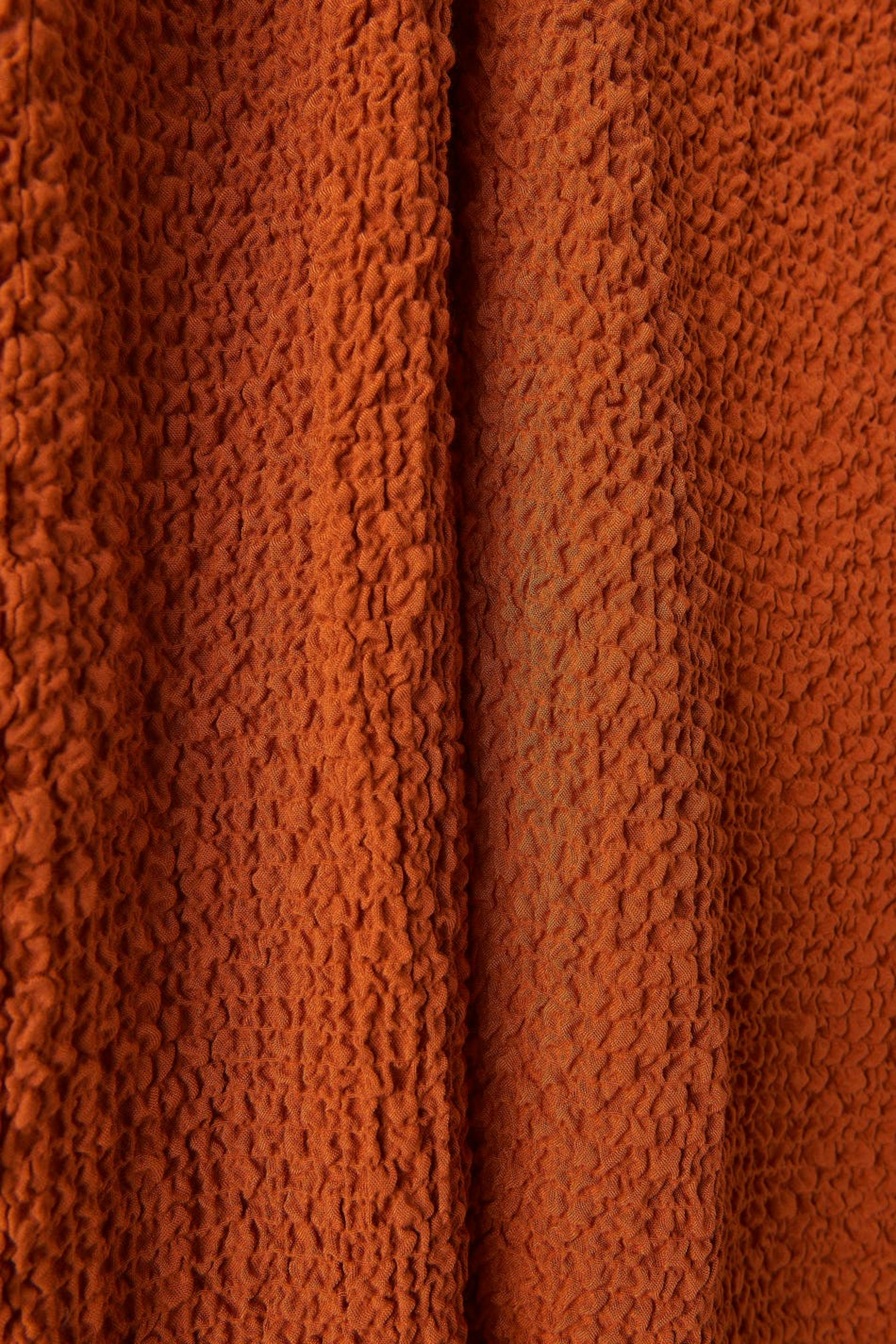 Long midi skirt with a keyhole on the right side with gathers and a slit. The skirt is orange and high-waisted.
