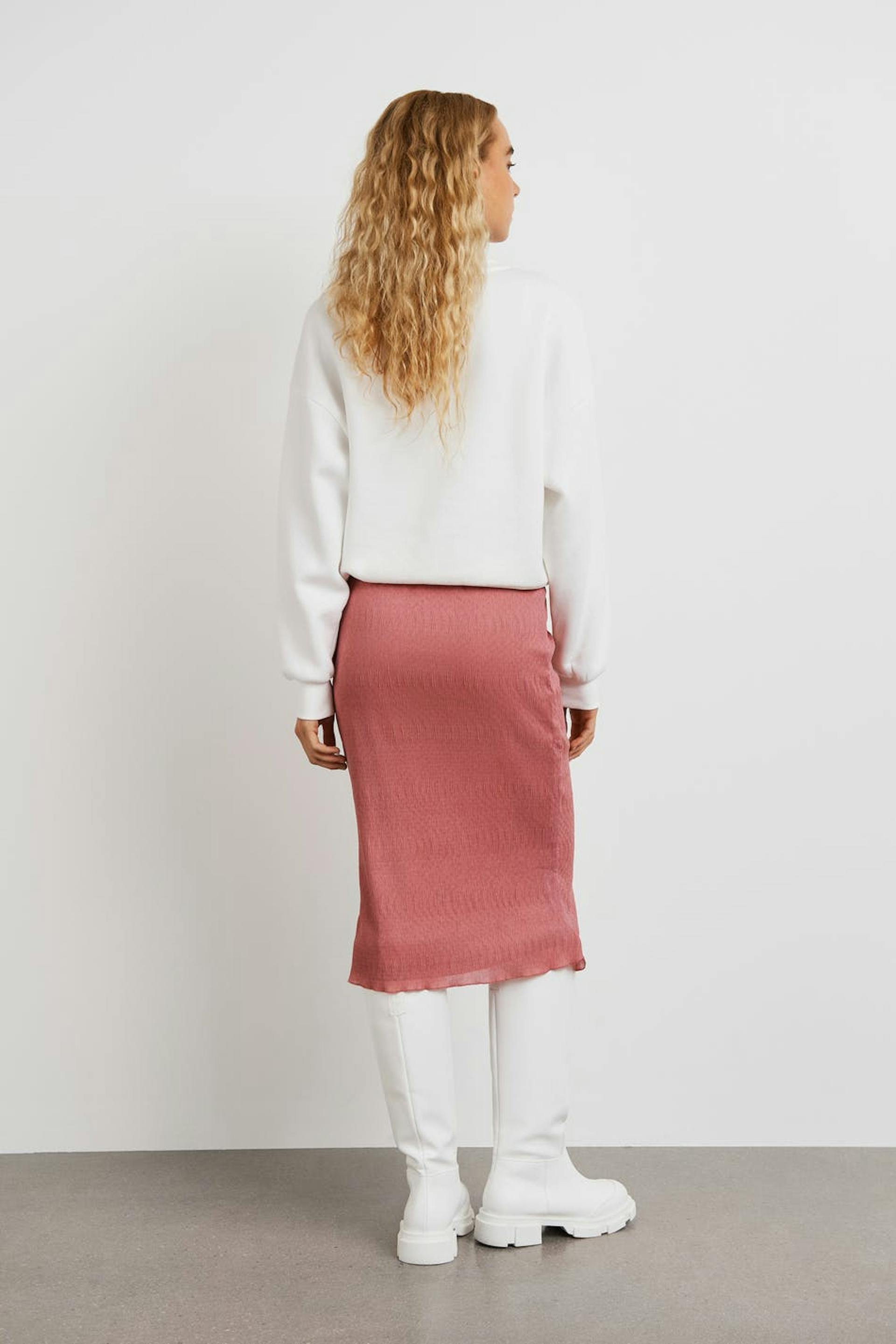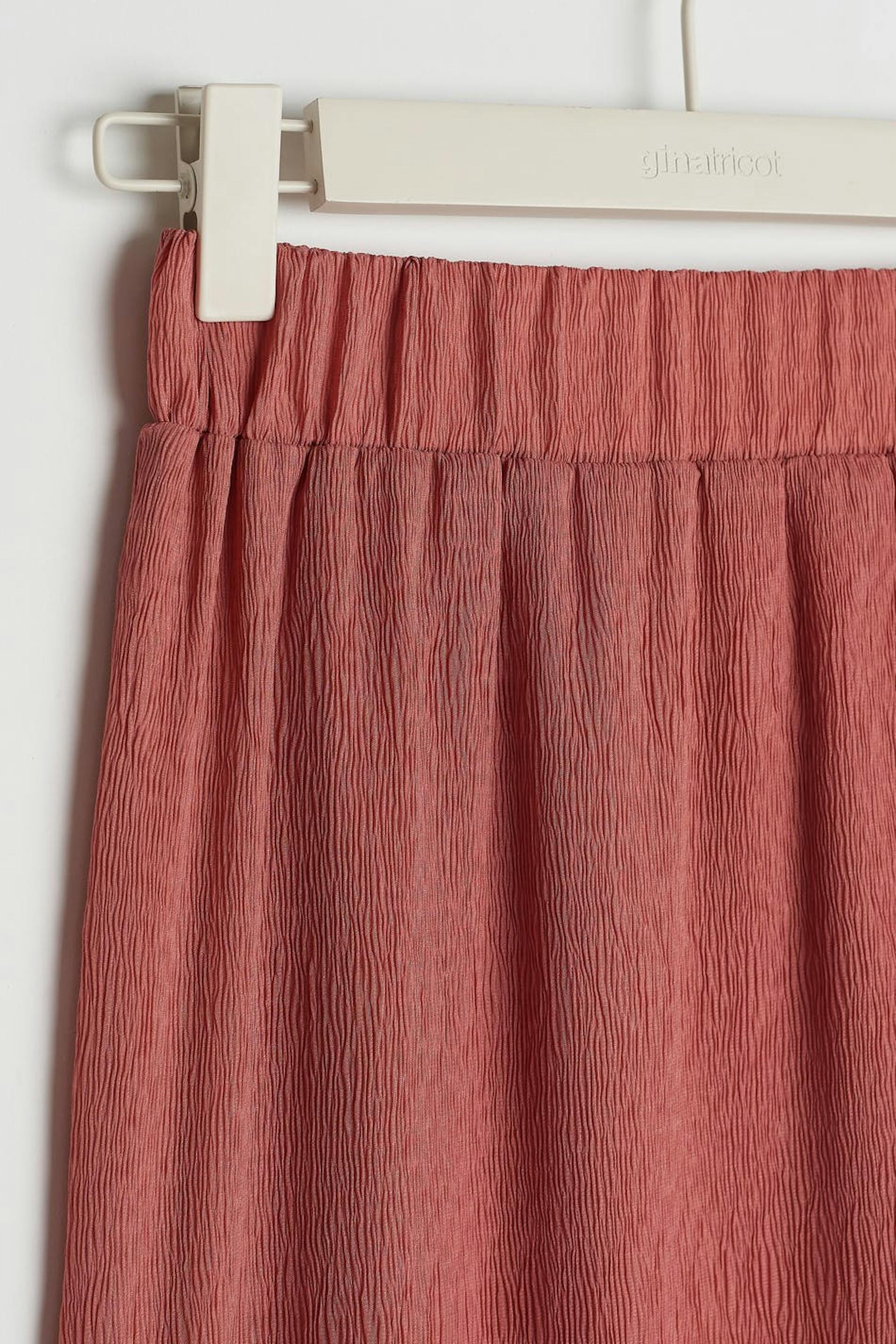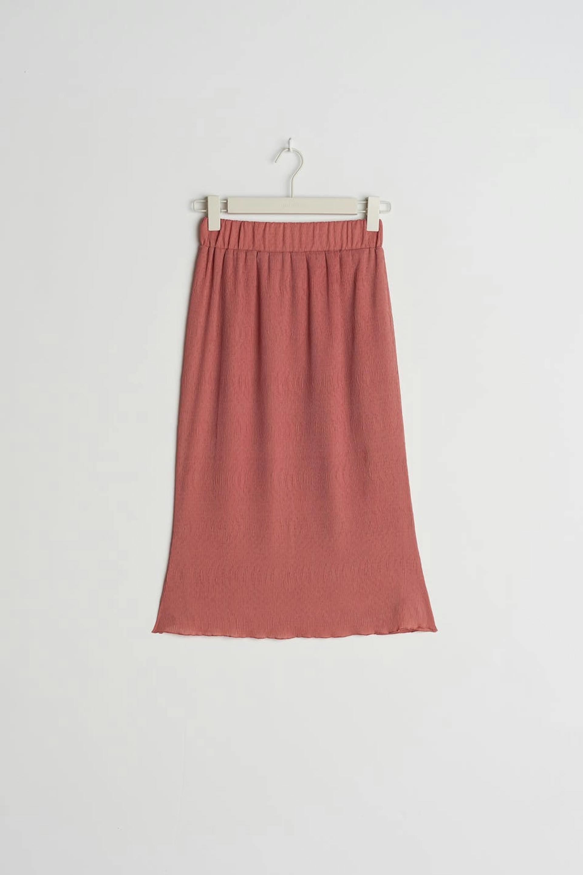 Skirt with a slim fit. The skirt is pink and has a lightly crinkled material in chiffon. It has an elastic band at the waist and small frills at the bottom hem.