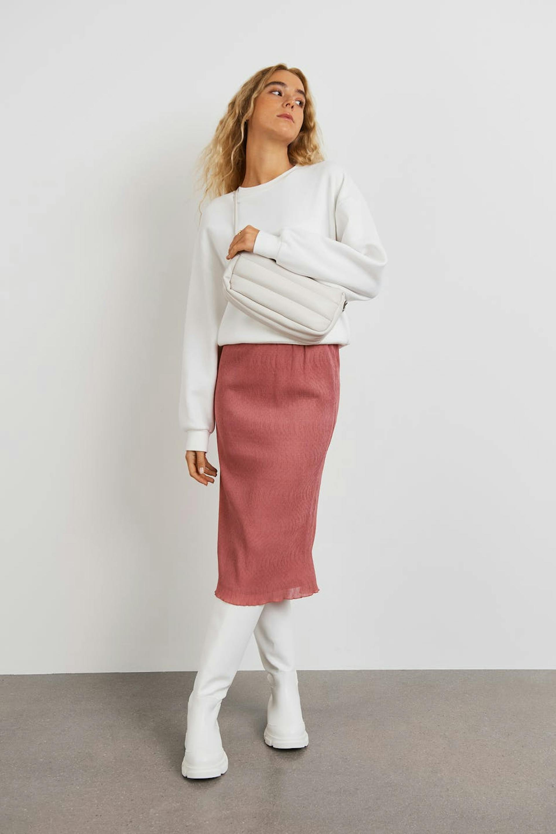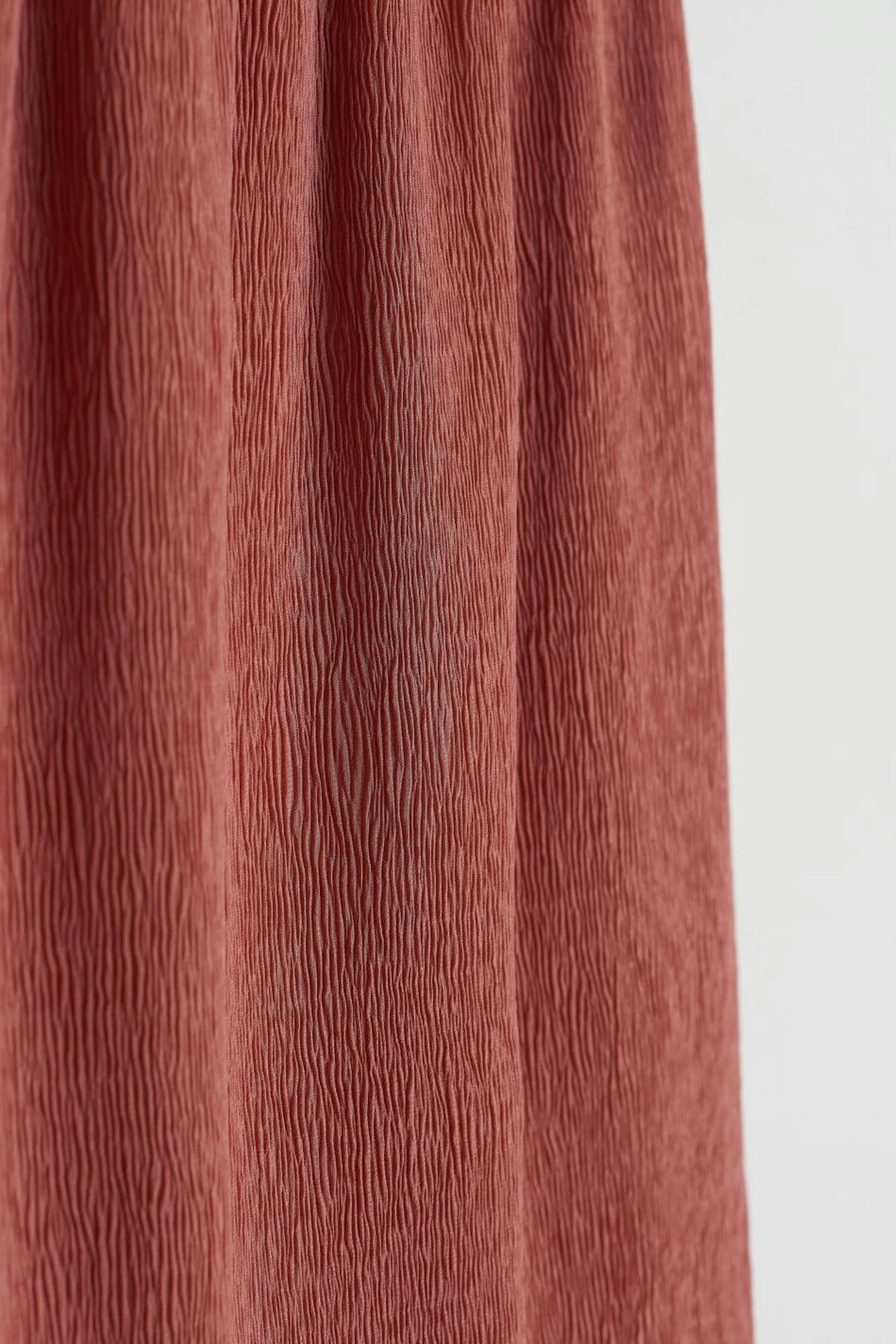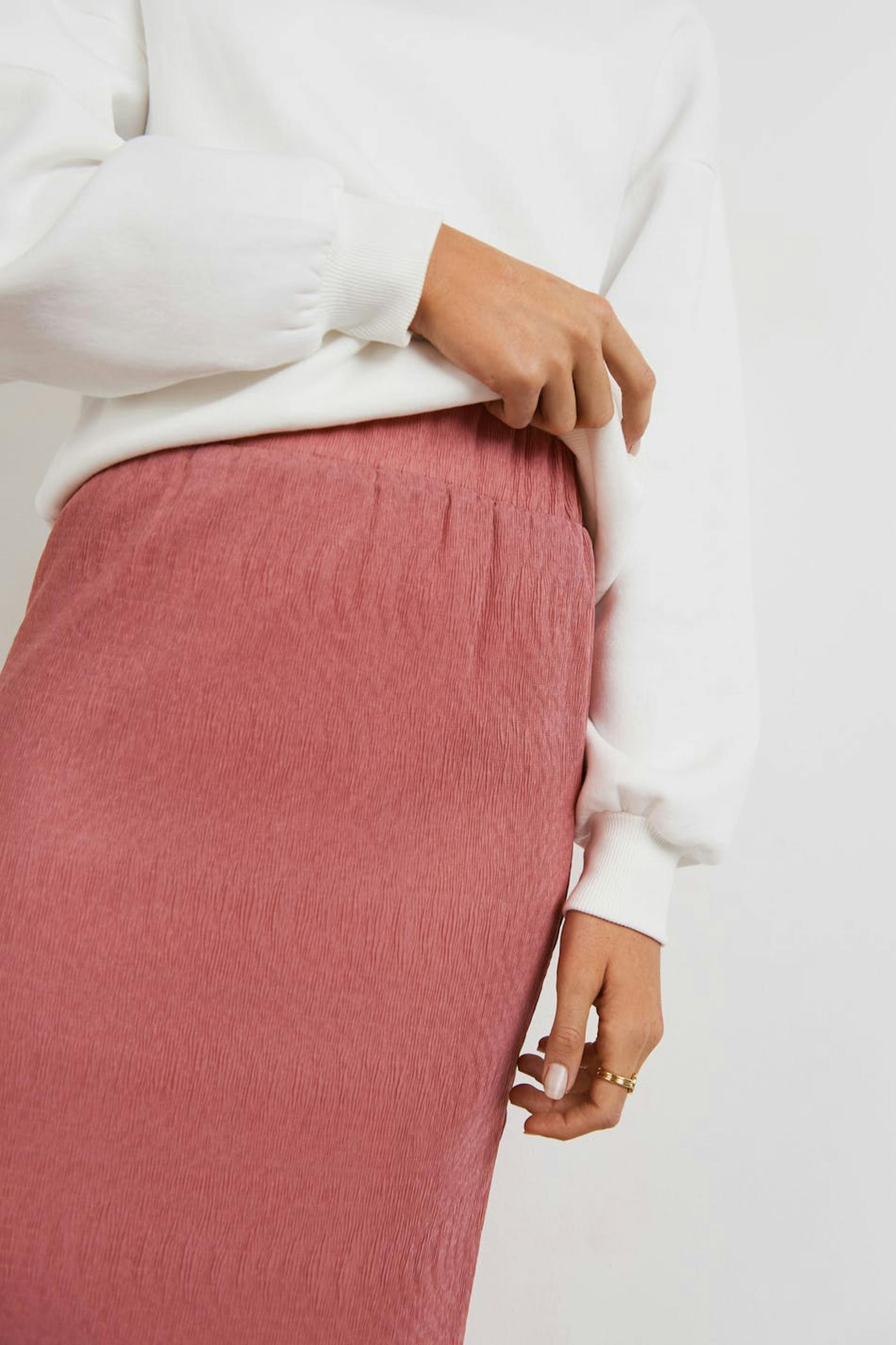 Skirt with a slim fit. The skirt is pink and has a lightly crinkled material in chiffon. It has an elastic band at the waist and small frills at the bottom hem.