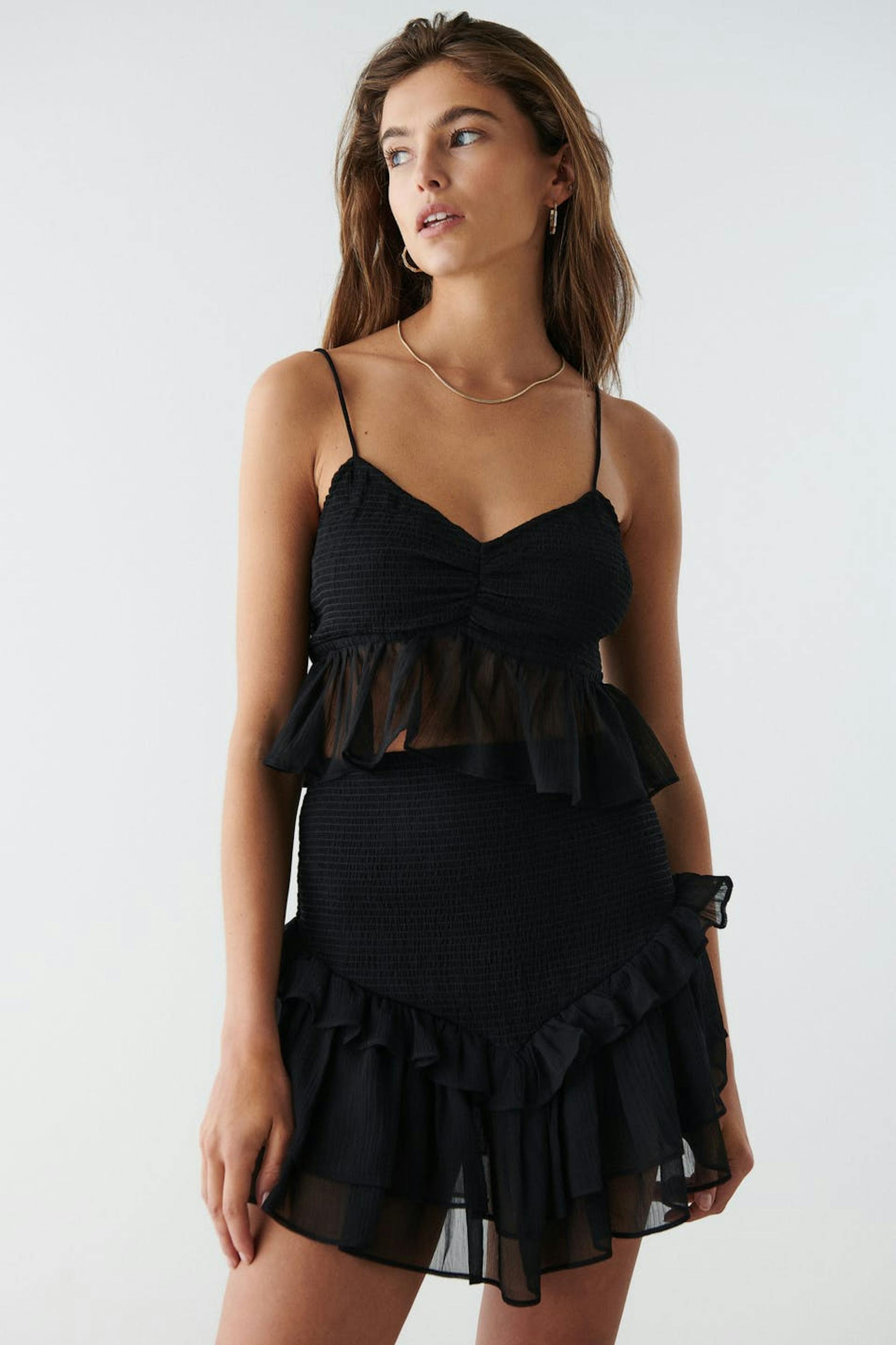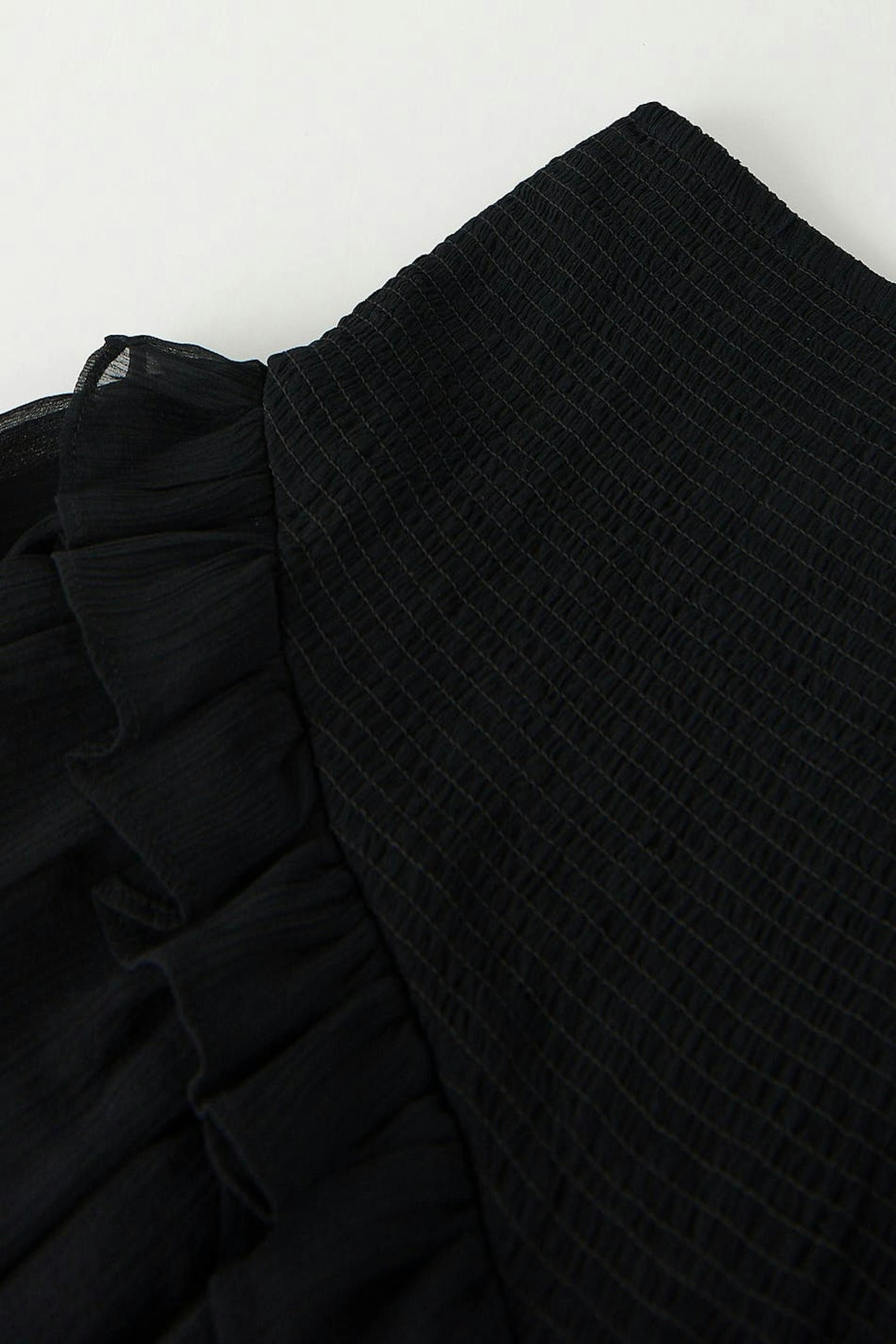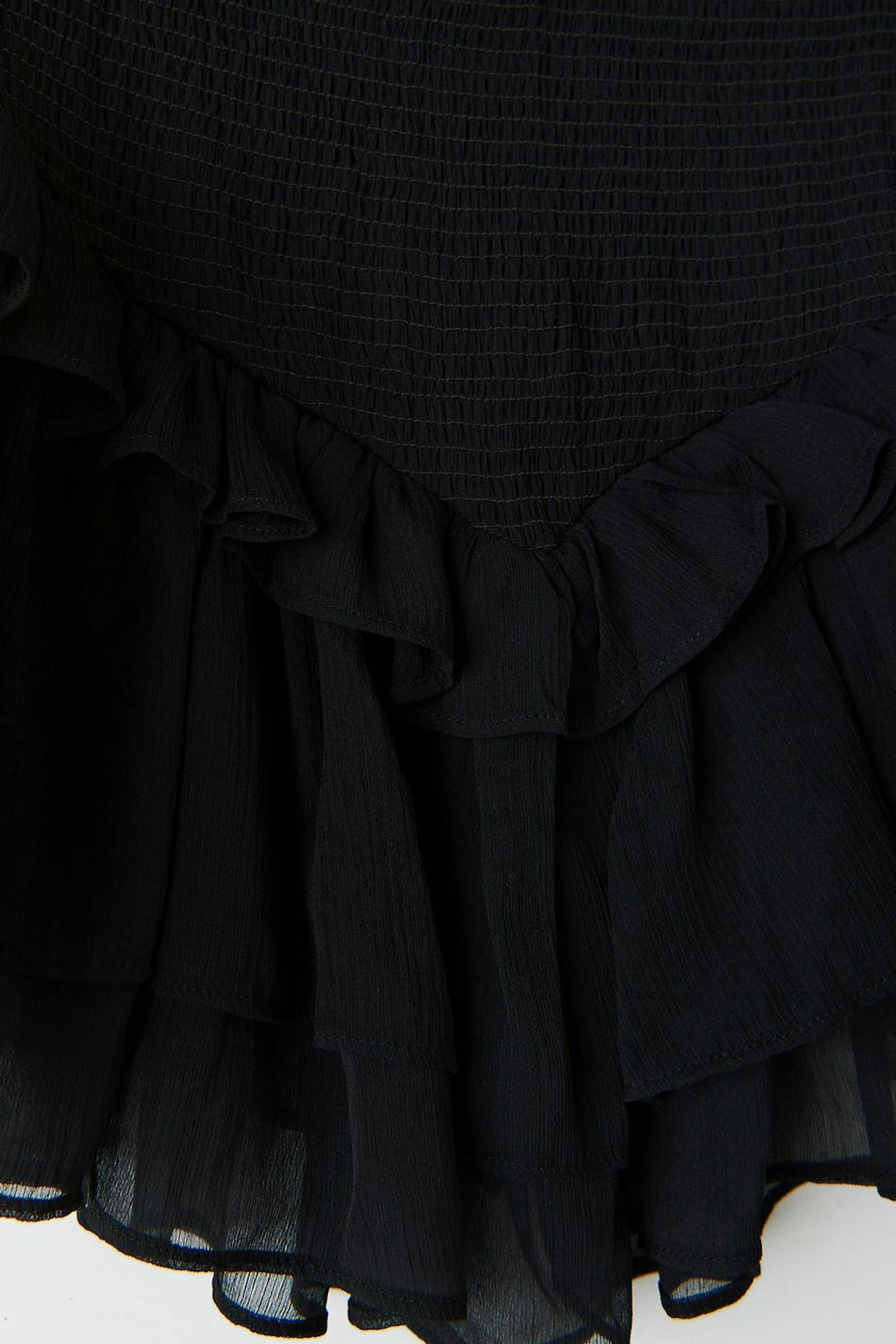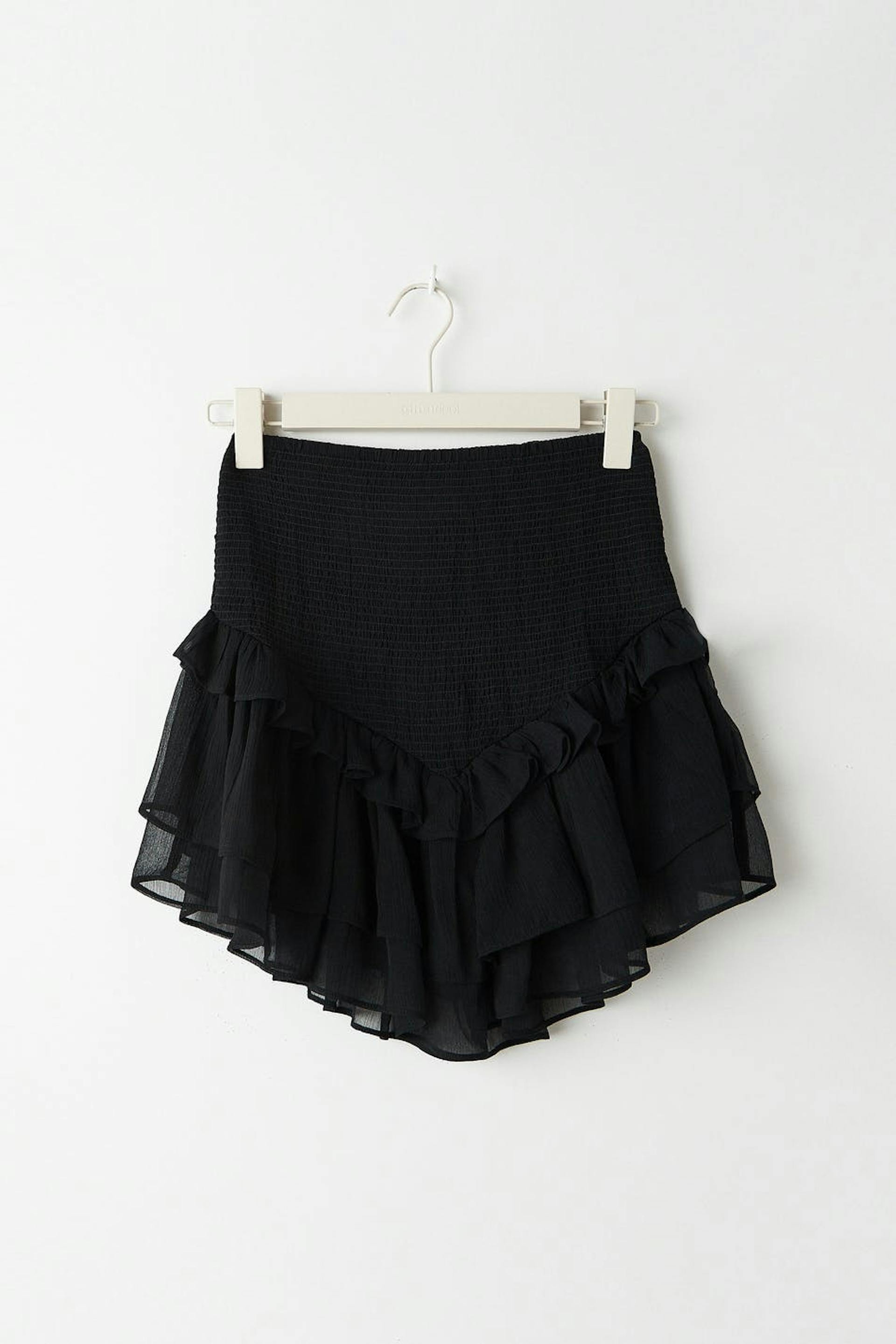 Short frill skirt in chiffon with smocking at the waist. The skirt is black and has frill layers at the bottom. It has a material in recycled polyester.