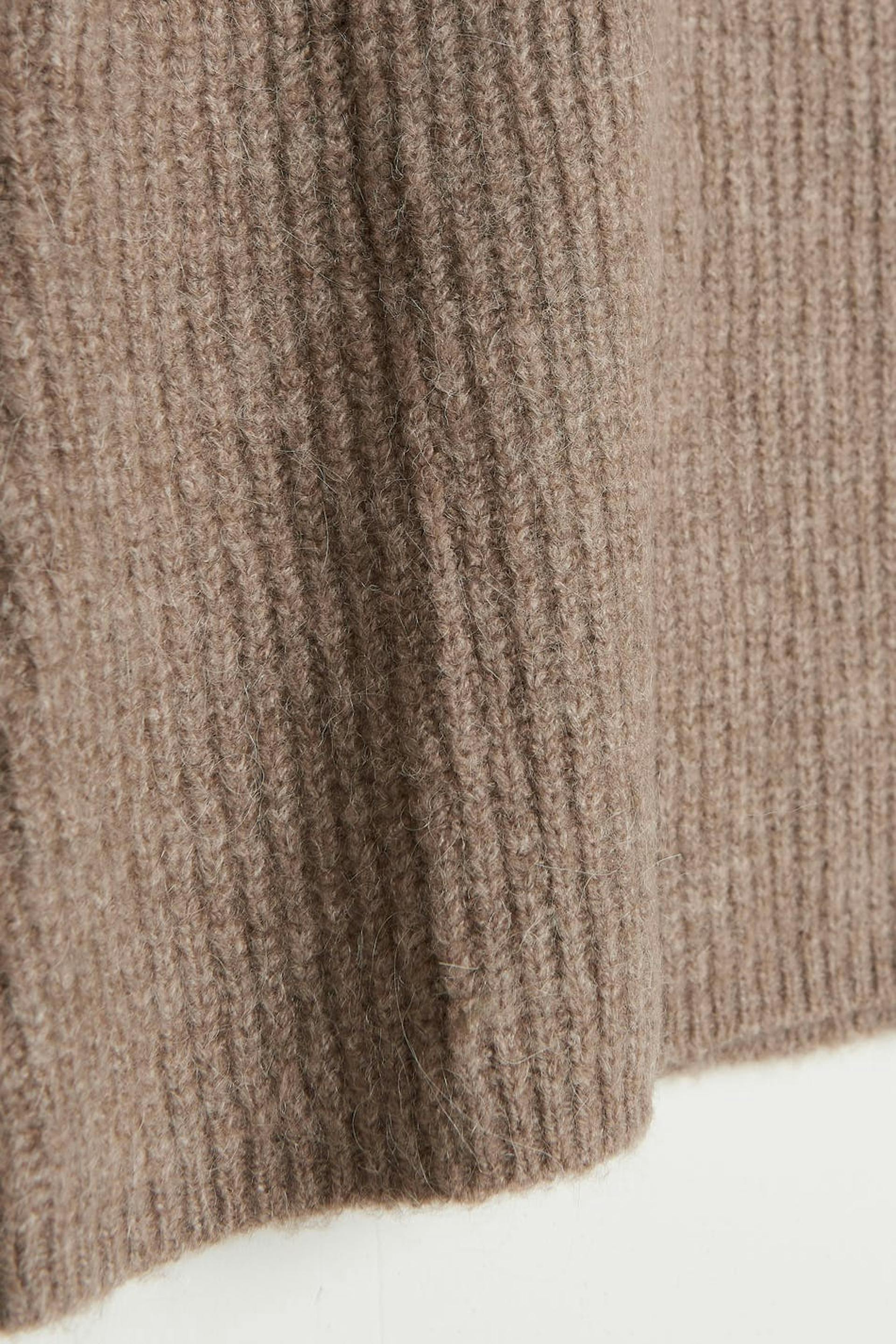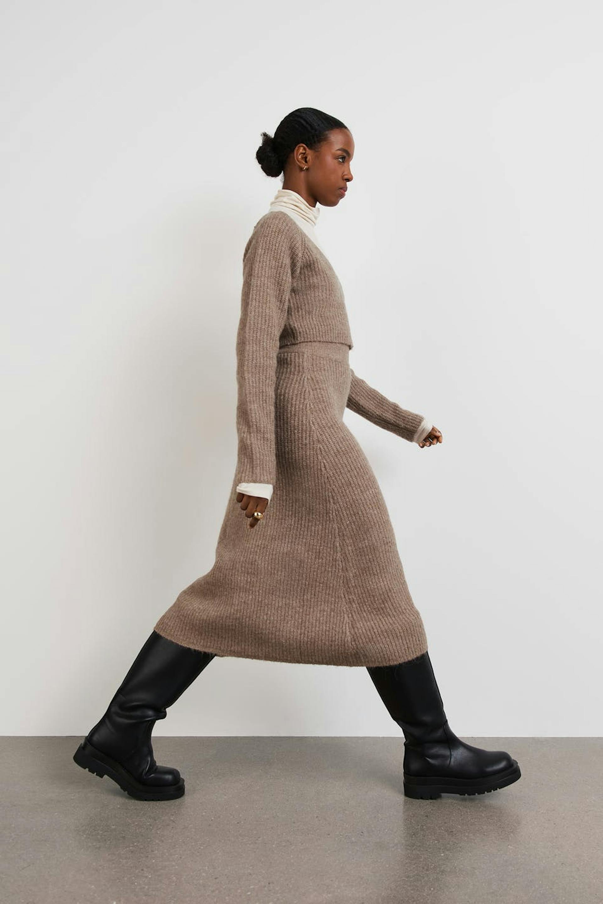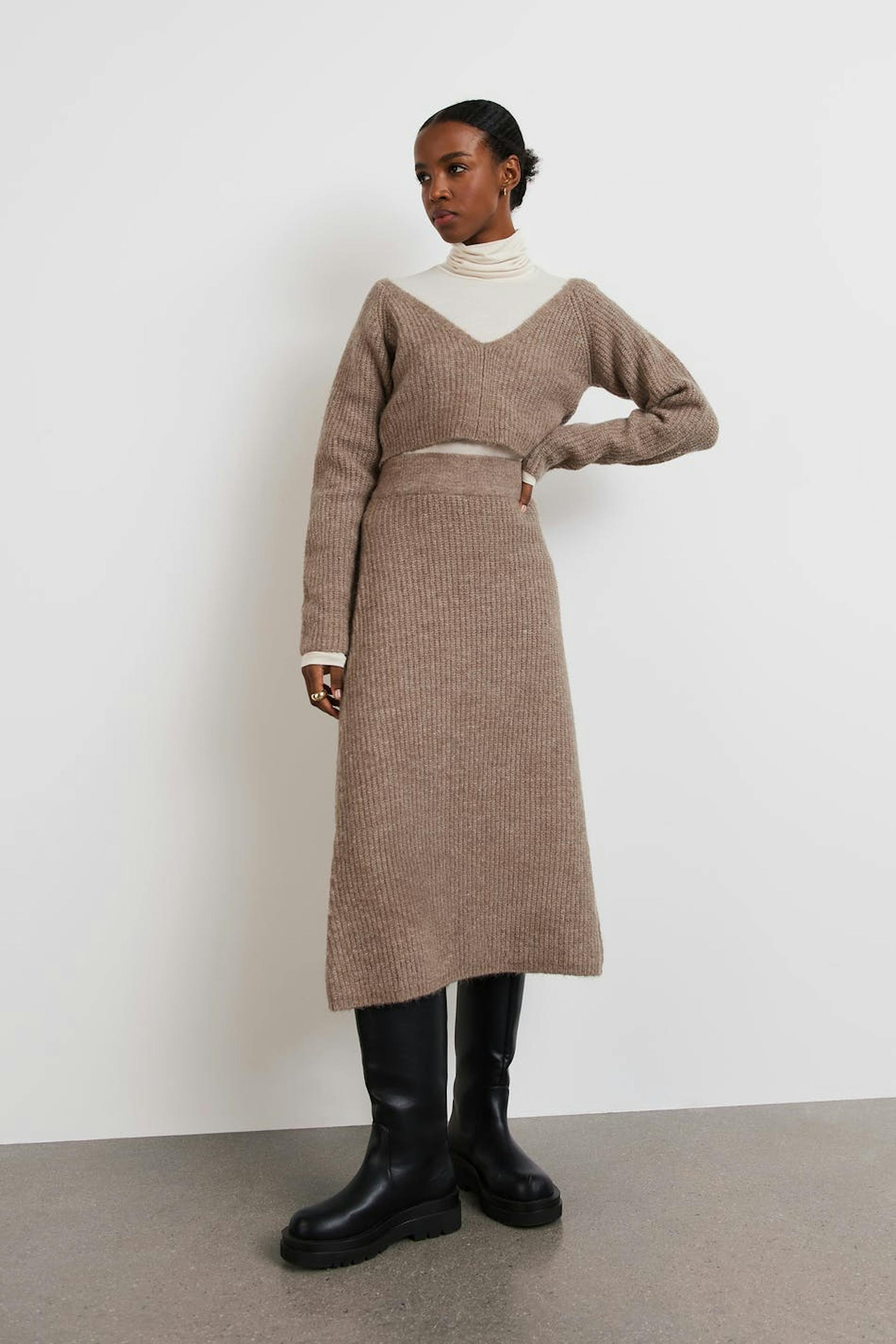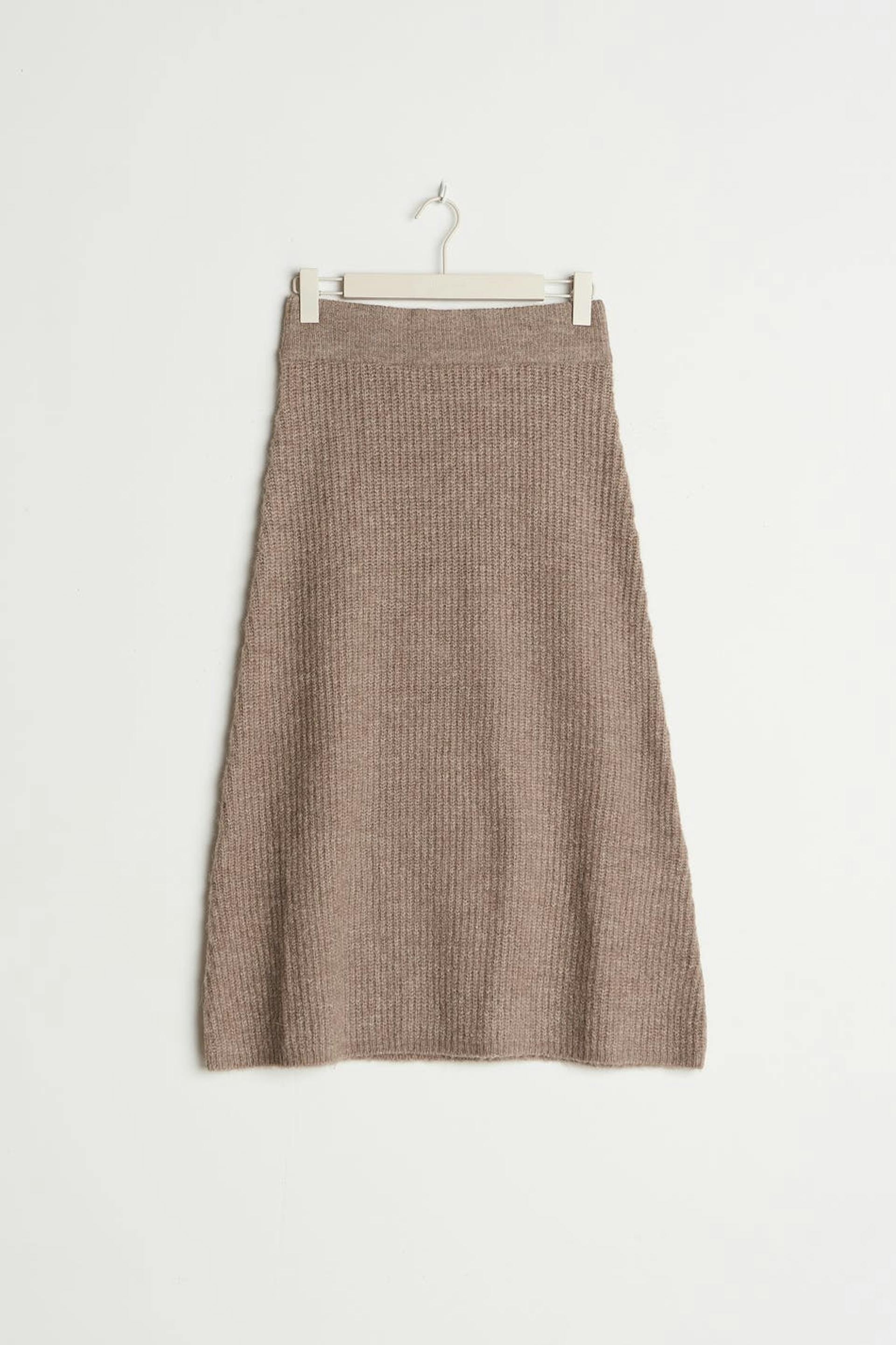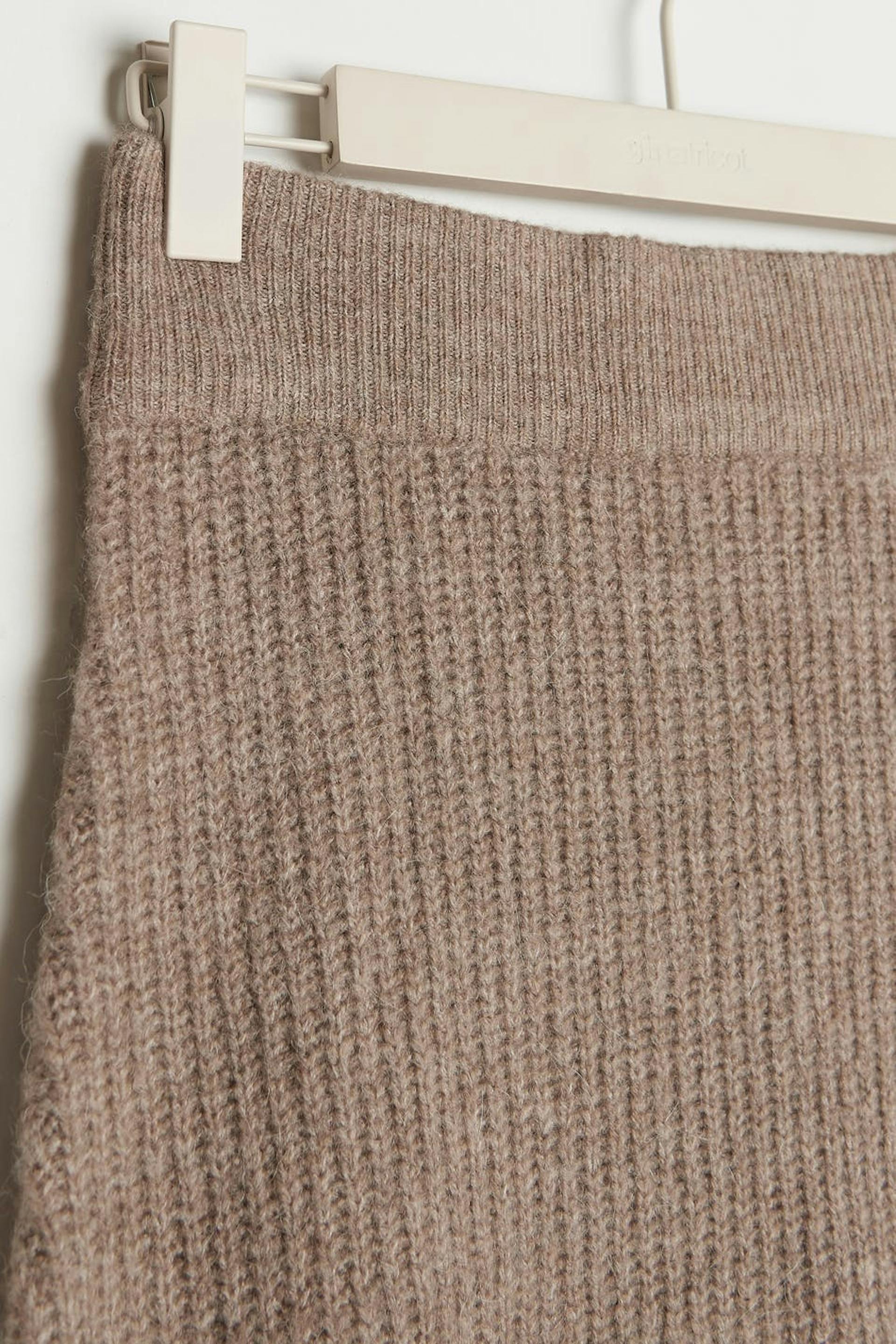Knitted midi skirt with bell bottoms. The skirt is beige. It is made of wool.