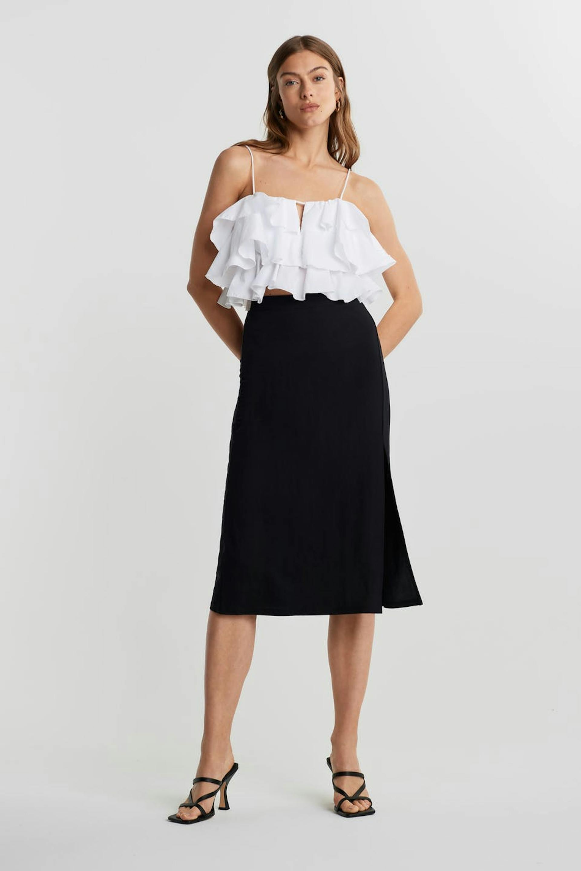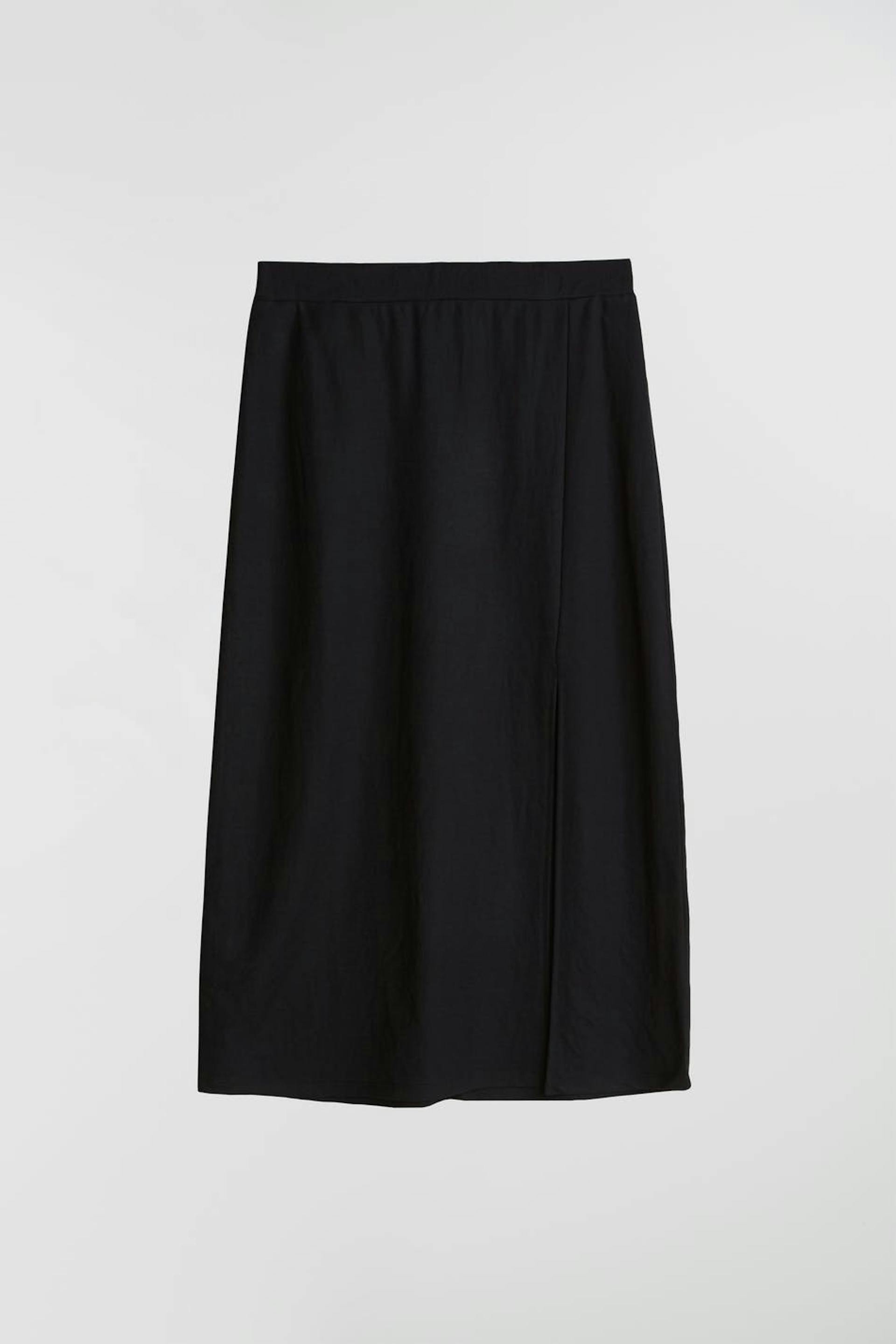 Straight skirt with a regular fit. The skirt is black and knee length and has a slit at the side. It is made of jersey.