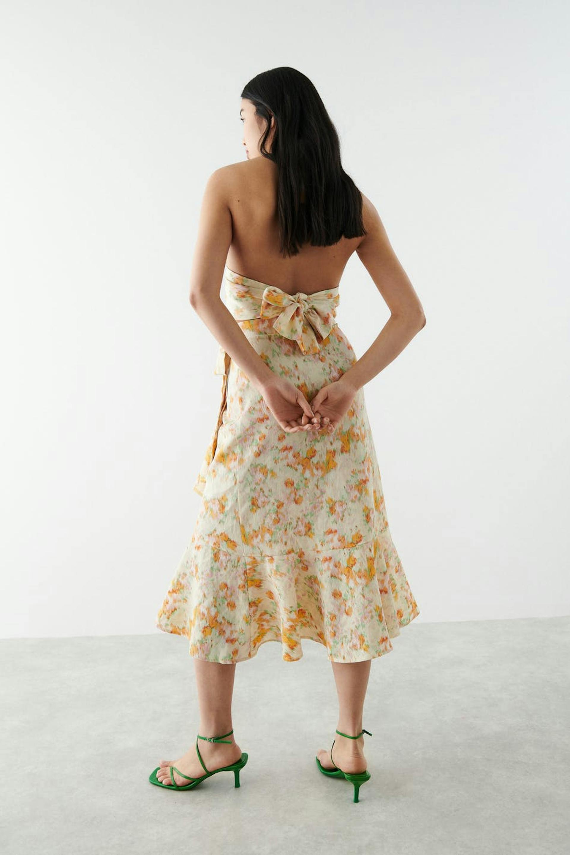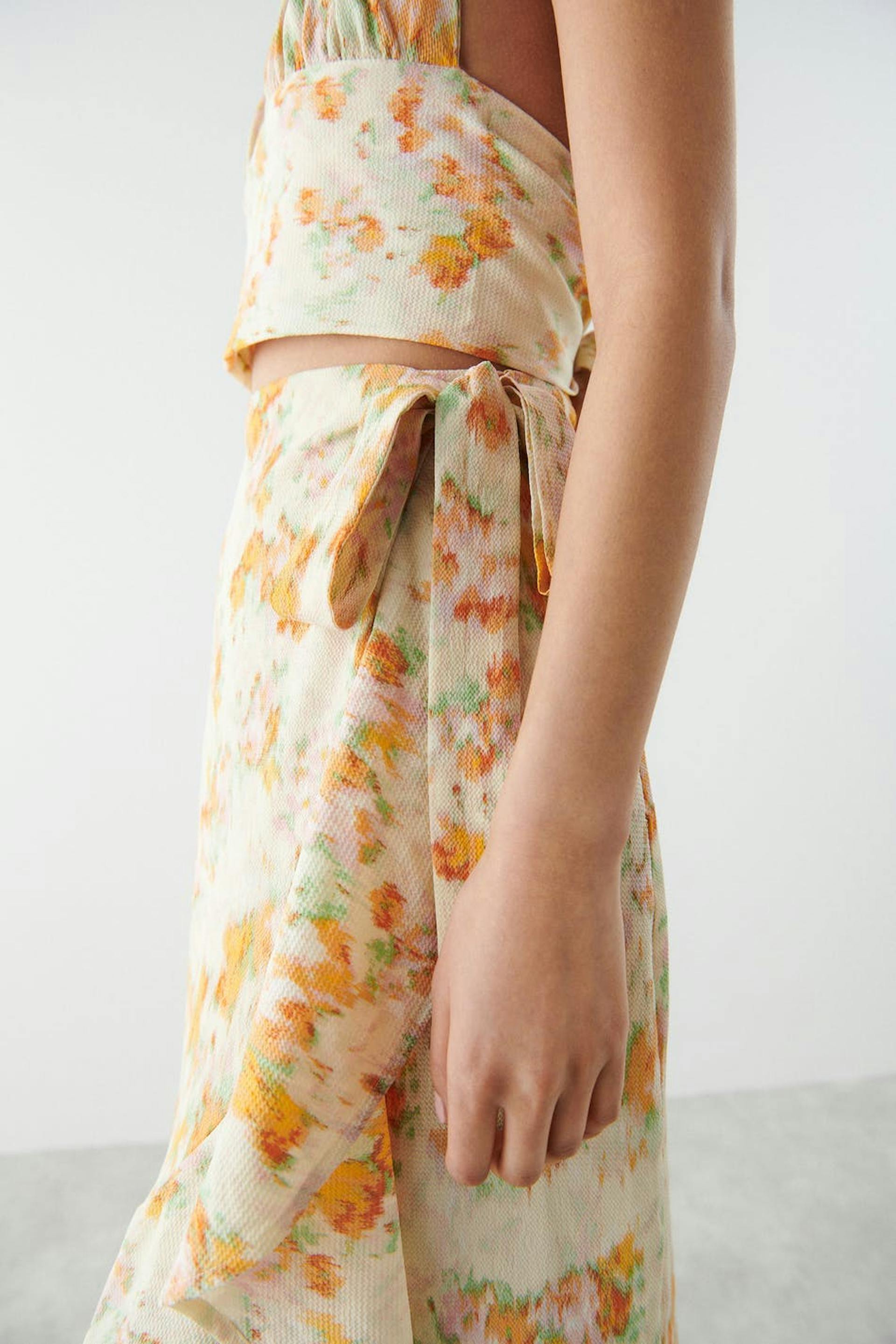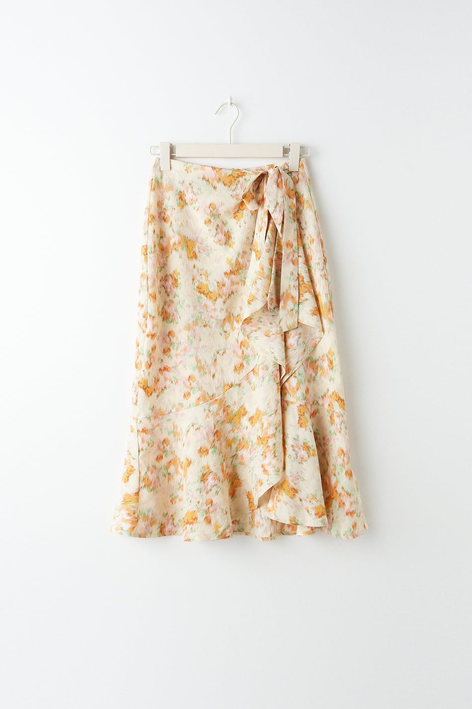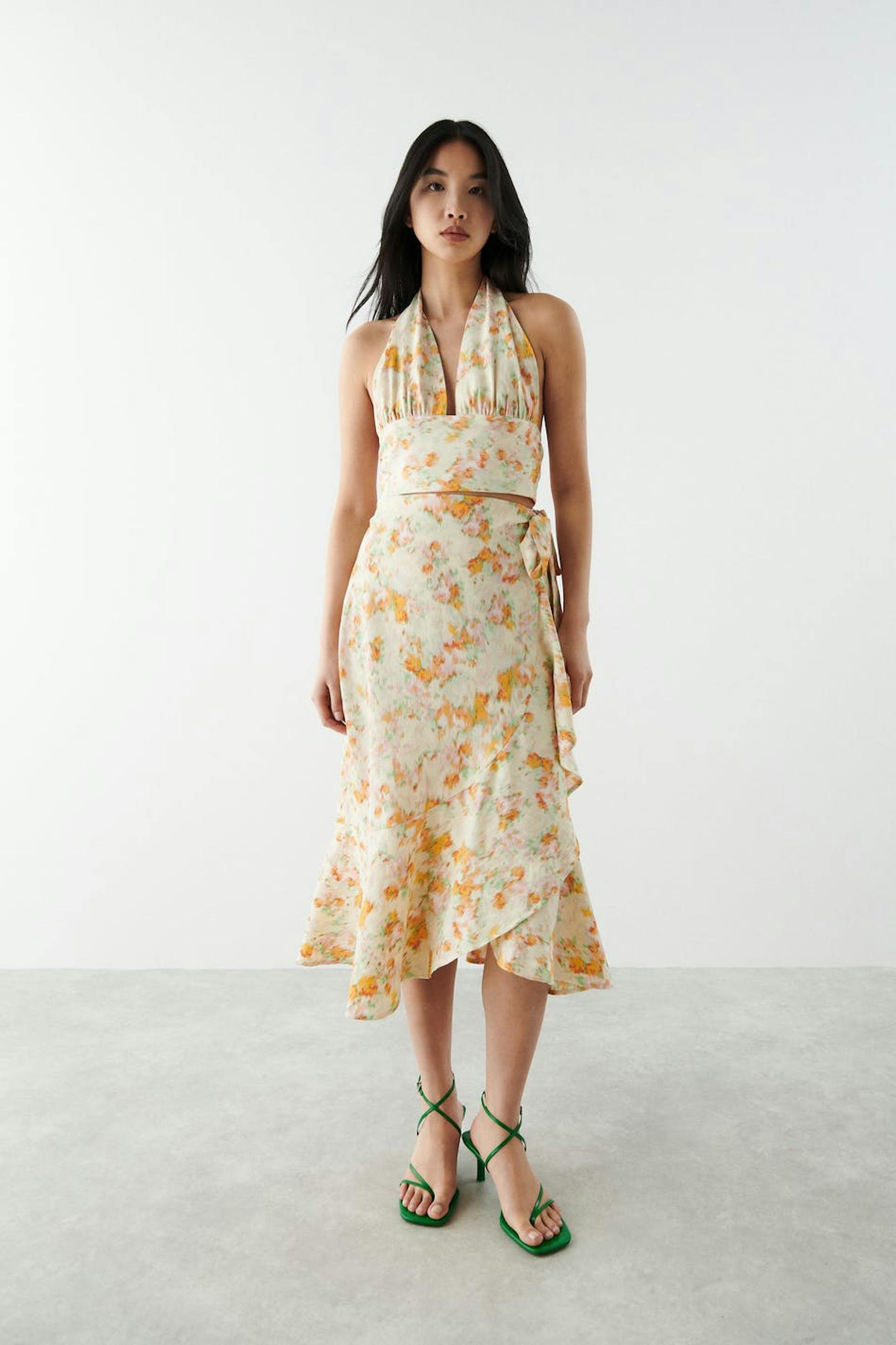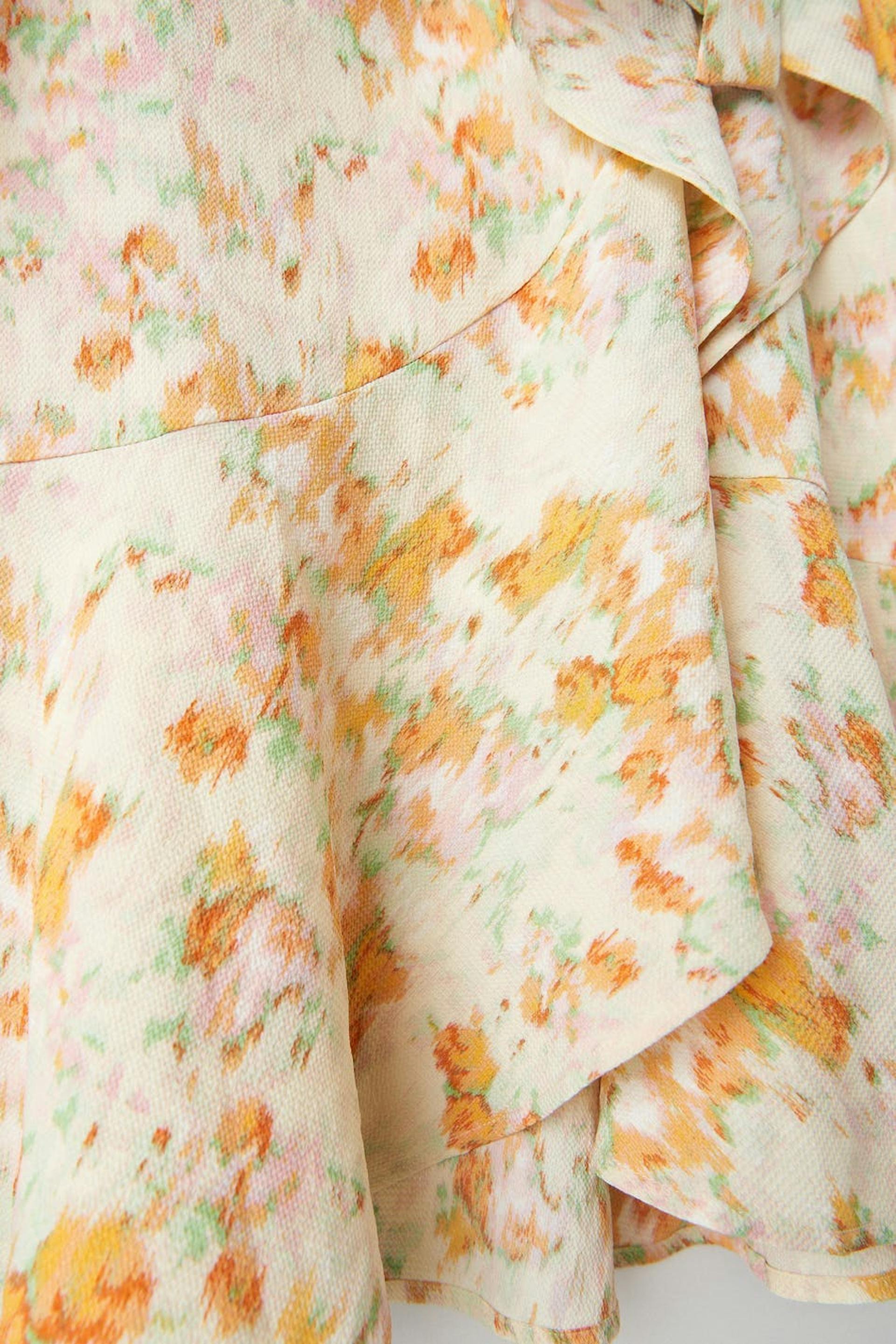 Floral wrap skirt with self-tie at the side. The skirt is perfect for the party and yellow and has frills at the hem. It has midi length and a satin-like material.